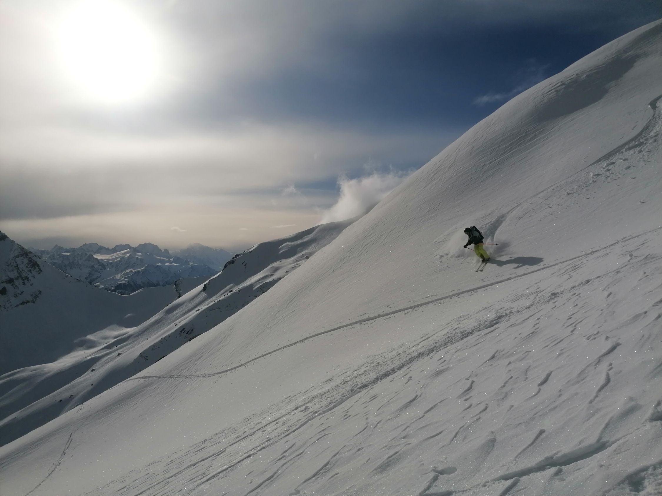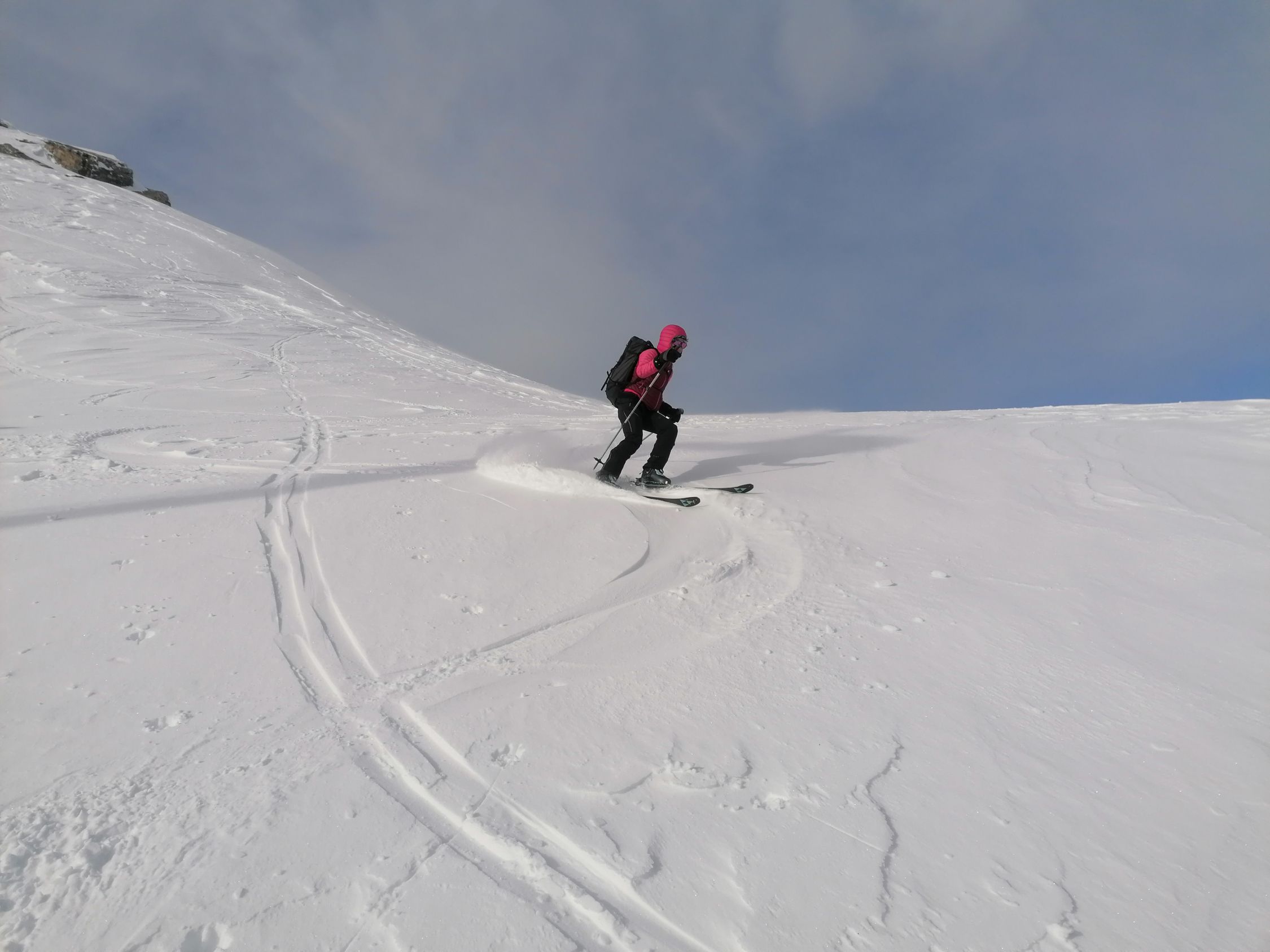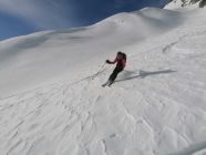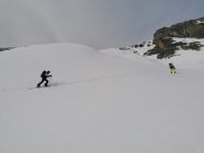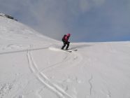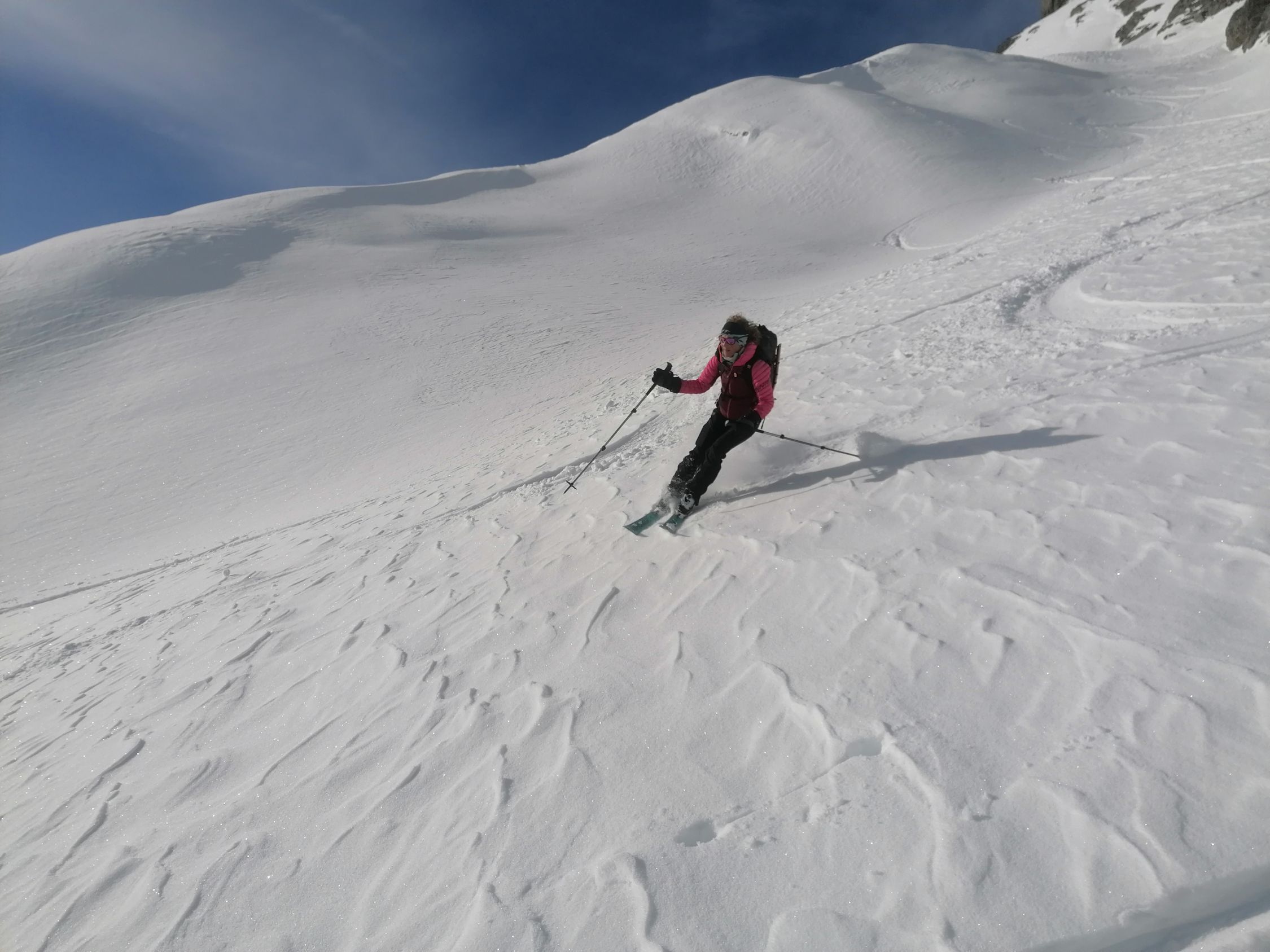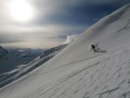 Bei der Abfahrt hatten wir blauen Himmel. Es hatte 20cm ausgezeichneten Pulverschnee. Wir waren alleine an diesem Traum Berg.