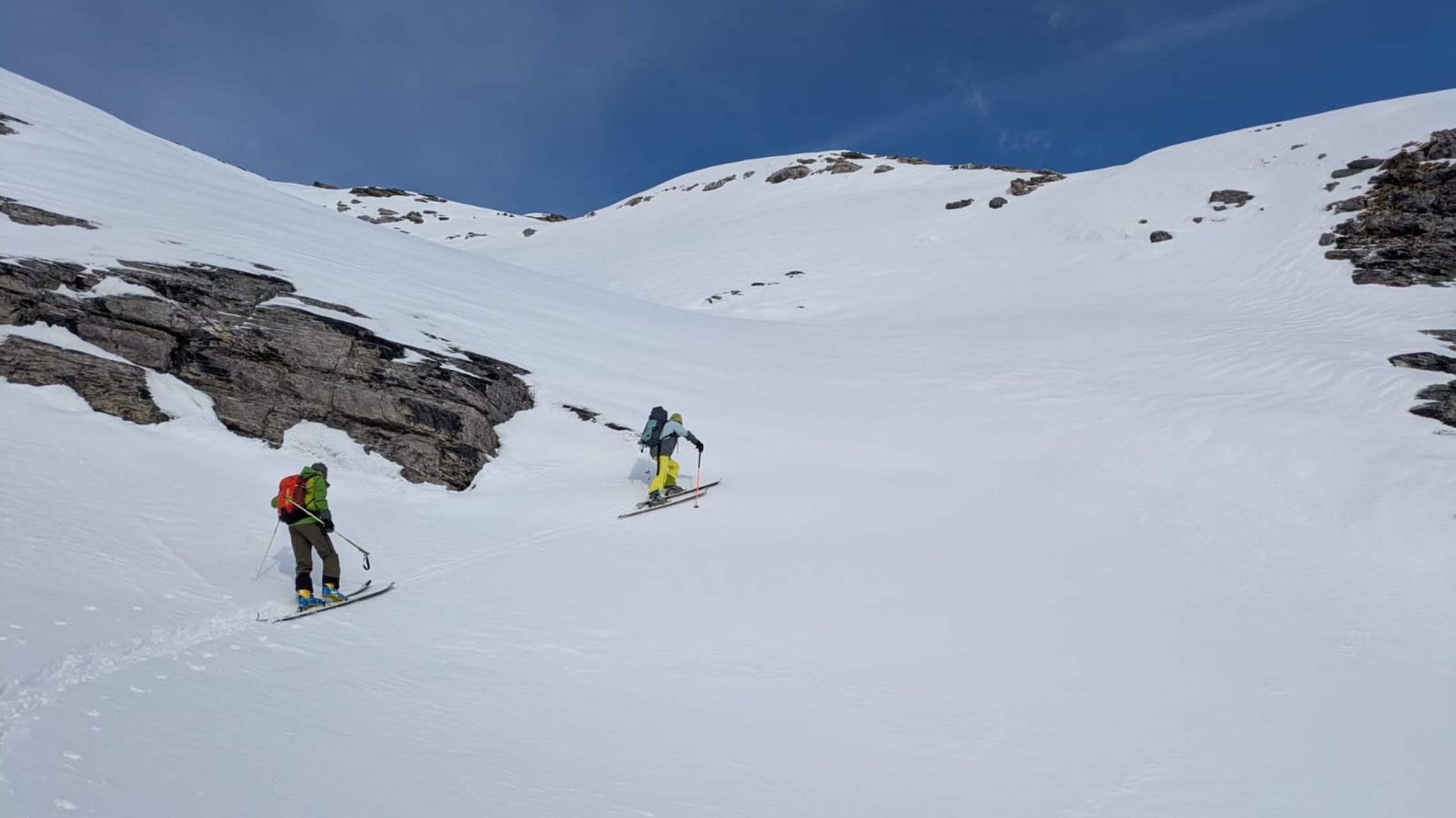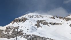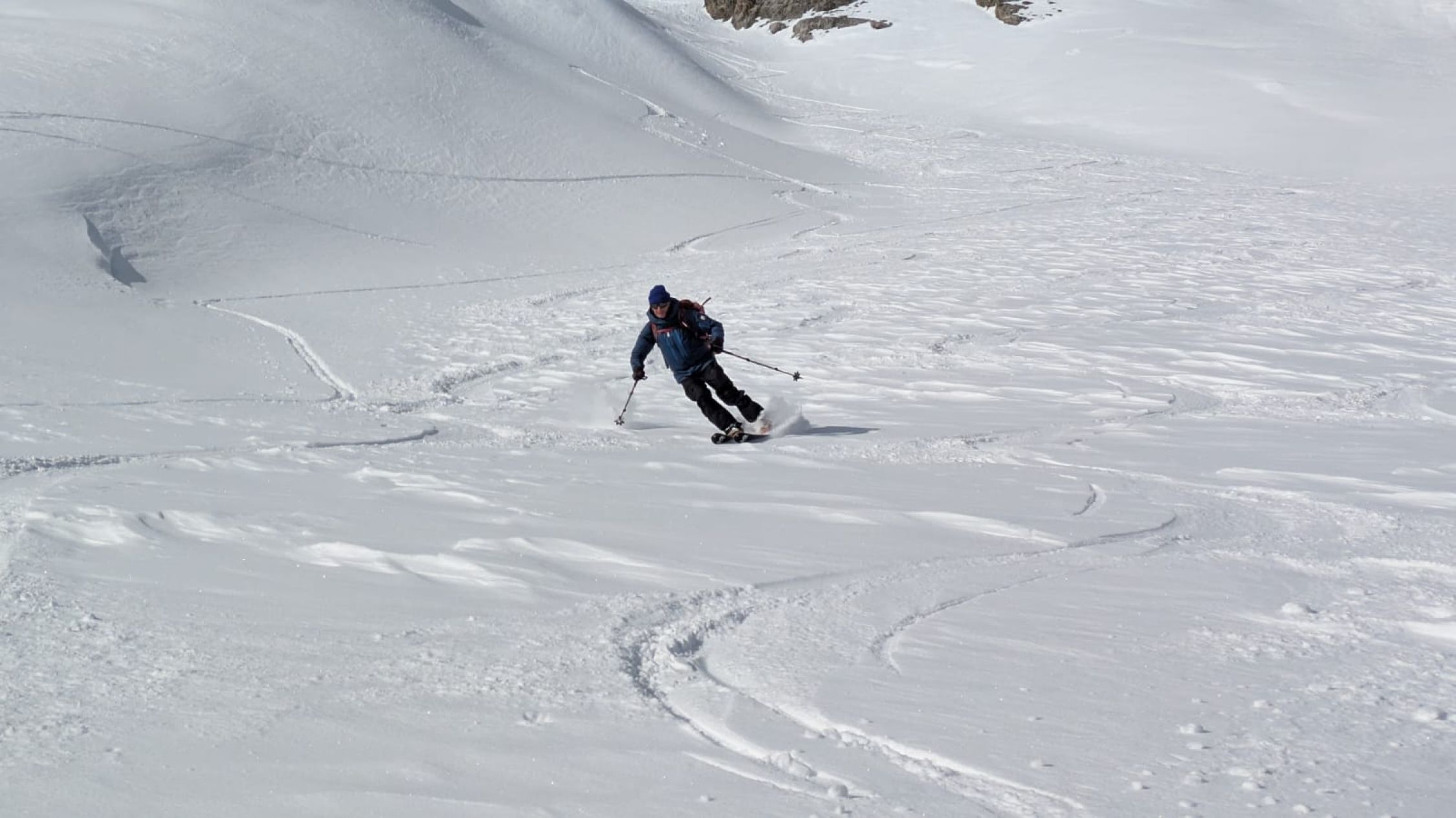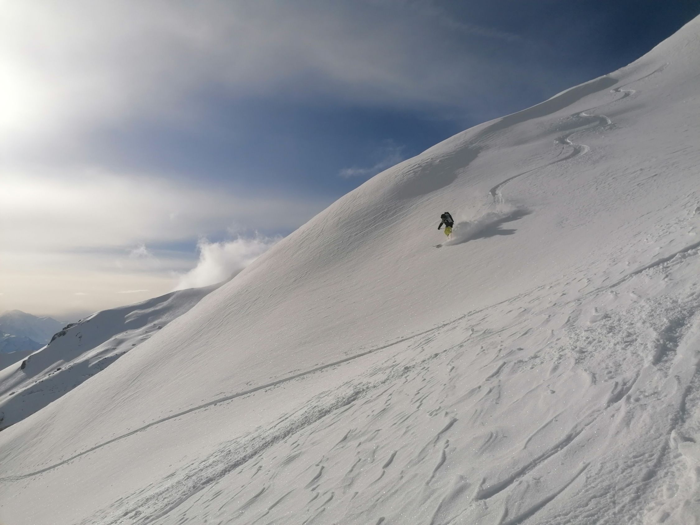 Bei der Abfahrt hatten wir blauen Himmel. Es hatte 20cm ausgezeichneten Pulverschnee. Wir waren alleine an diesem Traum Berg.