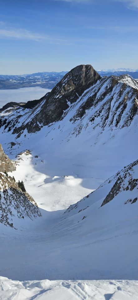 Angesichts der Schneelage erstaunlich gute Verhältnisse. 2. Ostcouloir war noch am besten fahrbar mit relativ weichem Schnee, 1. Ostcouloir war recht ruppig und die Nordabfahrt sehr gemischt. Insgesamt aber alles noch gut fahrbar und relativ freie Routenwahl bei der Abfahrt, d.h. kein Acker, der umfahren werden musste. Ab Bürglegrat die Skier getragen.