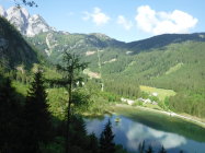Der Steig erscheint auf ersten Blick „unscheinbar“. Er befindet sich im AV-Klettergarten „Stausee Gosauschmied“. Er entpuppt sich jedoch als stellenweise „Schönblickfähig“ zum Stausee hinab und nach Hintertal. Er bietet Spaß machende Wandquerungen, die nicht viel Kraft kosten, wenn sie trocken sind. Der obere Abschnitt ist luftiger. Die 2-Seilbrücke ein Schmankerl. Warum der Errichter für die sportliche Einstiegsvariante jedoch nur ein dünneres Sicherungsseil verlegte, bleibt mir allerdings ein Rätsel.