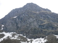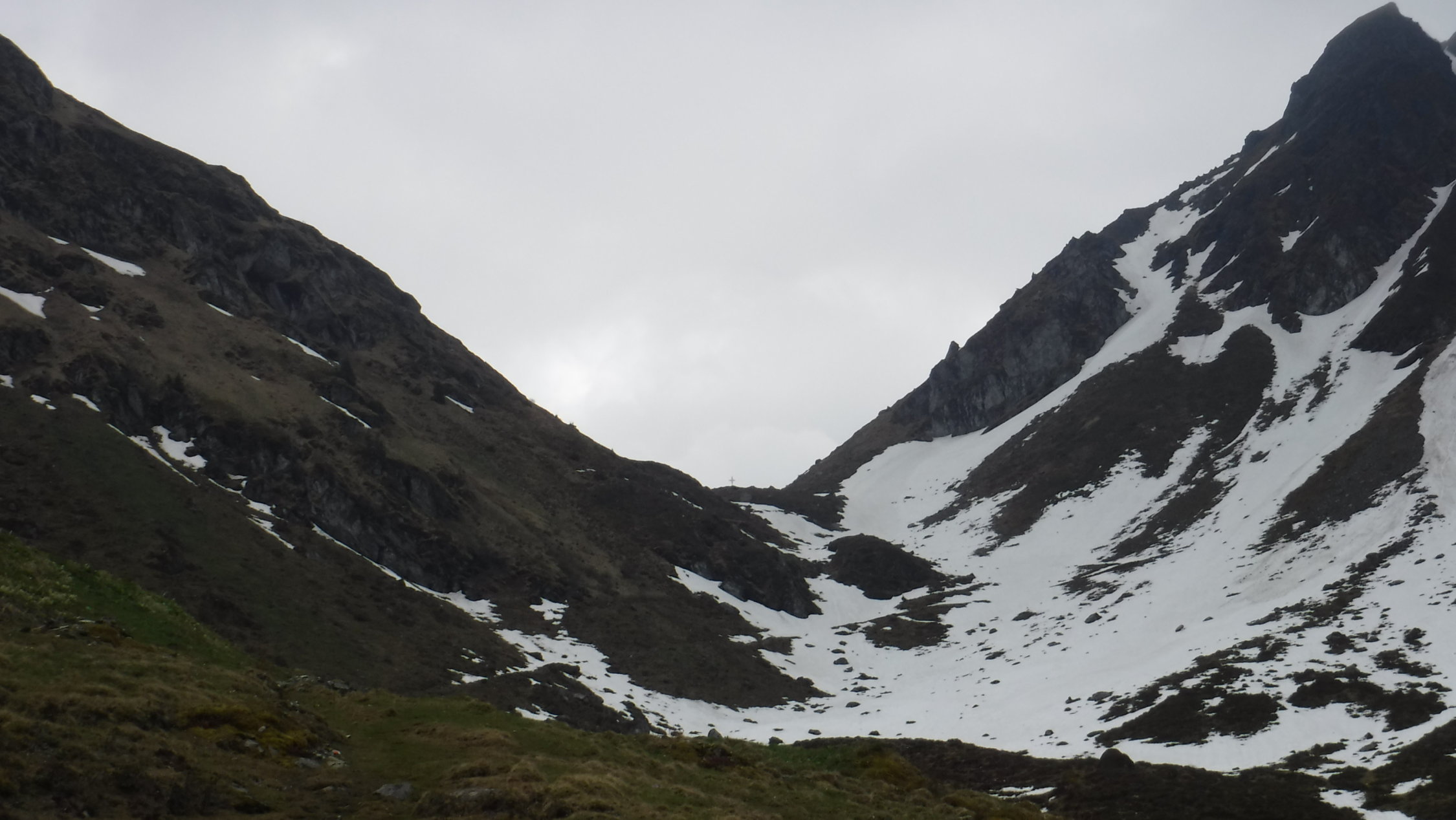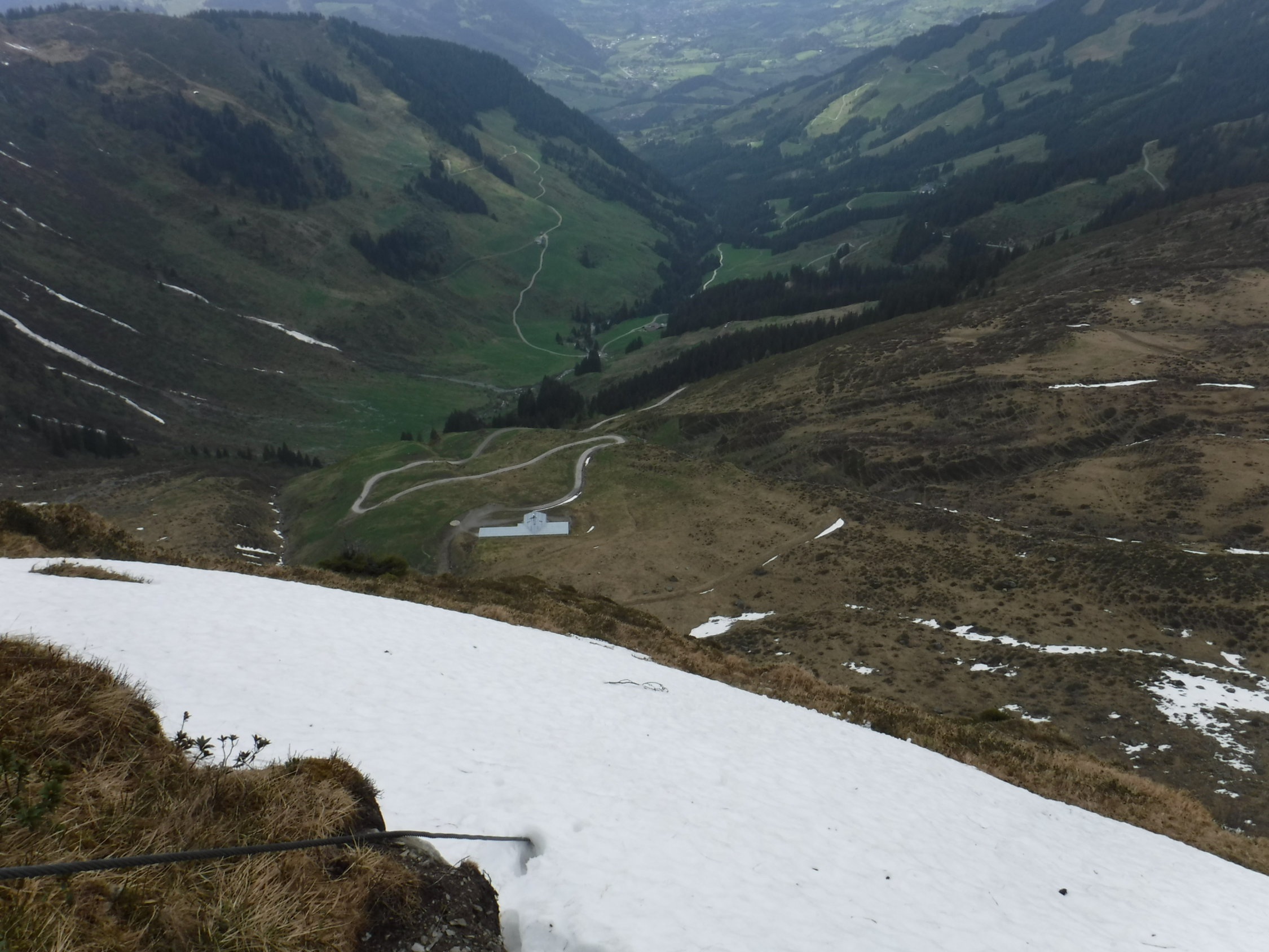 Das Gamsband mit seinem Sicherungsseil darüber liegt noch vom Schnee begraben. Ließ sich aber seilfrei überlaufen (gute Trittschneeverhältnisse). Im Tor ist noch alles verschneit, der Torsee noch zugefroren.