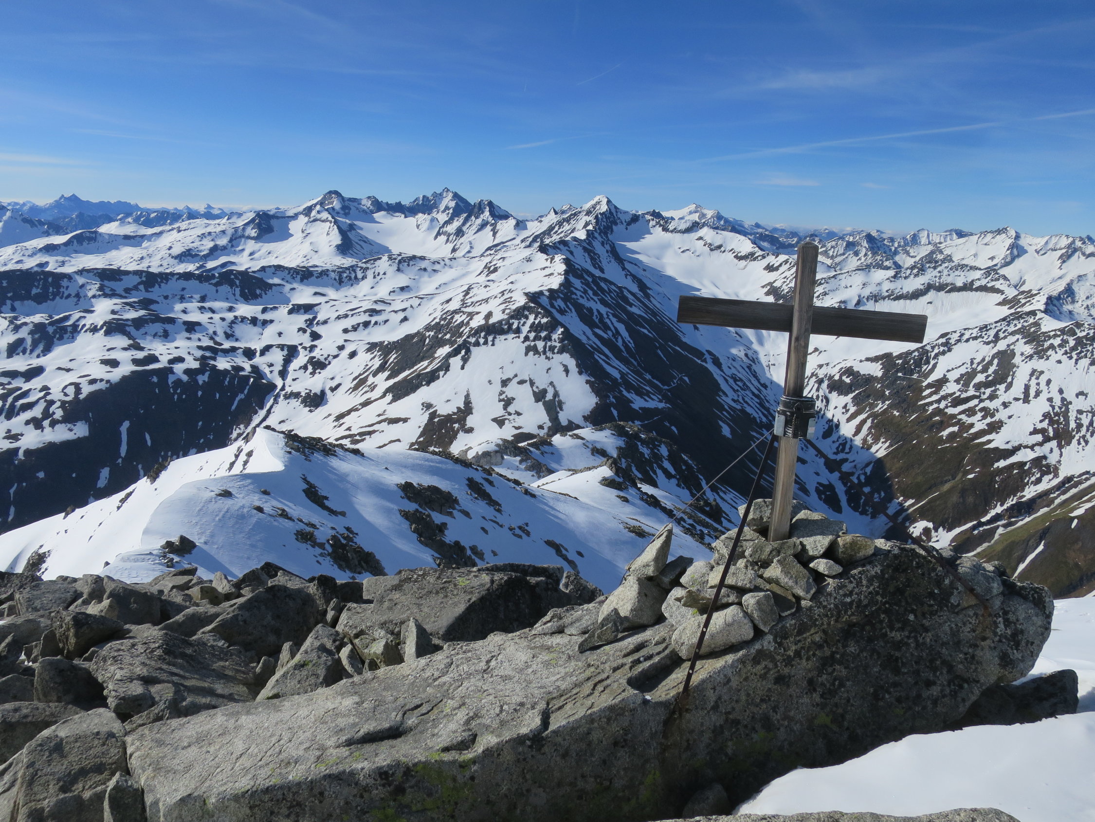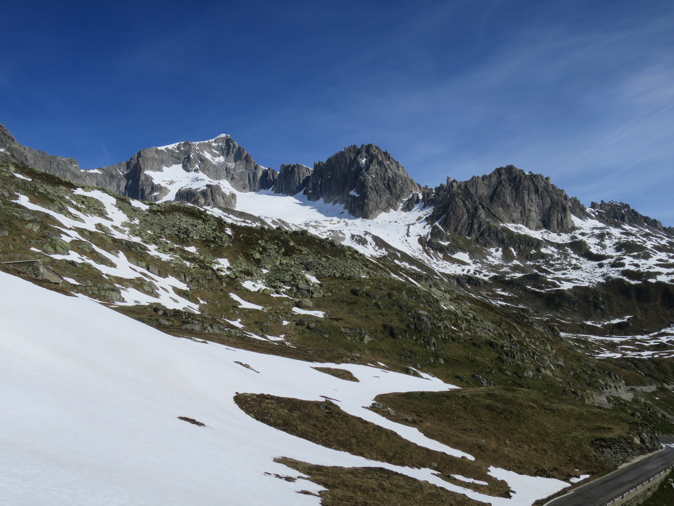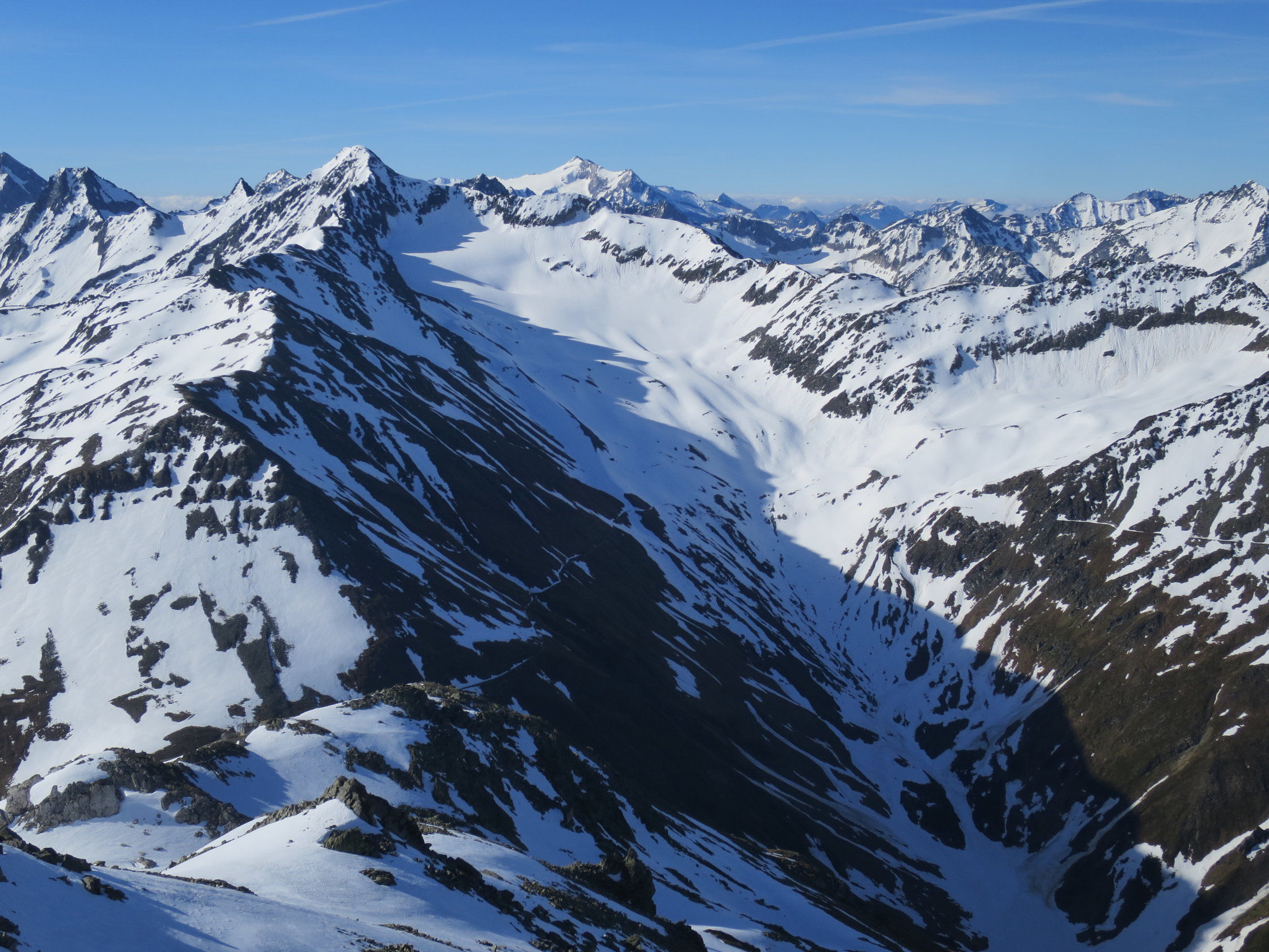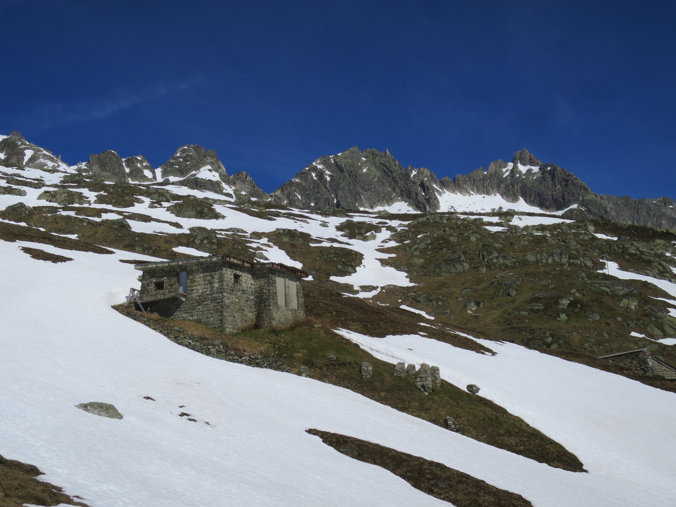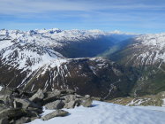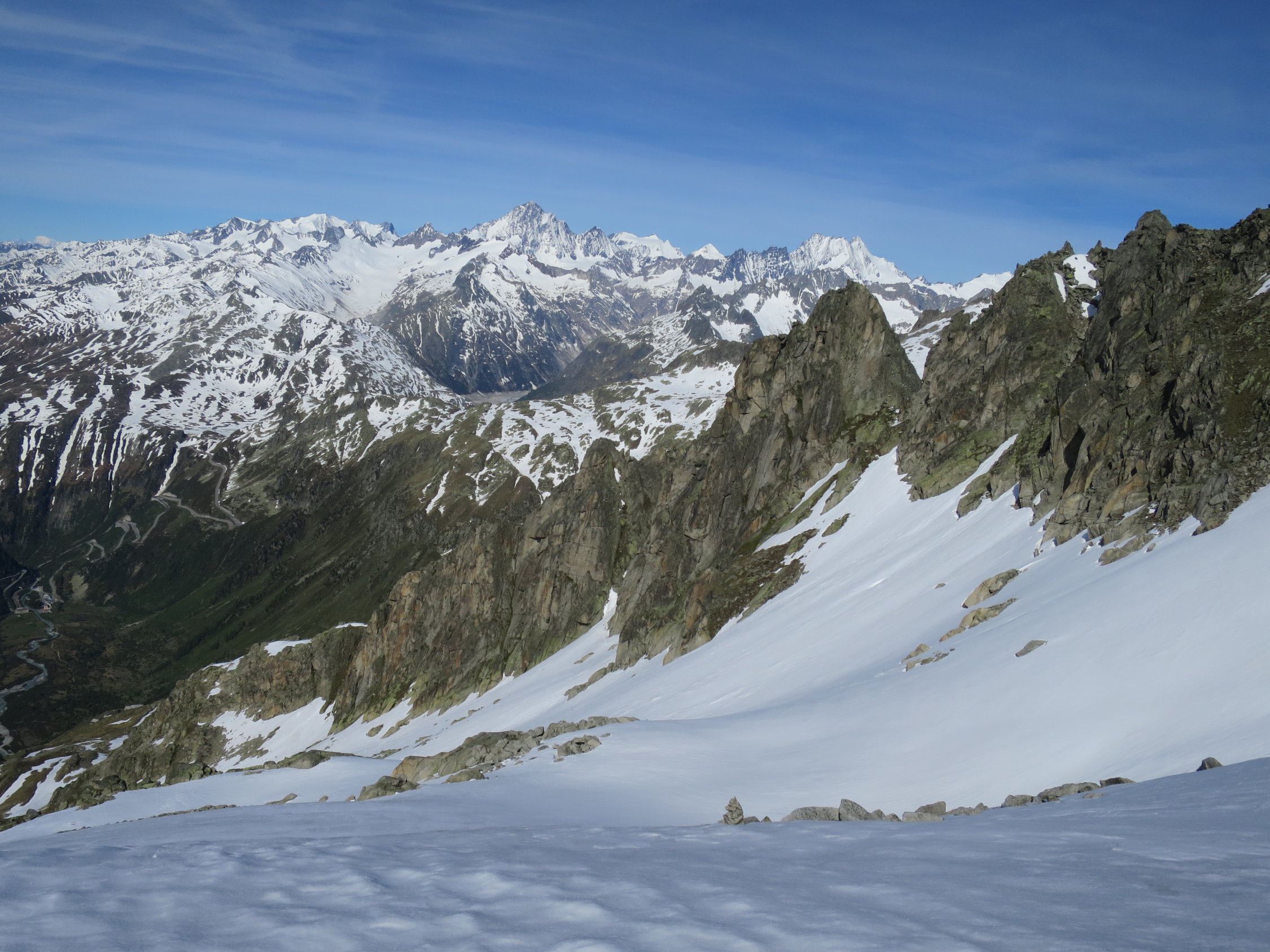 Start zur letzten Tour dieser Saison um 06.45 Uhr bei +2°C. von der Furka Passhöhe aus. Auf der klassischen Route mussten die Skis kurz vor dem Grat, der sich von Sidelenbach heraufzieht, abgeschnallt werden. Weiter auf einer geschlossenen, tragender Schneedecke bis zum Gipfel des Klein Furkahorns. Am Gipfel zwei Skibergsteiger getroffen die von Sidelenbach aufgestiegen sind. (Man kennt sich) Gewaltige Fernsicht am Gipfel im Süden ein paar Schleierwolken. Mit dem Down Hill bis 09.00 gewartet damit der gefrorene Schnee aufsulzen konnte. Das bisschen Geduld lohnte sich, in den oberen steilen Hängen Sulzschnee "al dente" ohne Regenrillen oder Büsserschnee. Vom Südostgrat ziemlich in der "Direttissima" bis zur Passstrasse abgefahren alles noch im grünen Bereich! Nach der kurzen aber knackigen Tour bei Hansruedi und Madeleine in Tiefenbach für Kaffee und Nussgipfel eingekehrt, immer ein lohnenswerter Stopp.