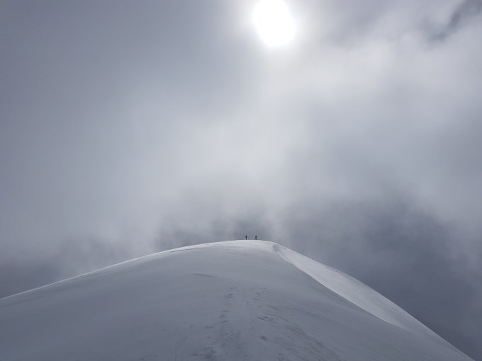 Start der Tour am 6.00 Uhr beim Umpol, das Wetter nicht so toll, nach 10 Minuten konnten die Ski montiert werden, bei 2400 M. eine Blanke Stelle, aber heute noch gut zum hochsteigen mit den Ski, bei 2800 M. dichter Nebel mit einer giftigen Bise hinauf zum Gwächtenhorn, nach einer kurzen Pause wurde das Wetter langsam besser,
