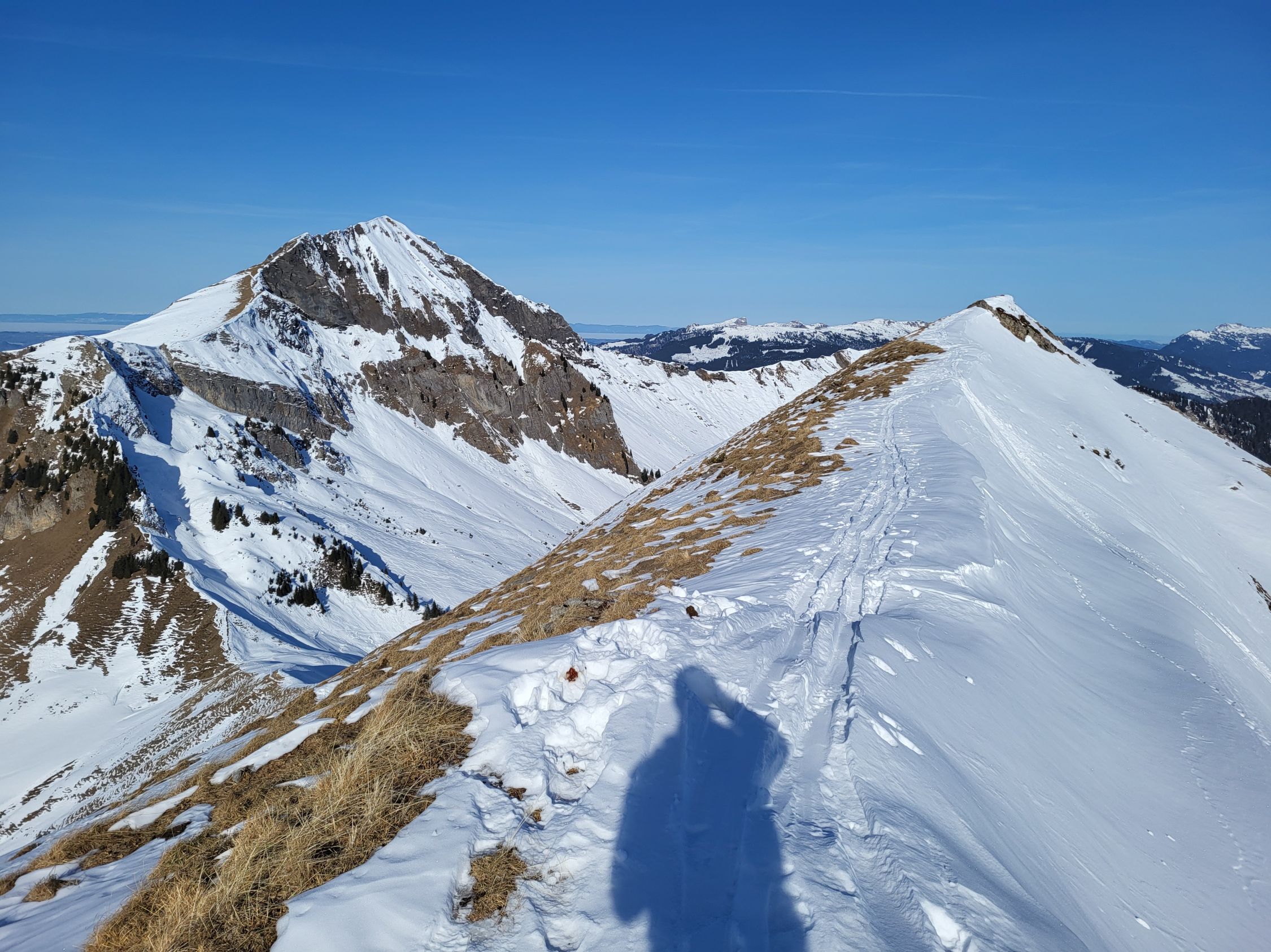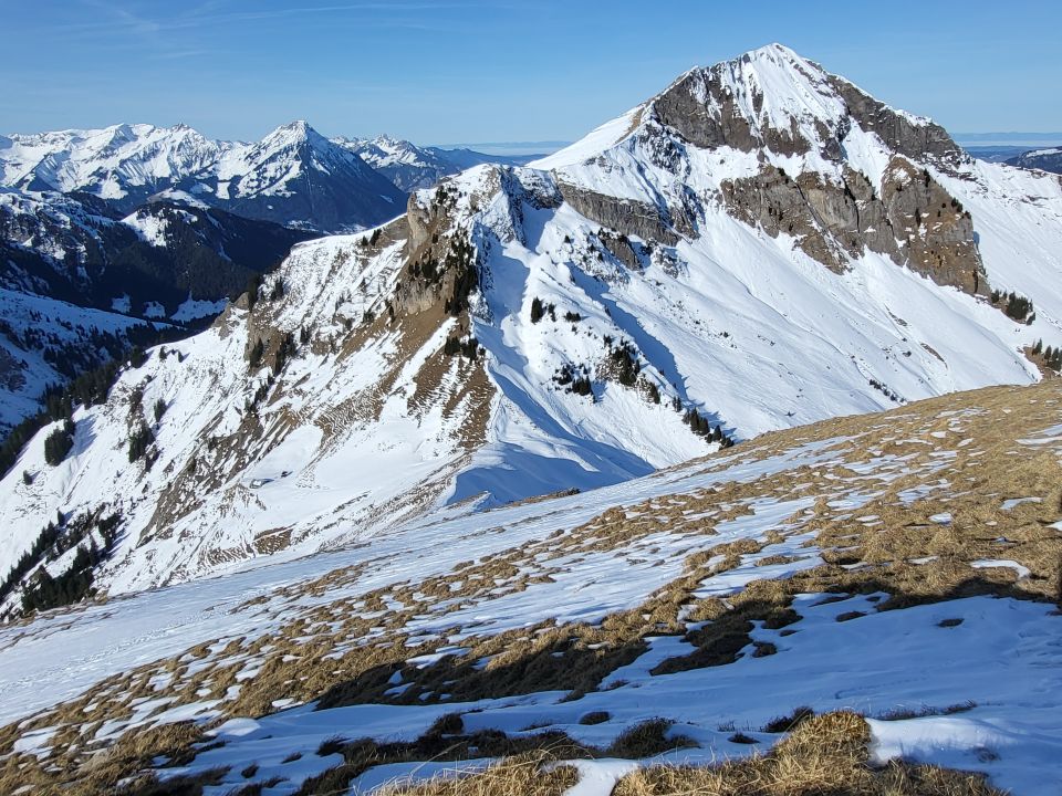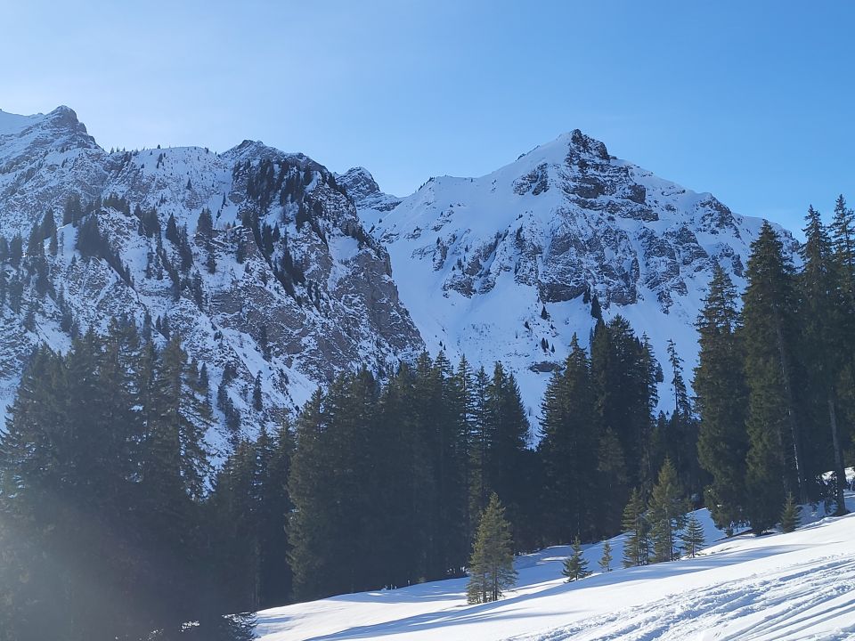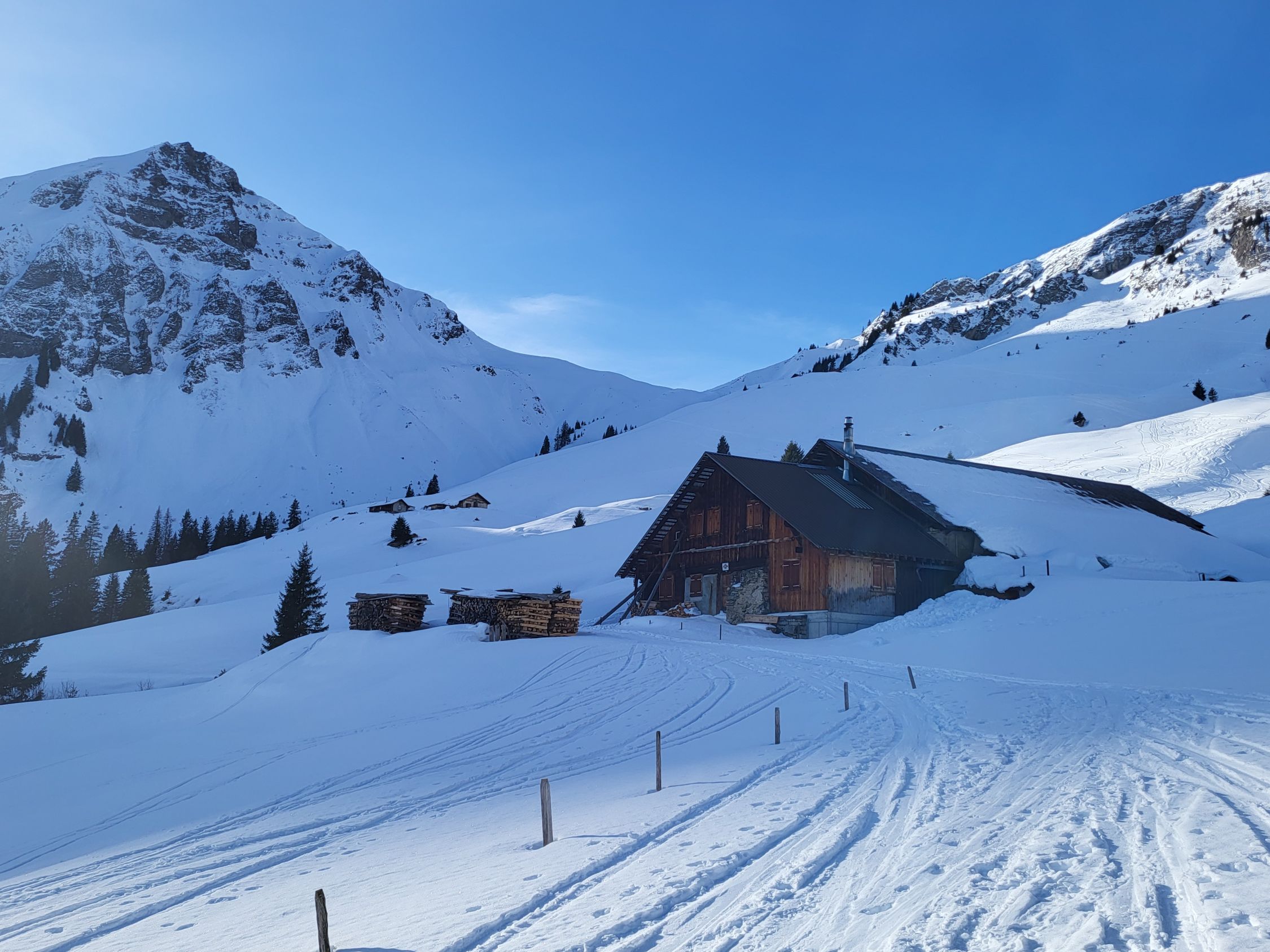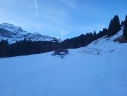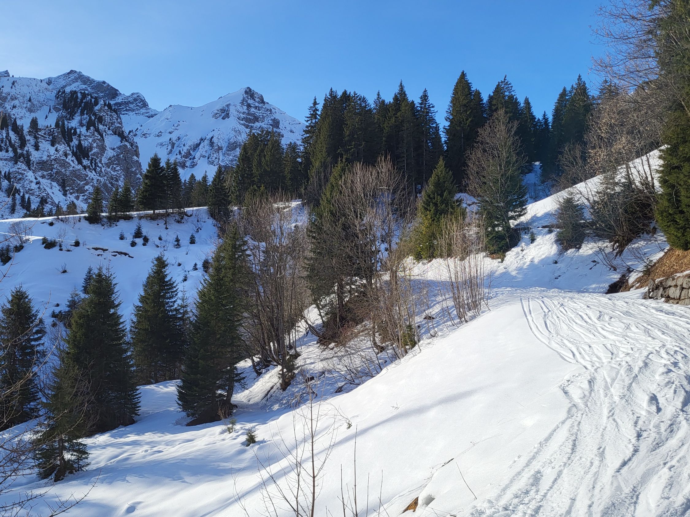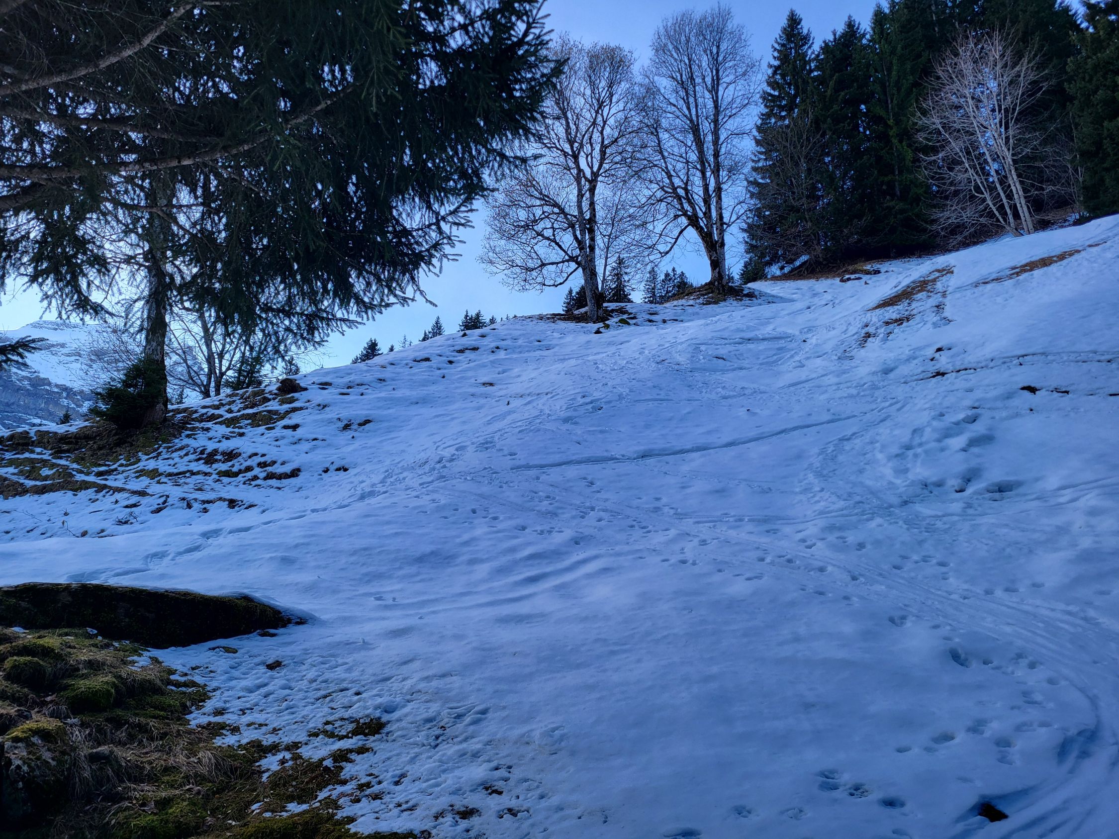 Ab Skipintli Saxeten hat es genug Schnee für den Aufstieg. Nur im Pfang wird es knapp, dort kann man zu Fuss auf dem Wanderweg rauf, wenn der Schnee weiter schmilzt. Ich bin im oberen Teil dieses Hangs auch kurz zu Fuss gegangen.