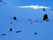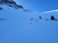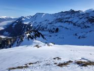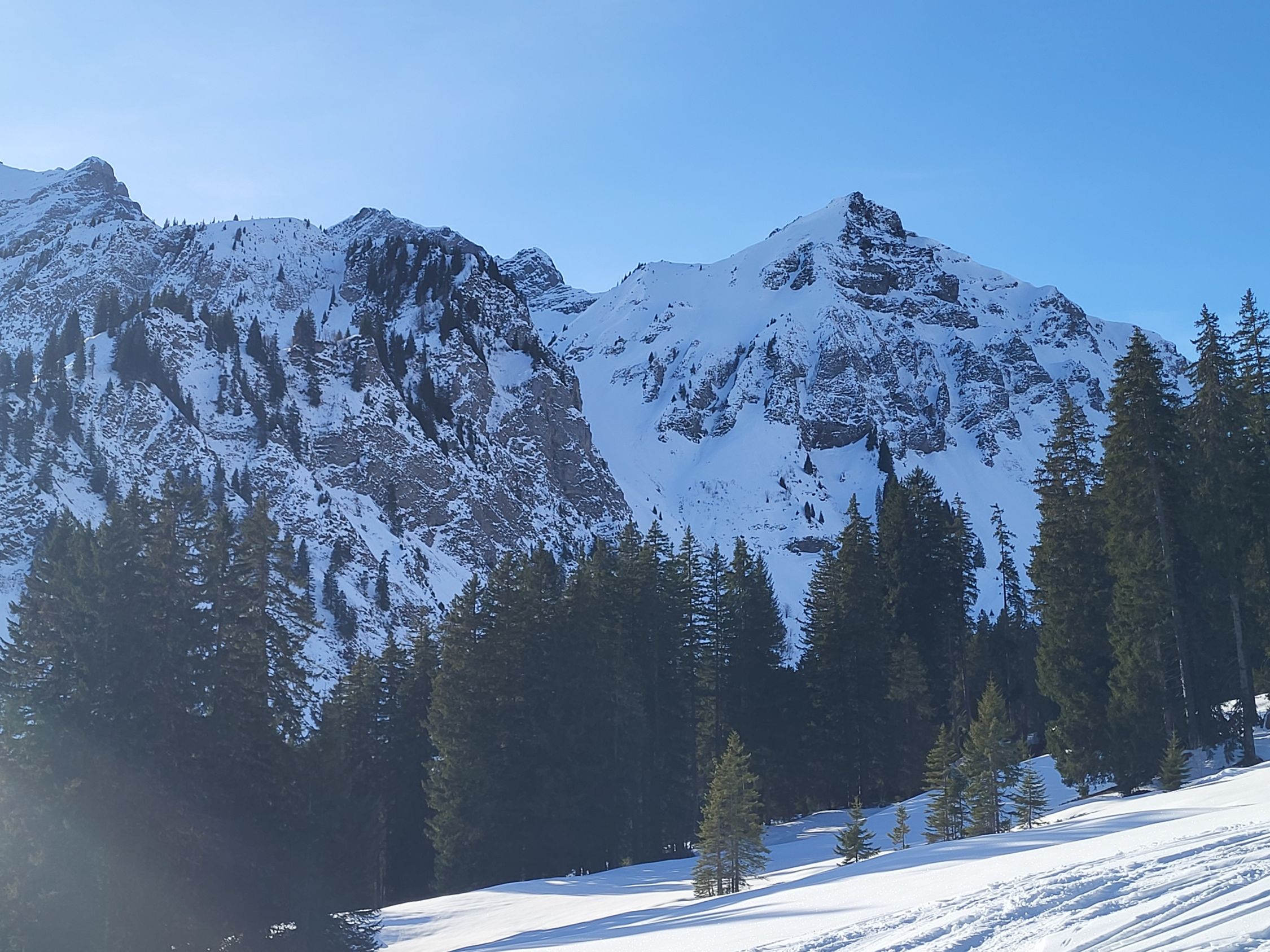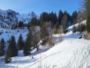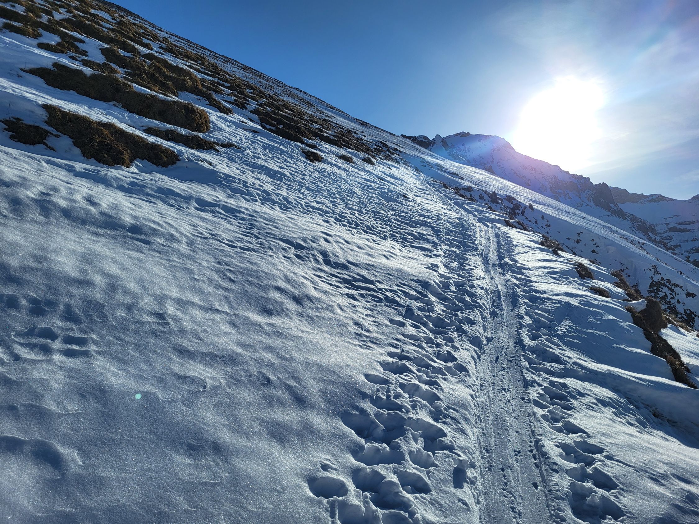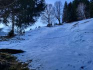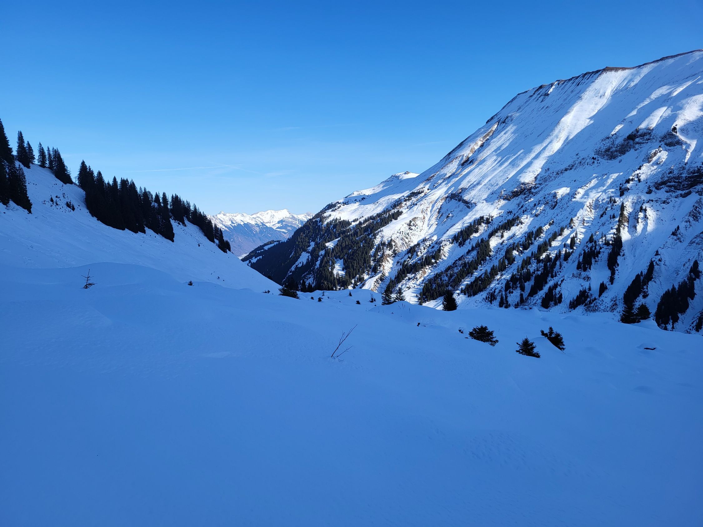 Die Abfahrt in der Ostflanke war der Hammer. Wenig Spuren und toller Pulverschnee. Lawinenrisiko der Abfahrt im Skitourenguru war heute 0.98, also im grünen Bereich. Es hat einige alte Lawinen im Hang. Ab Alp Underberg mit Skis auf dem Schlittelweg bis zum Skipuntli.