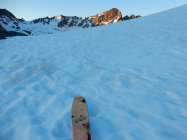 Beim Start an der Flüela-Passstrasse 6° C. Dank der nächtlichen Abstrahlung schon bald harte Schneeoberfläche. Kurze Skitragstellen in der Traverse zur Schwarzhornfurgga und im unteren Teil des Südostgrates. Insgesamt mussten die Ski heute höchstens 10 Minuten getragen werden. Um 7 Uhr auf dem Gipfel, genau zum Zeitpunkt, als in Davos die Sonne aufging. Abfahrt zur Schwarzhornfurgga al dente. Auf 2800 m neu angefellt und Richtung Süden zum Radüner Rothorn aufgestiegen. Am Schluss mit gebasteten Ski über den felsigen Nordwestrücken zum Gipfel. Abfahrt über die steile Nordostflanke nach halb 9 Uhr. Schnee schon etwas aufgeweicht, aber man ist nicht durchgebrochen. Vorsicht im obersten, gegen 45° steilen Abschnitt, da muss man ab und zu zwischen Felsen zirkeln, im unteren Teil aber beste Verhältnisse. Abfahrt zuletzt über eine Schneezunge bis zur Passstrasse. Ankunft um 9.15 h. Das Timing hat so gepasst...
