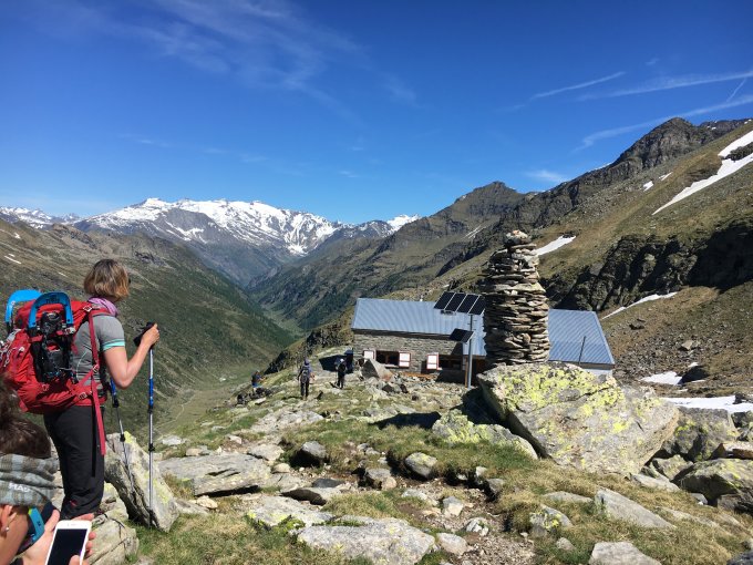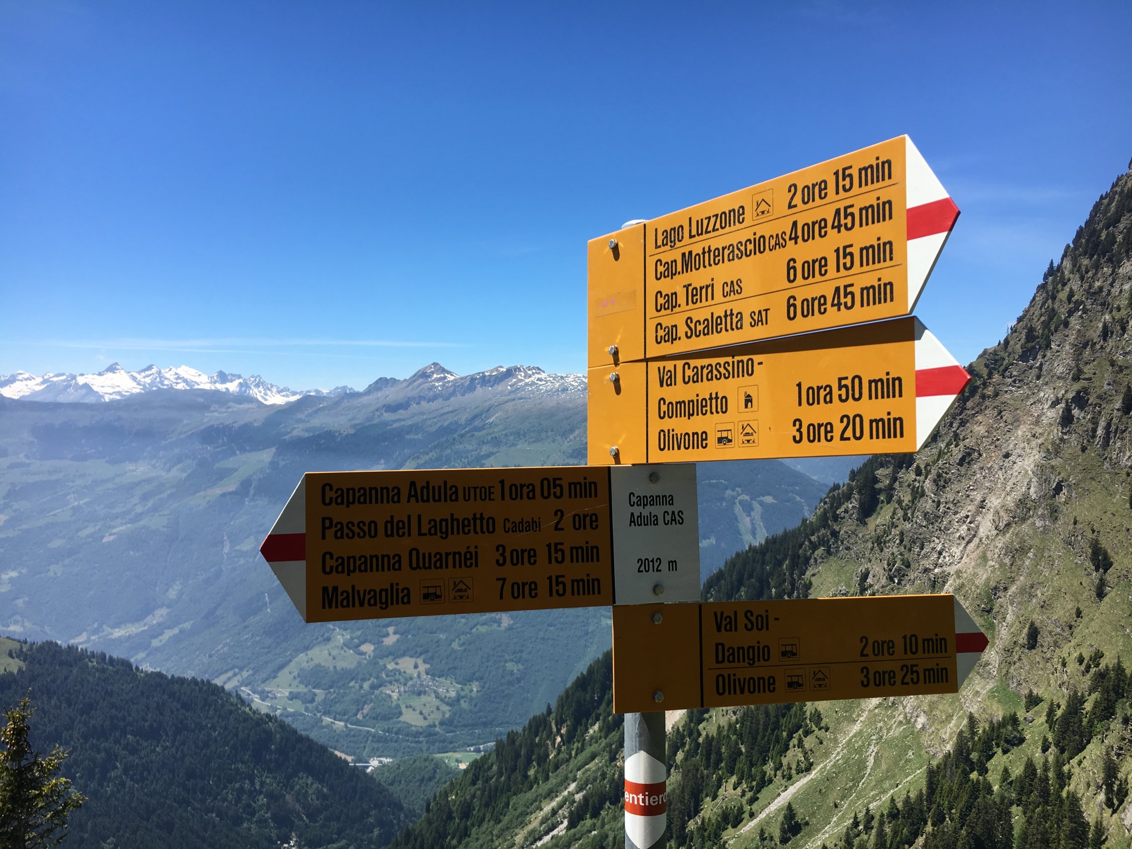 Auf der Schotterstrasse bis Soi und weiter auf dem Wanderweg bis zur Adula SAC Hütte auf 2000m. Nach einer kurzen Rast mit feinem Kuchen weiter zur Adulahütte UTOE (Unione Ticinese Operao Excursionisti) auf 2'400m, wo wir selbst gekocht haben. Die Hütte war noch nicht bewartet.