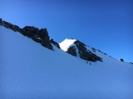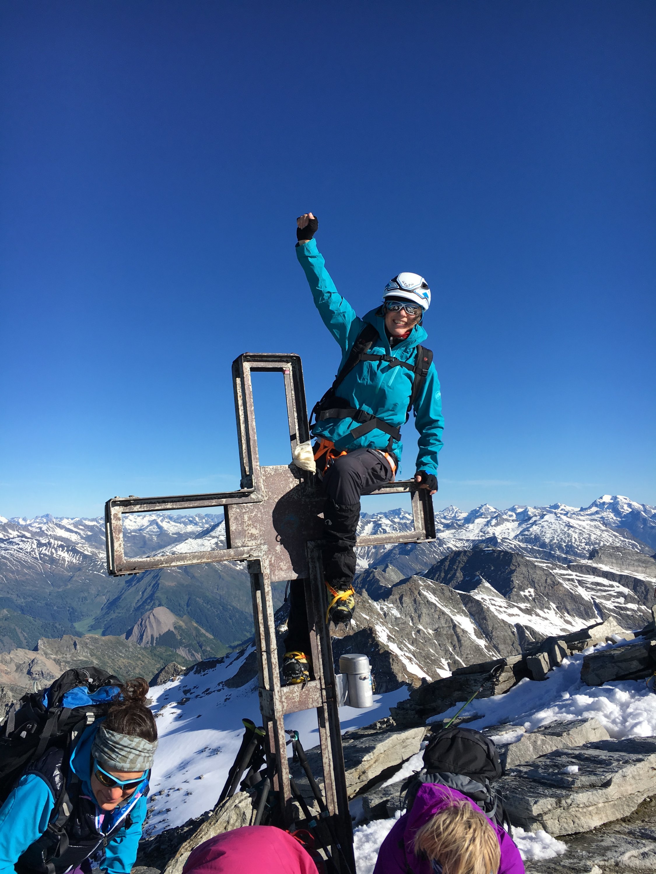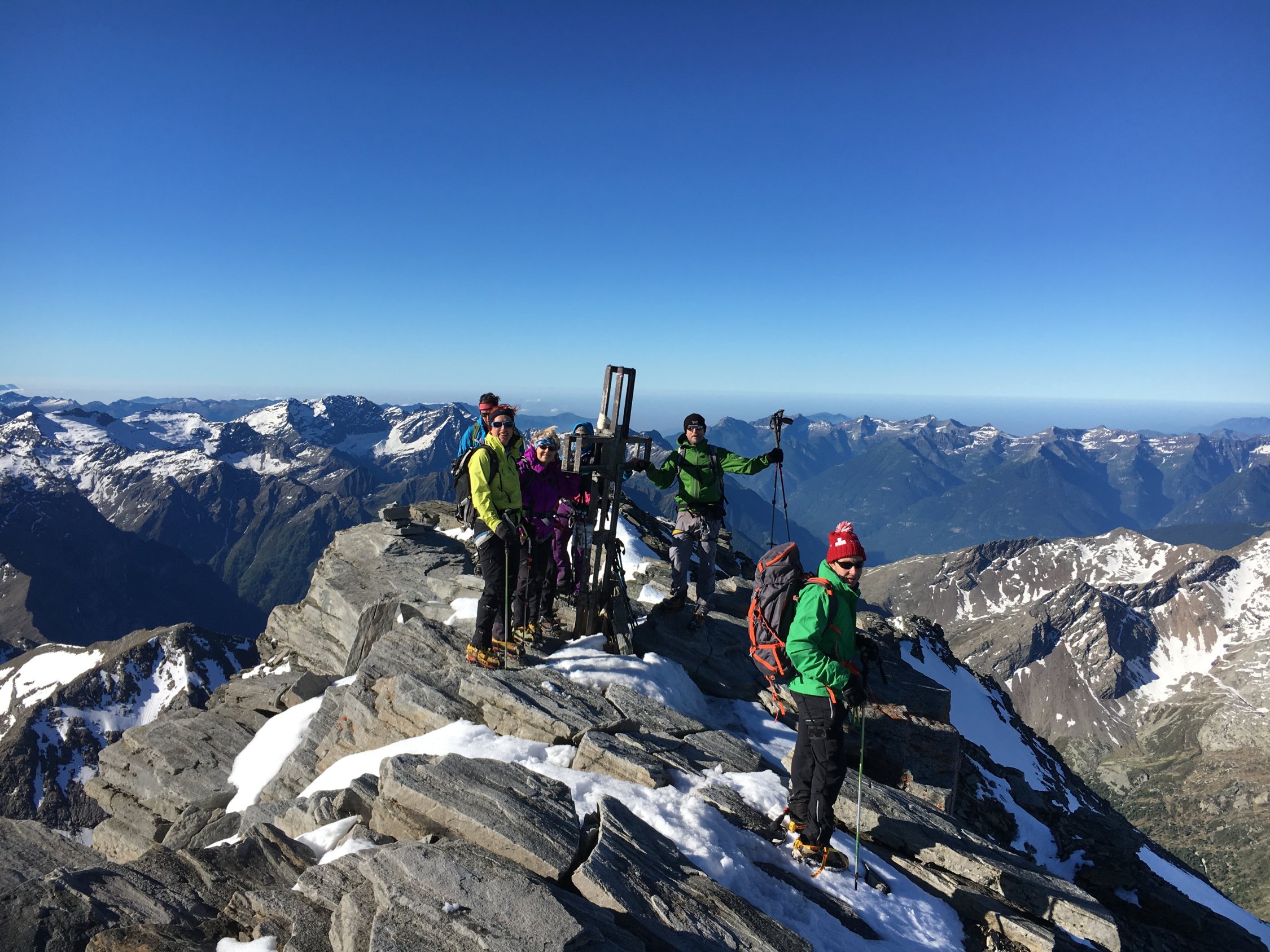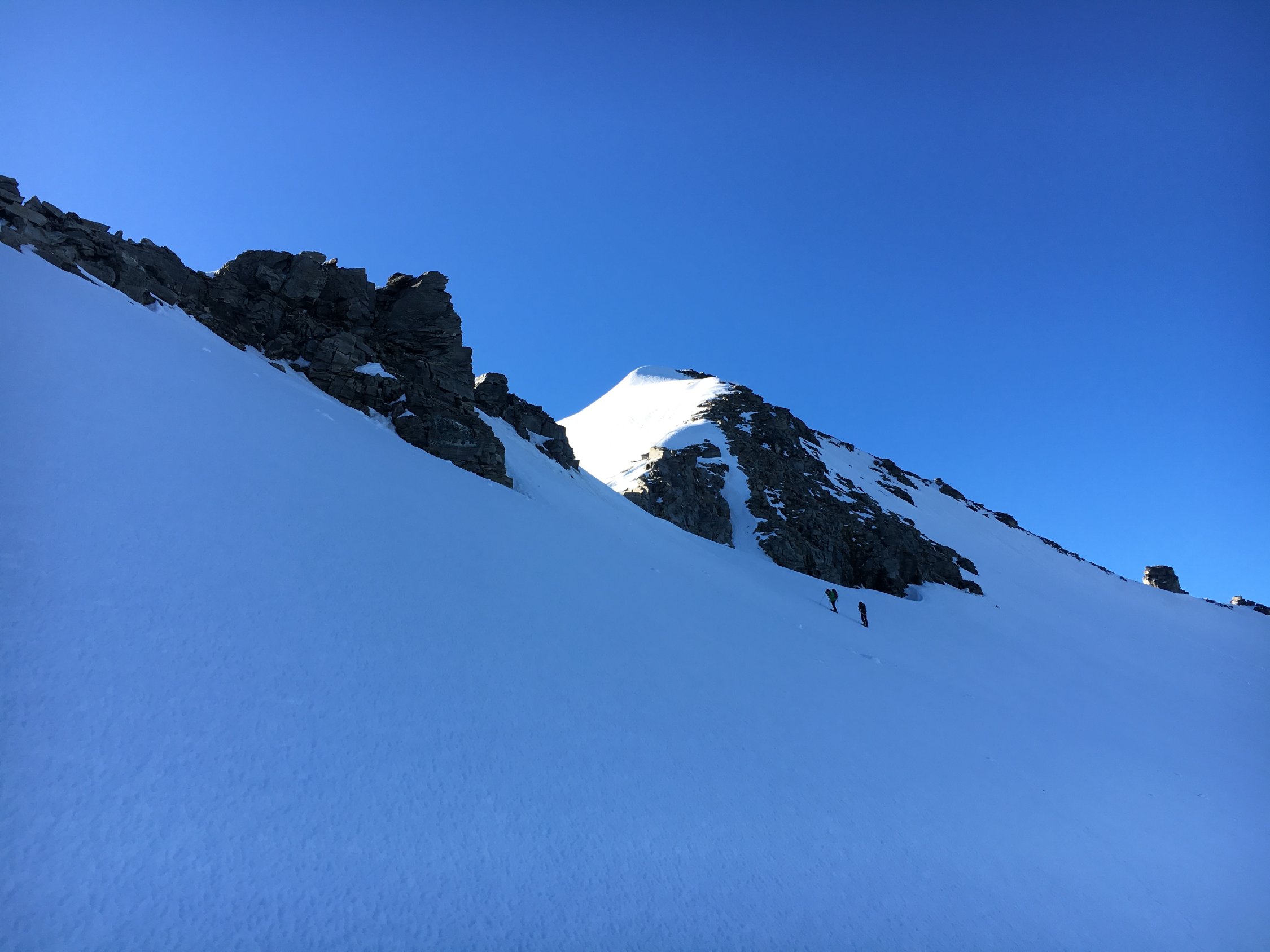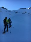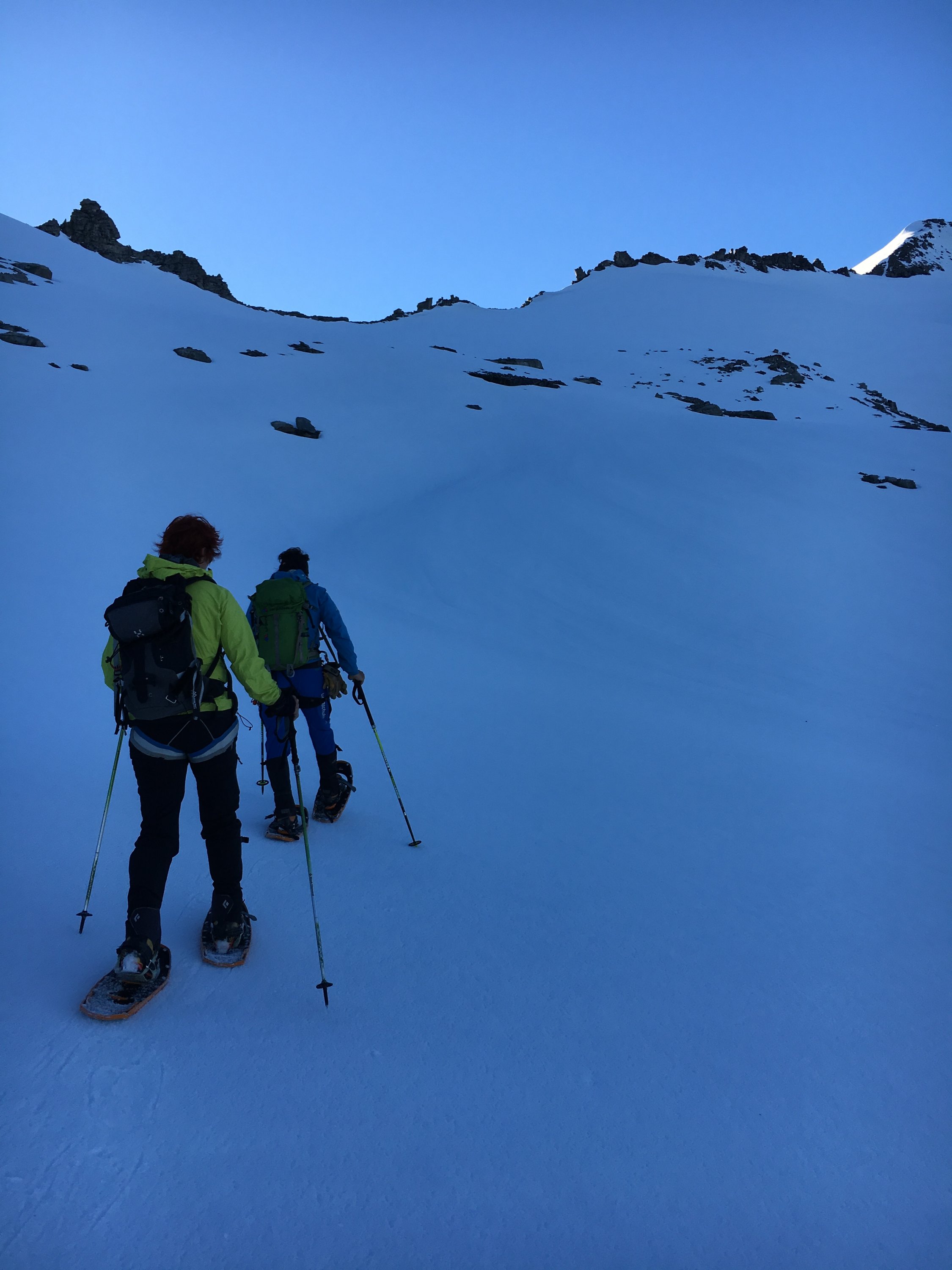 Traversierung des Gletschers Vadrecc di Bresciana bis zum Sattel auf 2'308m, Wechsel von Schneeschuhen auf Steigeisen und Aufstieg zum Gipfel.