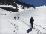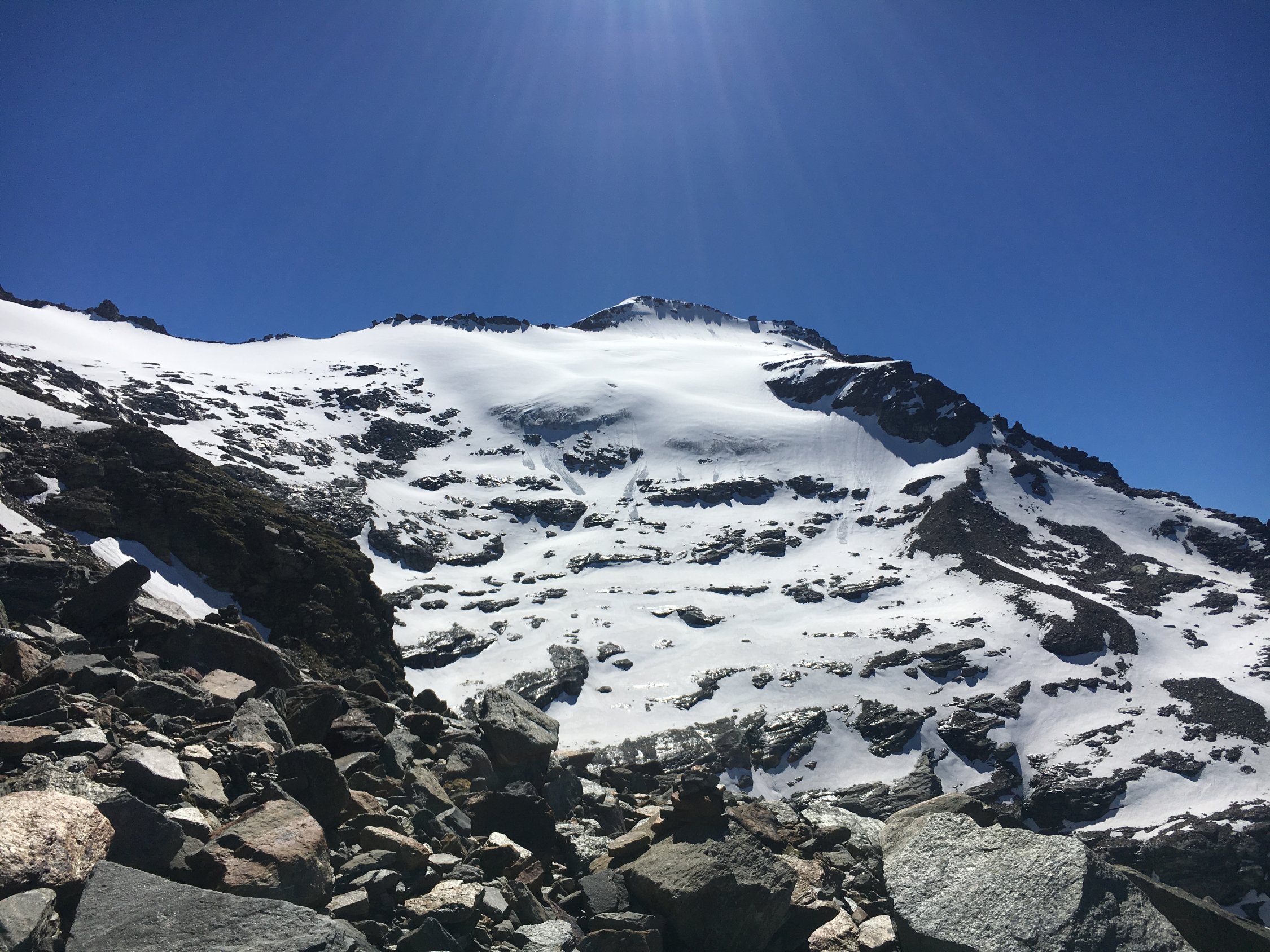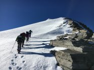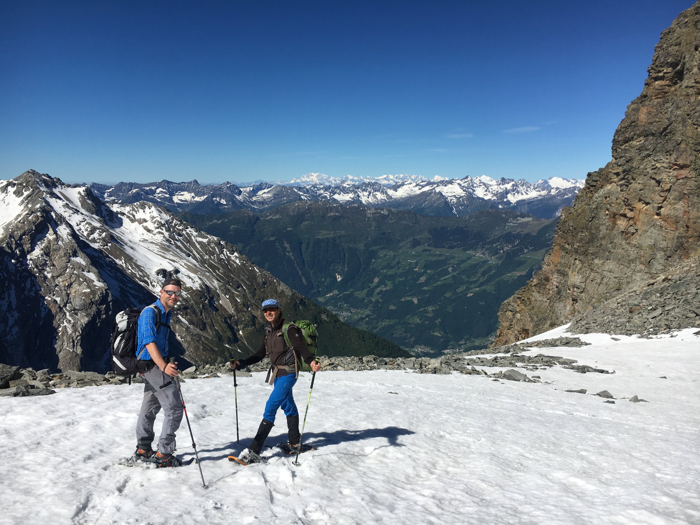 Abstieg zum Grat und Traversierung des Gletschers mit Steigeisen. Für die letzten Schneefelder haben wir nochmals die Schneeschuhe angeschnallt.