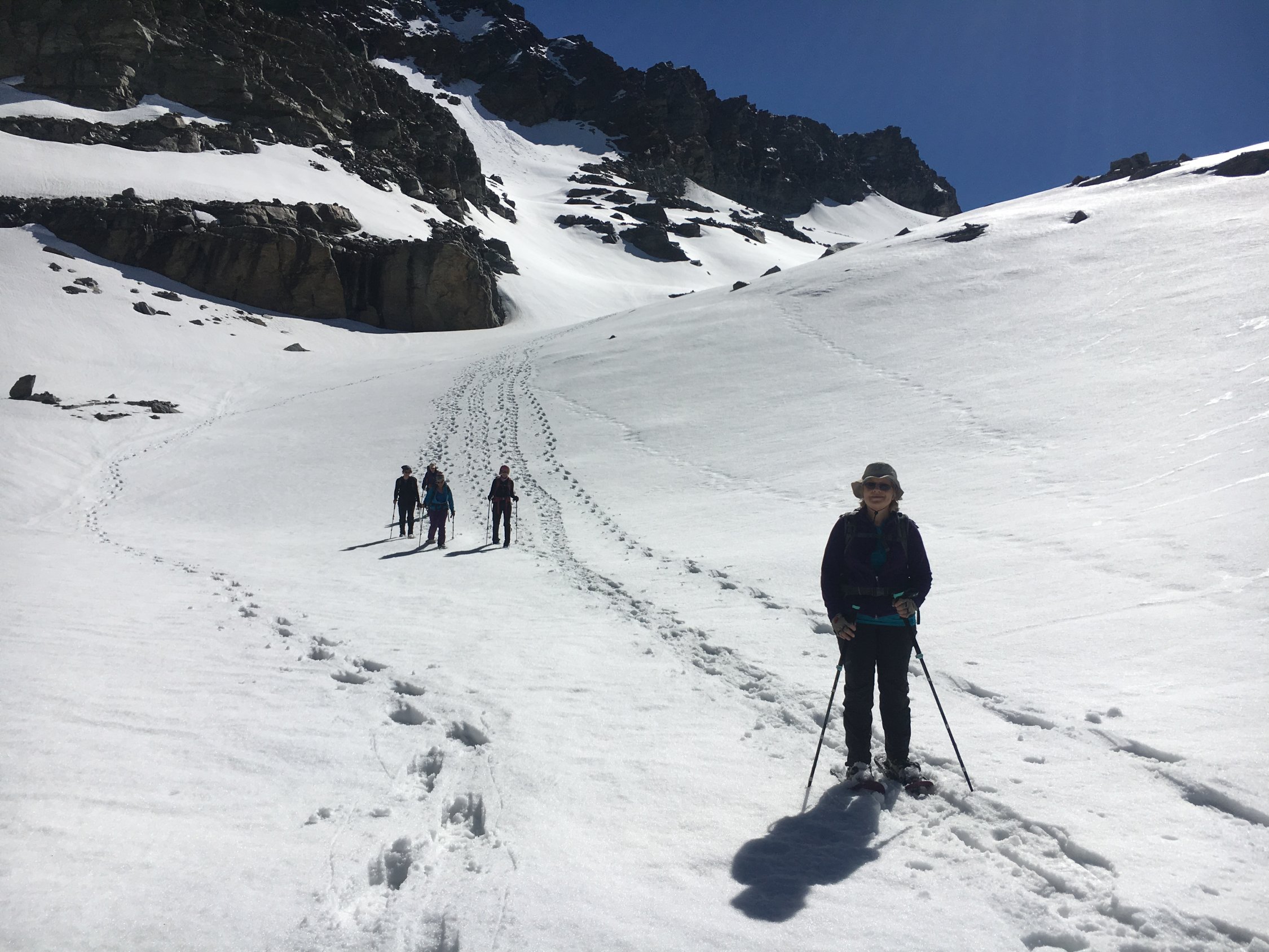 Auf 3'000 m erste Schneefelder. Es hat in der Nacht nicht gefroren und deshalb haben wir Schneeschuhe angezogen.