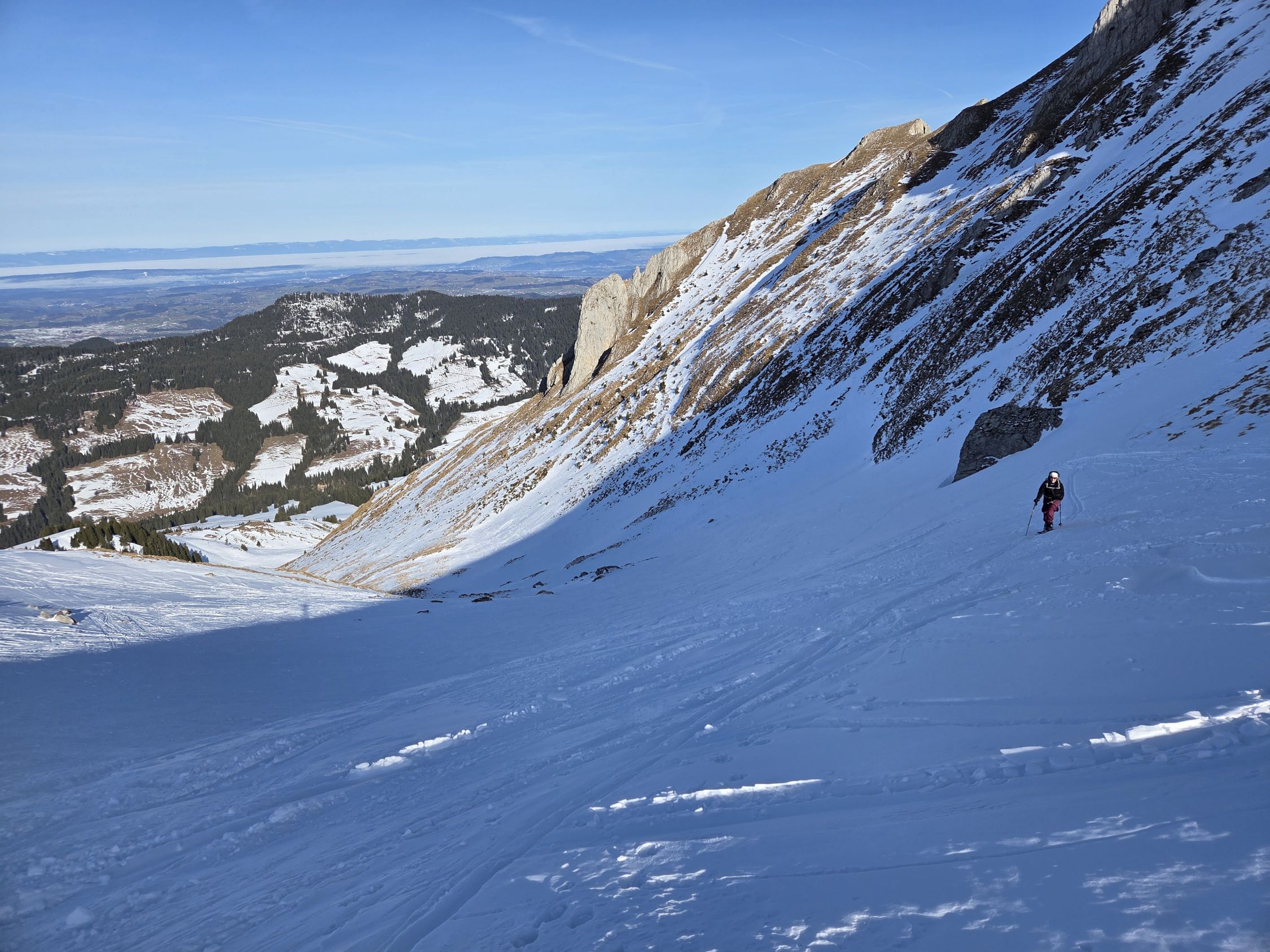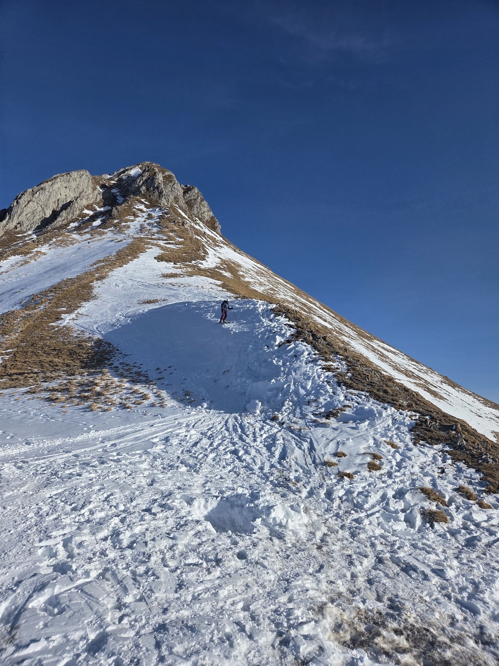 Wie zu erwarten hart und verfahren. Gleichwohl positiv zu vermerken: alles bis zum Sattel ohne Steinkontakt. Skidepot oberhalb Sattel, Gipfel gut machbar, da fast schneefrei