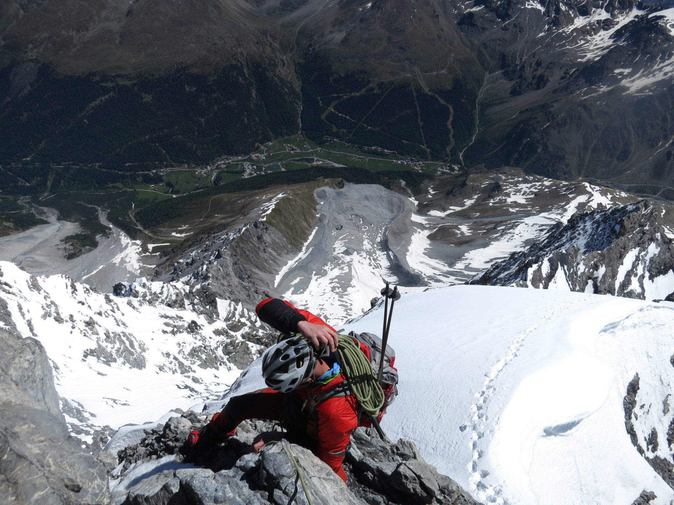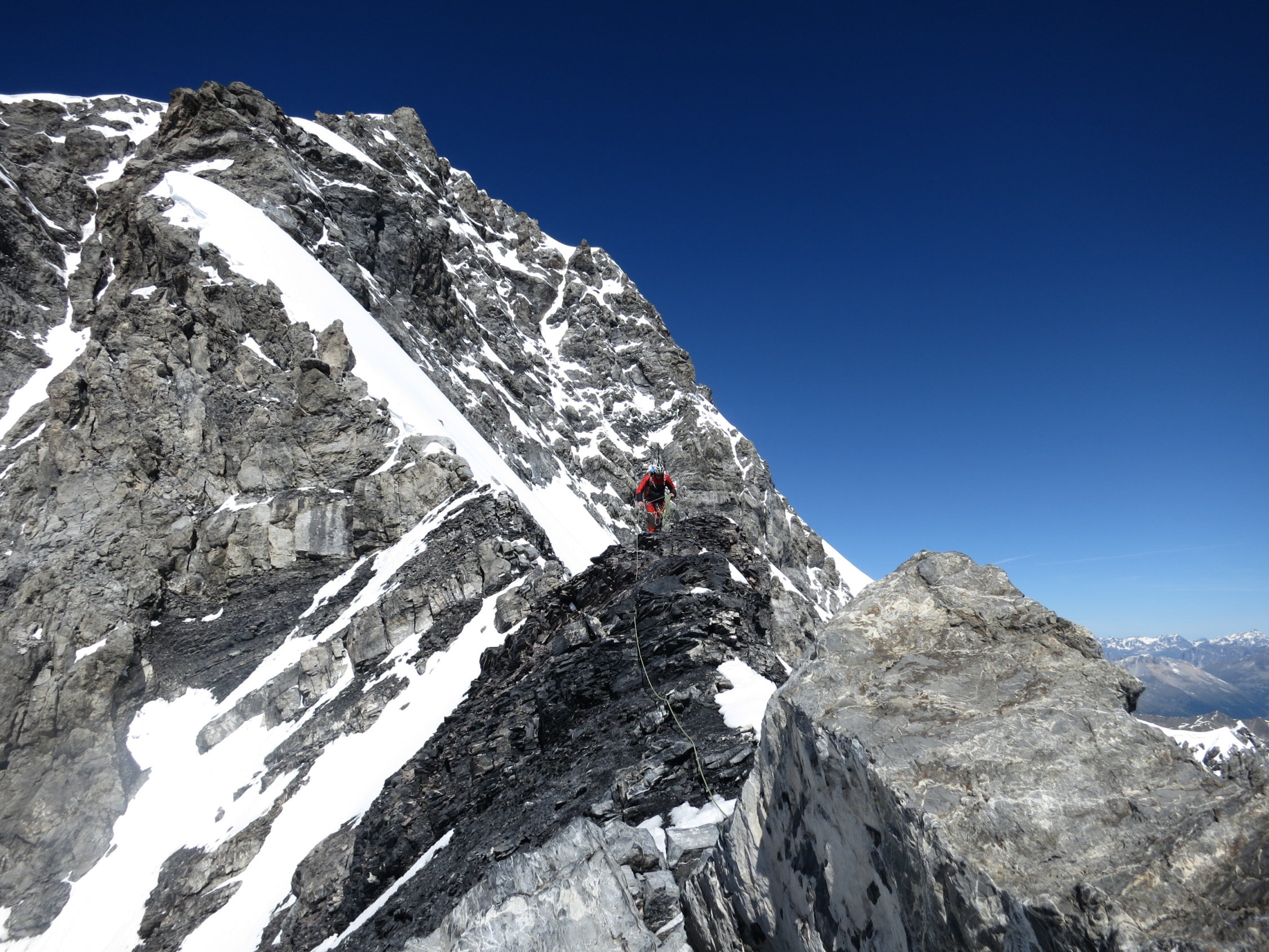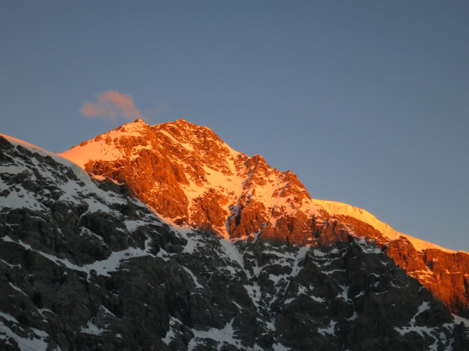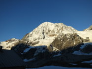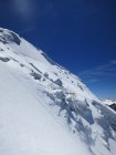 Die Verhältnisse sind nach dem schneearmen Winter jetzt schon gut. Der Grat kann bis auf die zwei Aufschwünge, die normalerweise über eine steile Firnrampe erstiegen werden, ohne Steigeisen gemacht werden. Der erste steile Hang nach der Hütte (normalerweise zig-zag im Schutthaufen) ist momentan ein steiler Firnhang.