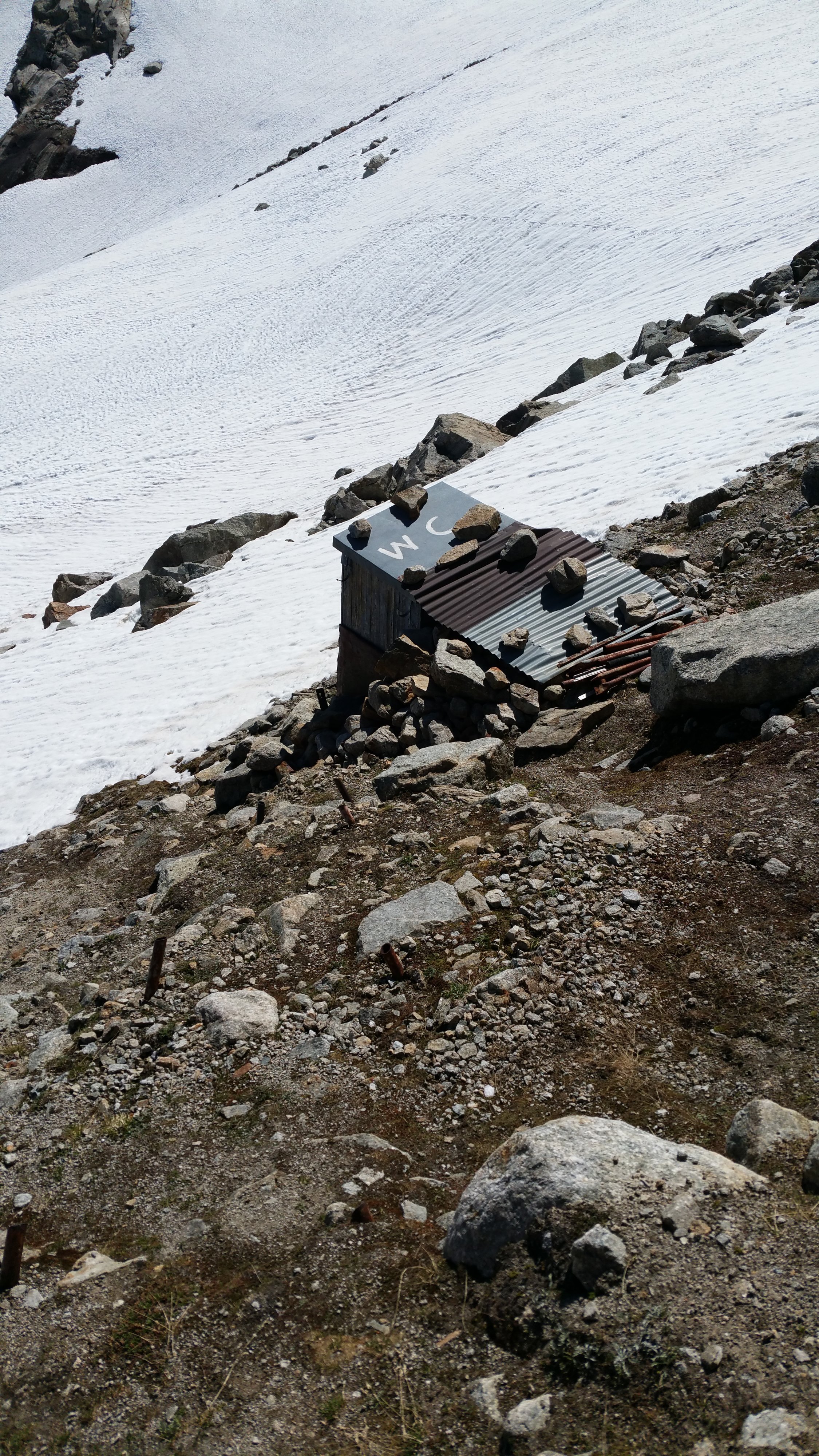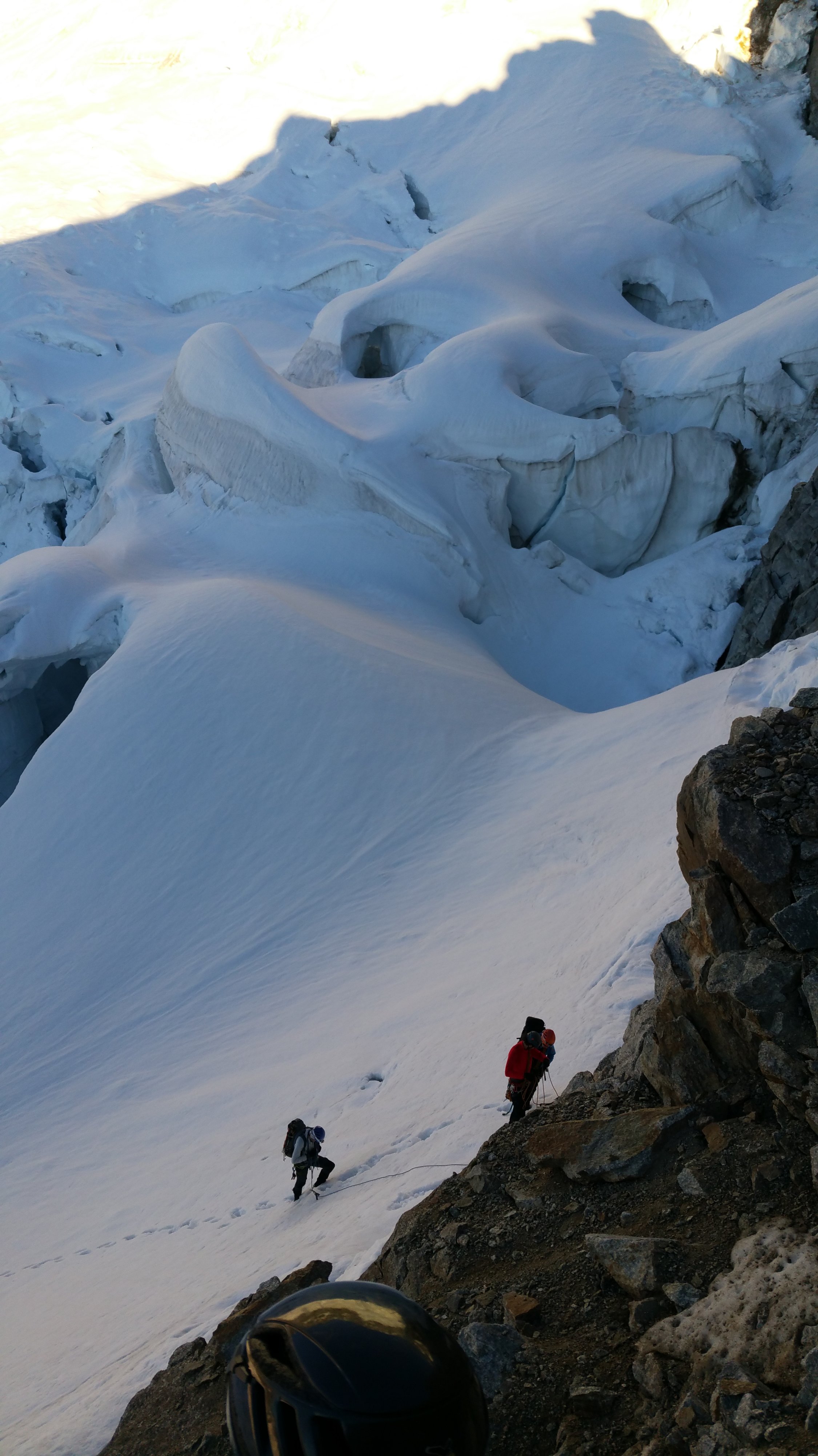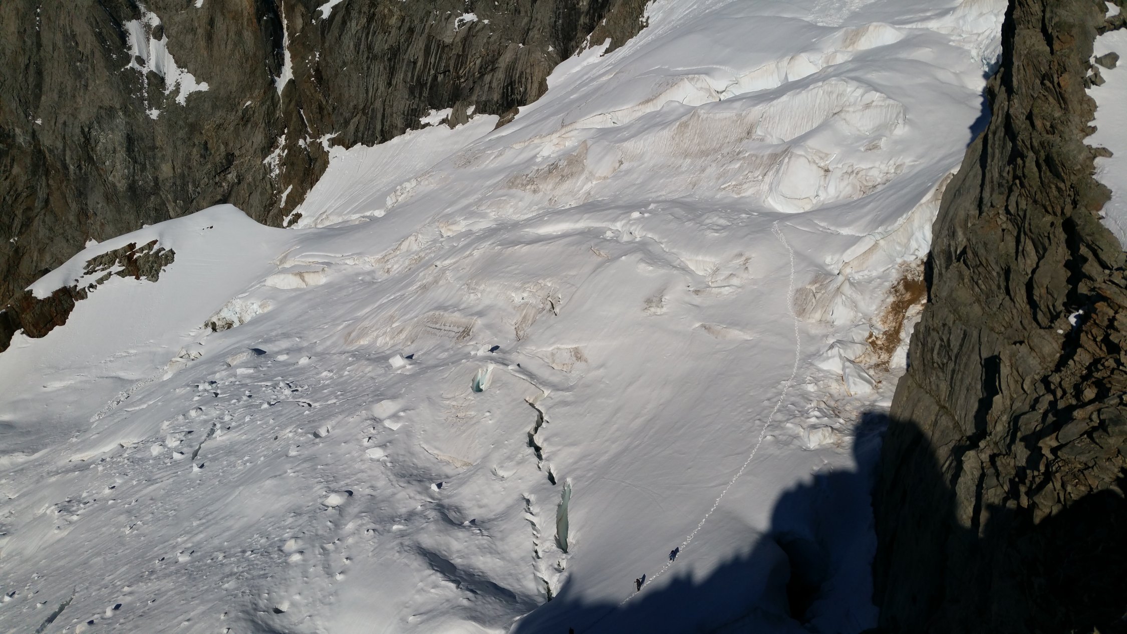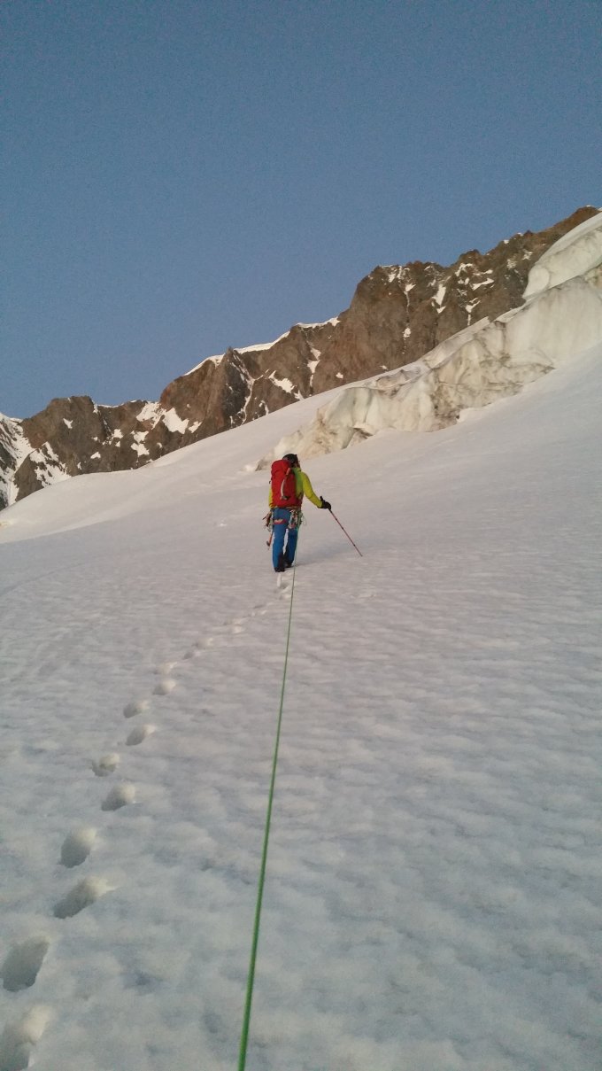 Hitzetag mit 0°-Grenze auf 4800m. Firn vermochte in der Nacht nicht richtig zu gefrieren. Beim Aufbruch um 4.10 sanken wir schon knöcheltief ein. Die Querung auf den Grat bei 2850m wie z.B. im SAC-Führer beschrieben, wäre kaum möglich gewesen, da noch Schmelzwasser darüber floss. Stiegen auf dem orographisch linken Rand des Glacier du Dolent bis ca. 3150 auf, wo wir über gestuftes und brüchiges Gelände auf den Grat gelangten. Die Fortsetzung des Grats wäre ein Abseiler an einem Normalhaken und ein anschliessender, schneedurchsetzter Aufstieg auf einen Turm gewesen. Sah für uns nicht sehr einladend aus. Daher Rückzug auf den Gletscher und weiterer Aufstieg auf dem Gletscher in Schlangenlinien durch das Spaltengewirr bis zum Bergschrund auf 3400m. Dieser ist bereits weit geöffnet, liesse sich aber an einzelnen Stellen noch überwinden. Vom Plan, den Schrund auf der südlichen Seite zu überwinden, dann nach Norden über die steilen Firnfelder zu queren und damit den Grat auf etwa 3500 zu gewinnen, haben wir dann verzichtet, da uns die Hänge unter den Füssen davon zu fliessen drohten. Beim Abstieg öfters knietief, gelegentlich sogar hüfttief eingesunken.