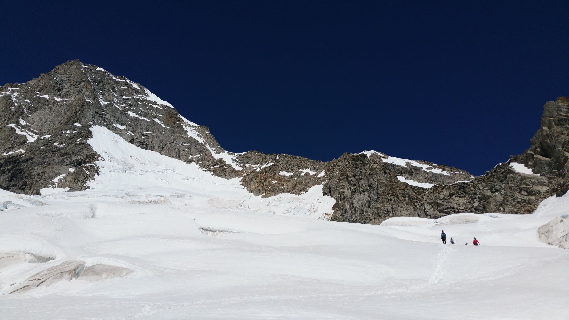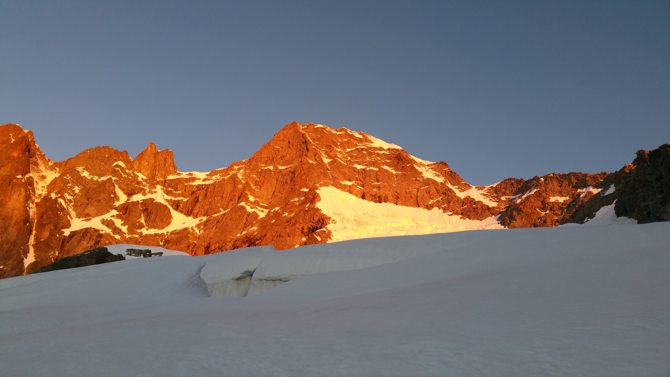 Aufbruch um 4.10 war definitiv zu spät. Gerade bei so warmen Nächten, aber wohl auch sonst, lohnt sich ein früher Aufbruch. Die Osthänge, in welchen man aufsteigt, bis zum eigentlichen Grat, werden schnell weich. Geht man früher auf den Grat, lässt sich dieses Problem umgehen. Allerdings sieht der Grat recht sportlich aus und wir hatten ein wenig Mühe uns vorzustellen, diesen in fünf Stunden zu klettern.
