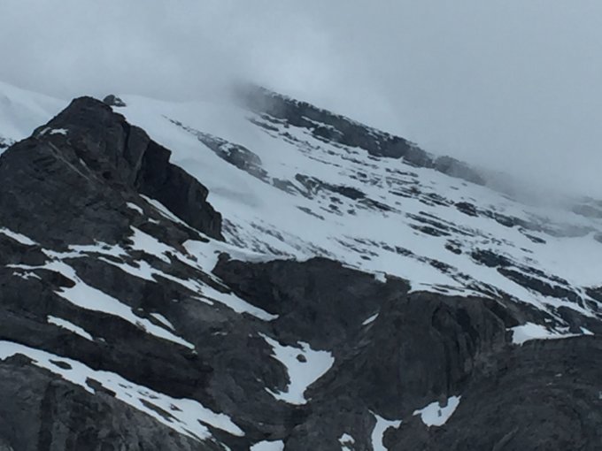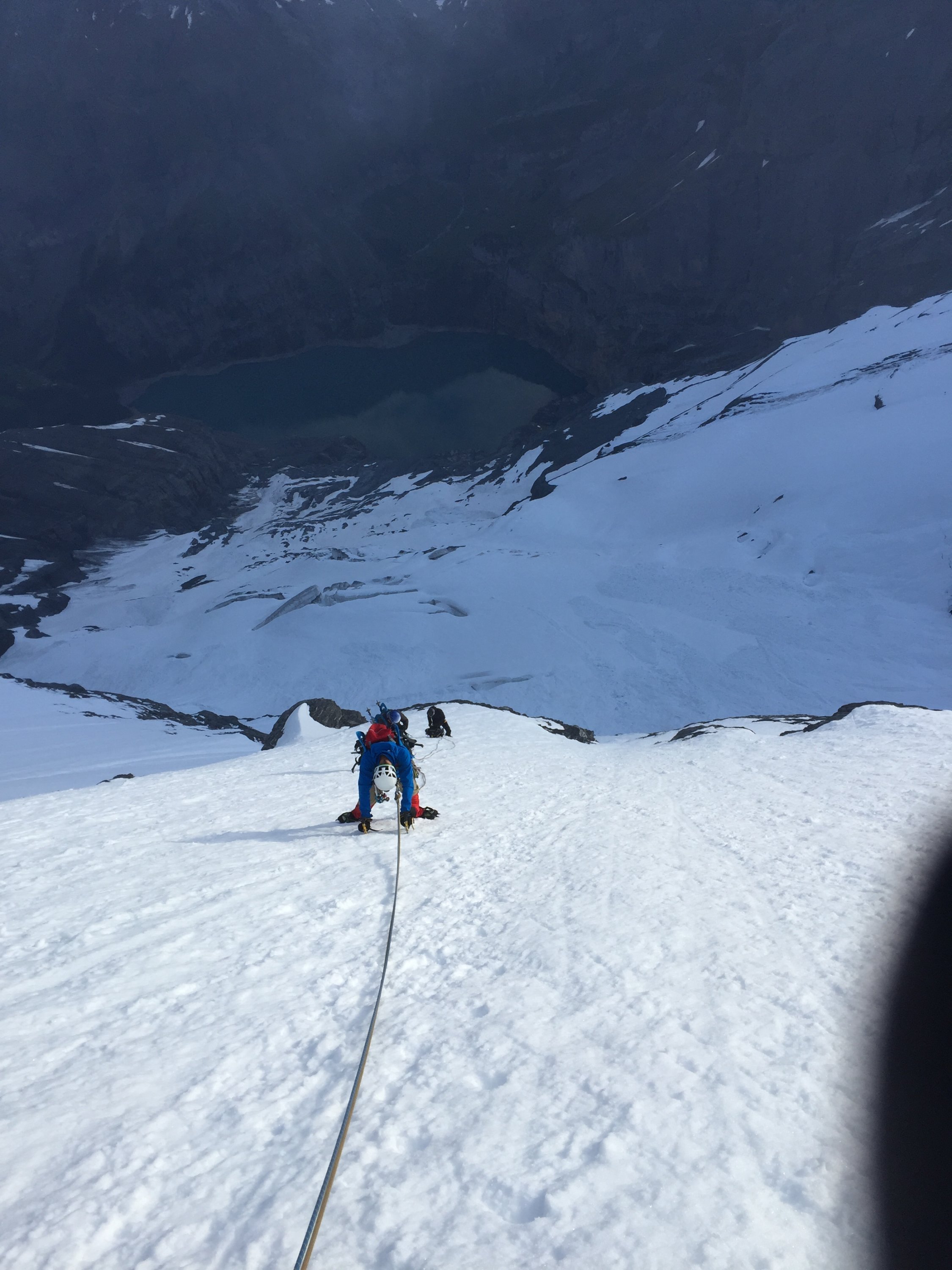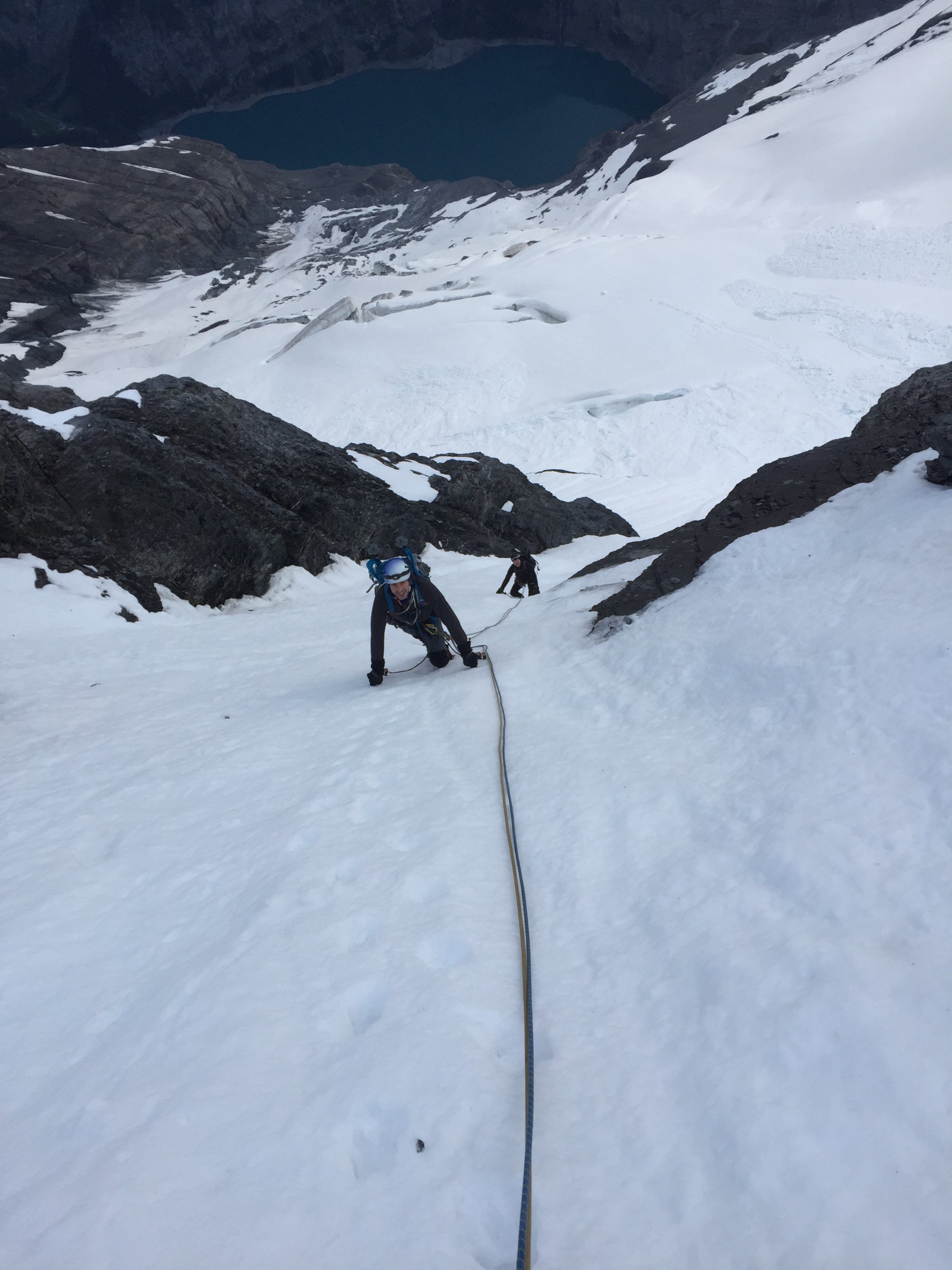 Die Wand bietet aktuell beste Verhältnisse. Zustieg etwas mühselige spurarbeit, die Gipfelwand konnten wir fast vollständig im Firn bzw. Trittschnee angehen. Lediglich eine kurze etwas brüchige Felspassage kurz nach dem Einstieg. Beim Ausstieg wird der Firn schon dünner