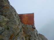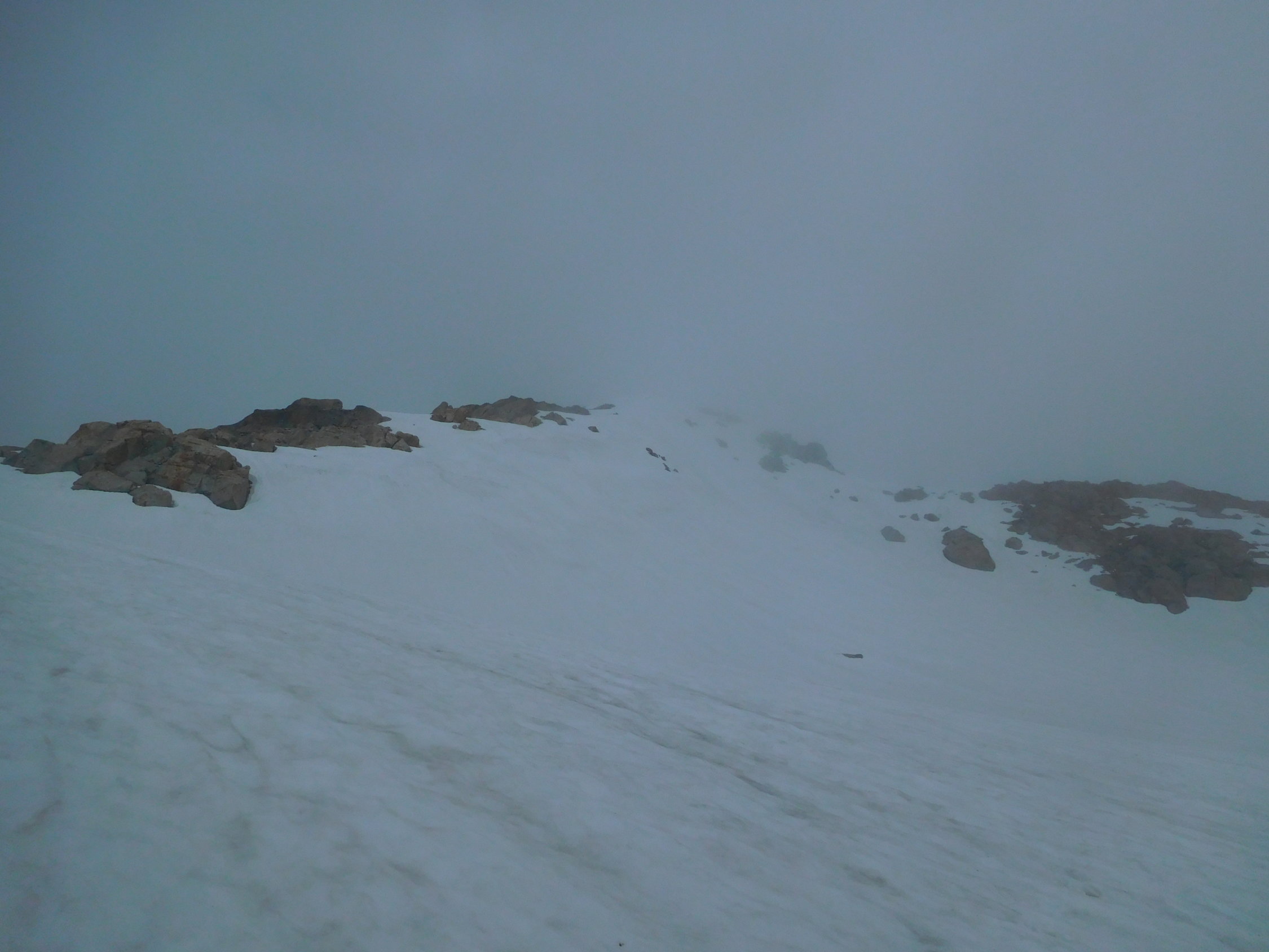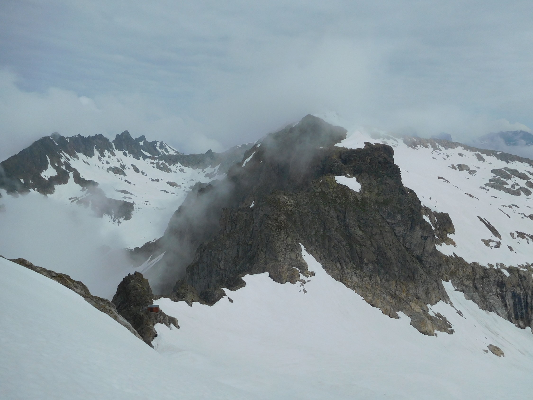 Start der Tour bei +10°, leider schon wieder bedeckt, die Ski konnten schon nach wenigen Metern motiert werden, auf Ackerschnee gings zur Schlüsselstelle, die Blankeisstelle habe ich links sehr steil überwunden, bei der Nordquerung bei 2675 Meter kurz einmal kein Schnee, die Ski mussten 30-40 Meter getragen werden, nach einem kurzen Aufstieg wurde der Gipfel erreicht, trotz Nebel kam Freude auf.