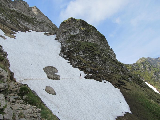 Die Normalroute auf den Säntis machen wir meist im Frühsommer. Auch heute gab es wieder leichtes Hochtouren-Feeling, waren doch noch zahlreiche Schneefelder zu queren. Unterhalb und "In den Schnüeren" gab es die jahreszeitlich üblichen Schneefelder zu queren, die jedoch gut gespurt waren, aber doch Trittsicherheit verlangen. Auch vom "Ellenbogen" bis zur Tierwis noch zwei Stellen mit Schneepassagen, eines davon steil, aber mit einer fast horizontal angelegten Spur weniger heikel, als ich dies schon erlebte. Durch das "Charrefeld" war es jahreszeitgemäß. Hier einfach in der Spur bleiben, was Einbrüche an Felsrändern vermeiden hilft.
