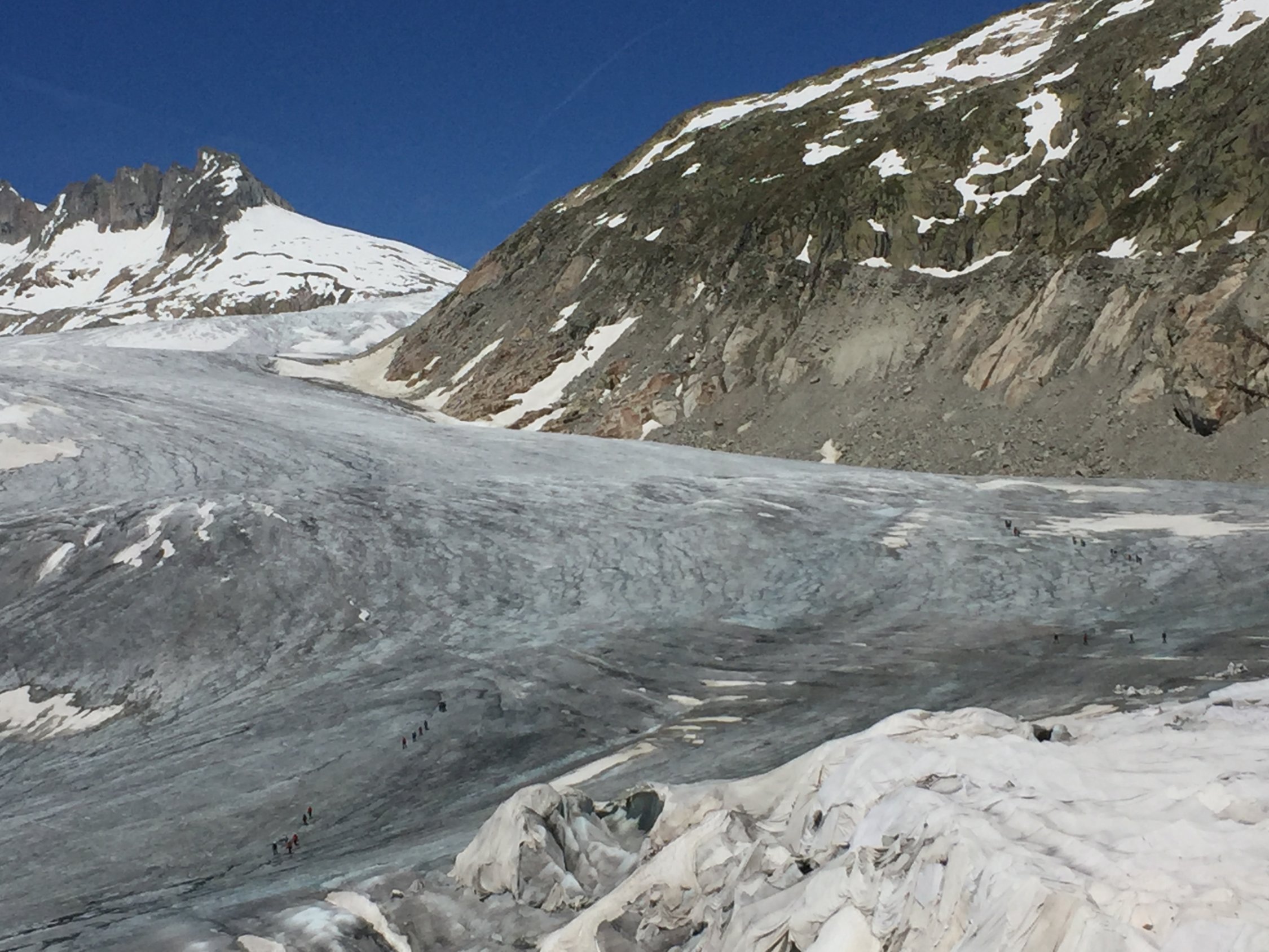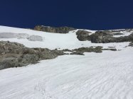 Ab Grotte bis kurz vor der Verzweigung Galenstock Dammastock auf komplett blankem Gletscher aufgestiegen, was aber sehr gut ging! Dann den Steilhang auf Schneeband aufgestiegen was mit Harsteisen kein Probleme war. Weiter aufsteigen und kurz die Ski tragen, was Total 3-4x vorkam. Im Kessel hinten schräg den Steilhang hoch mit Harsteisen, war sehr hart, ging gerade, wurde auch mit Steigeisen gemacht. Oben dann sehr steil, da hab auch ich die Steigeisen genommen. Später dann flächer bis zum Skidepot, hier mit Steigeisen bis auf den Gipfel, Ski mitgenommen.