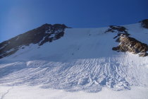 Gletscherrampe im Abstieg noch gut eingeschneit. Aber einige Spalten schon sichtbar. Im Abstieg immer wieder eingebrochen.