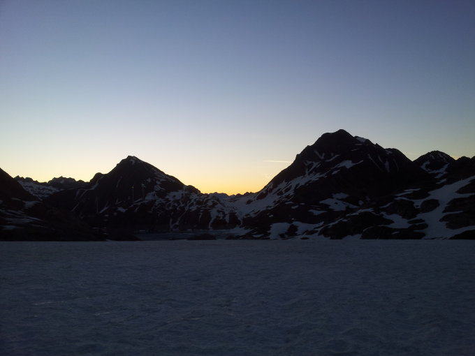 Die Strasse zur Staumauer ist verständlicherweise nicht geräumt, ziemlich grosse Steinchen überall, die würden sicher die Fräse beschädigen. Allenfalls mit Bike machbar, erste 100m über Schnee, dann kurze Stücke am Strassenrand, den Rest auf der Strasse. Zeitbedarf zu Fuss 25 Minuten. Mit Ski zurück ist nicht wirklich lohnend, trotz praktisch durchgehender Schneedecke auf der Strasse. Von der Staumauer noch 40 Minuten Ski tragen bis auf den Gletscher. Von da weg praktisch durchgehende Firnschneedecke mit höchstens 10cm tiefen Löchern. Abfahrt 9:45 war sicher nicht zu spät, bisschen weicher rumpelts weniger...