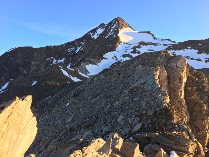Südseitig wird man früher auf den unteren, brüchigen Gratteil wechseln müssen, spielt aber eigentlich keine Rolle. Bei der Schneeauflage dieses Jahr wird die Überschreitung nach Hohsaas sicher nicht ewig möglich sein. Nordgrat sieht recht trocken aus.