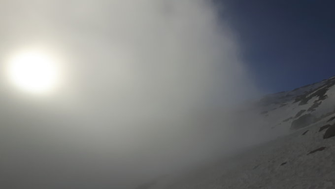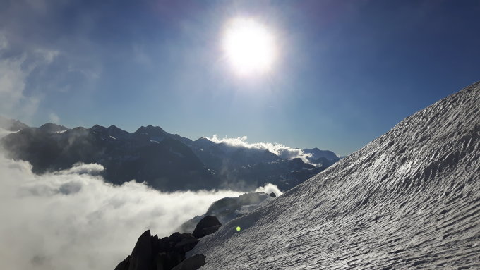 Morgens sehr dichter Nebel bis ca. 2400 m, daher von der Gotthardpasshöhe ab 5:30 Uhr mit GPS navigiert, anfangs aper, dann bald bis auf zwei Tragestellen durchwegs schöner weicher Schnee bis in die Vallettalücke. Oberhalb des Nebels stahlblauer Himmel. Abfahrt von der Vallettalücke pickelhart gefroren, gradenoch gut mit Ski abfahrbar.