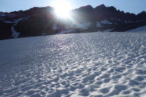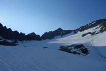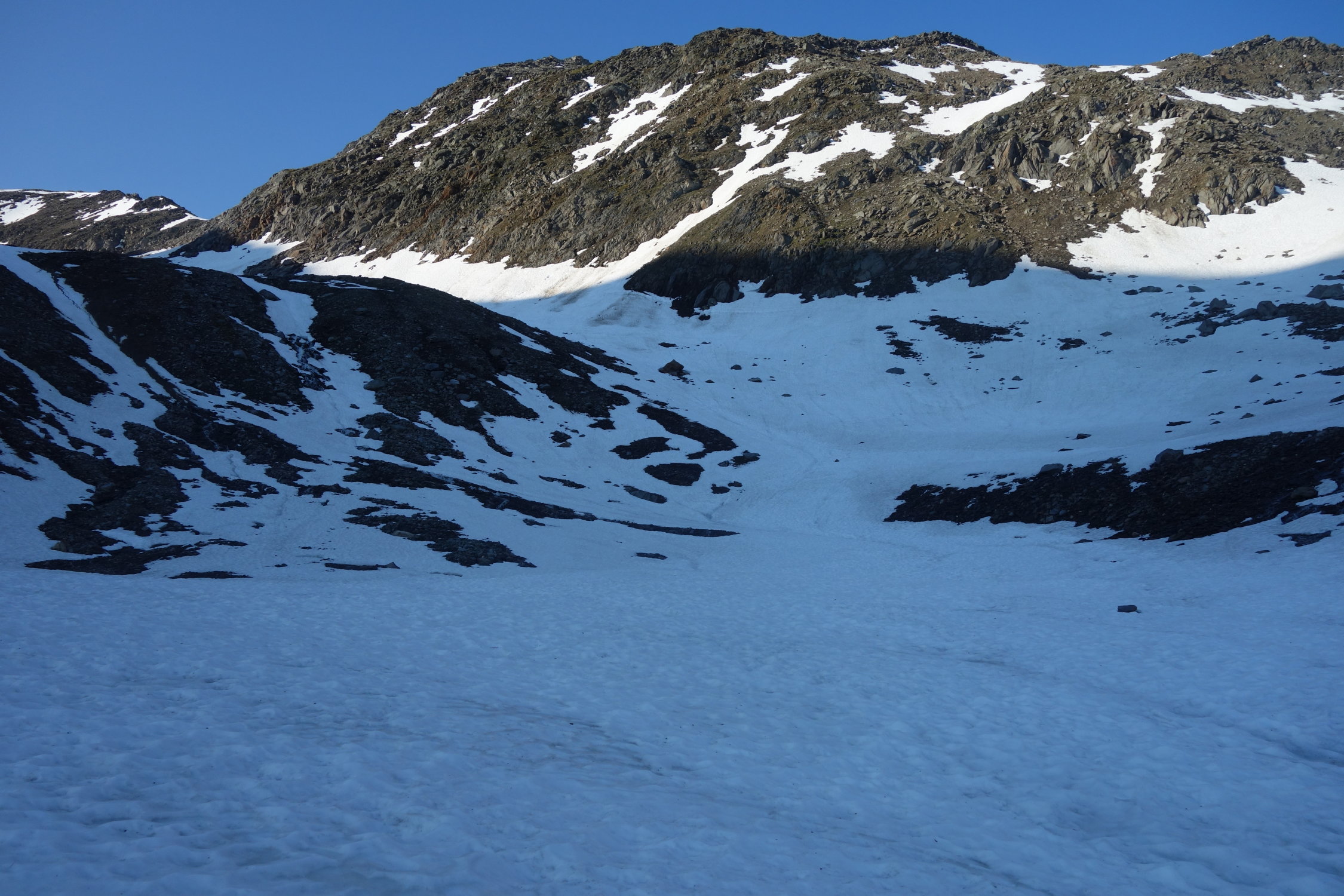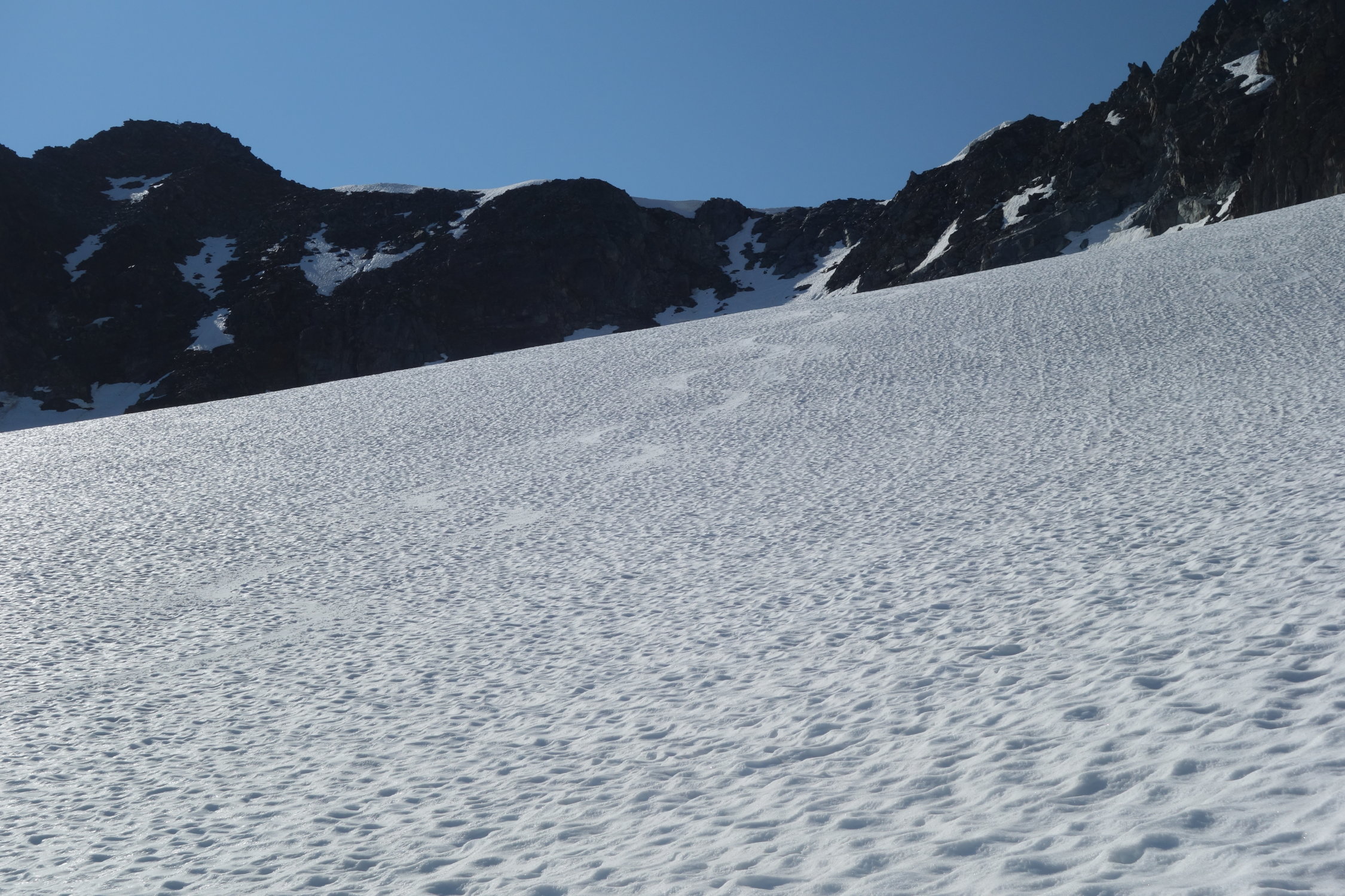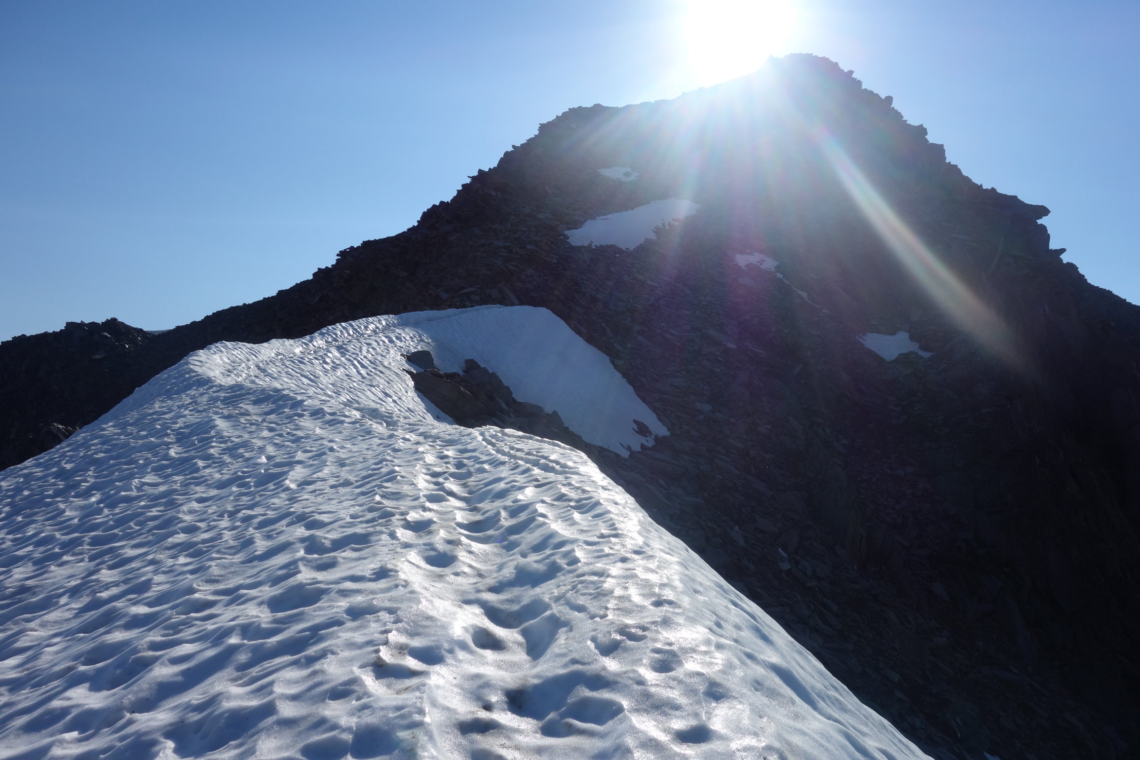 Schnee im Aufstieg um ca. 07.00 leicht "aufgesulzt". Der Büsserschnee war entsprechend recht angenehm zu gehen. Flanke ab Skidepot ohne Steigeisen möglich, leicht eingesunken. Am Ausstieg noch ein Schneefeld in der flachen Traverse danach alles trocken. Am Gipfel sehr angenehm, T-Shirt-Wetter.