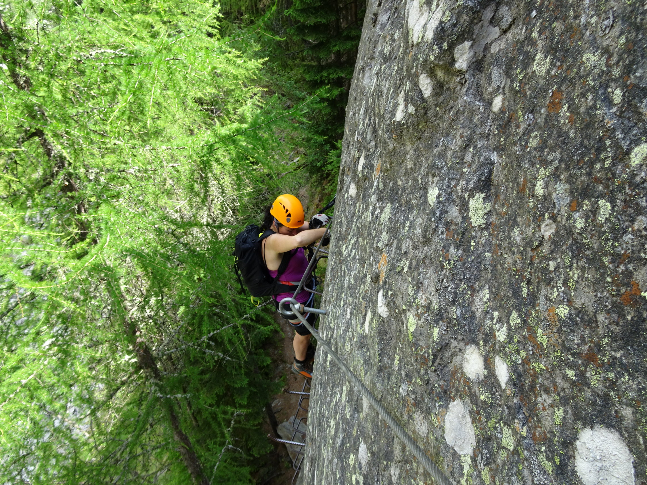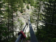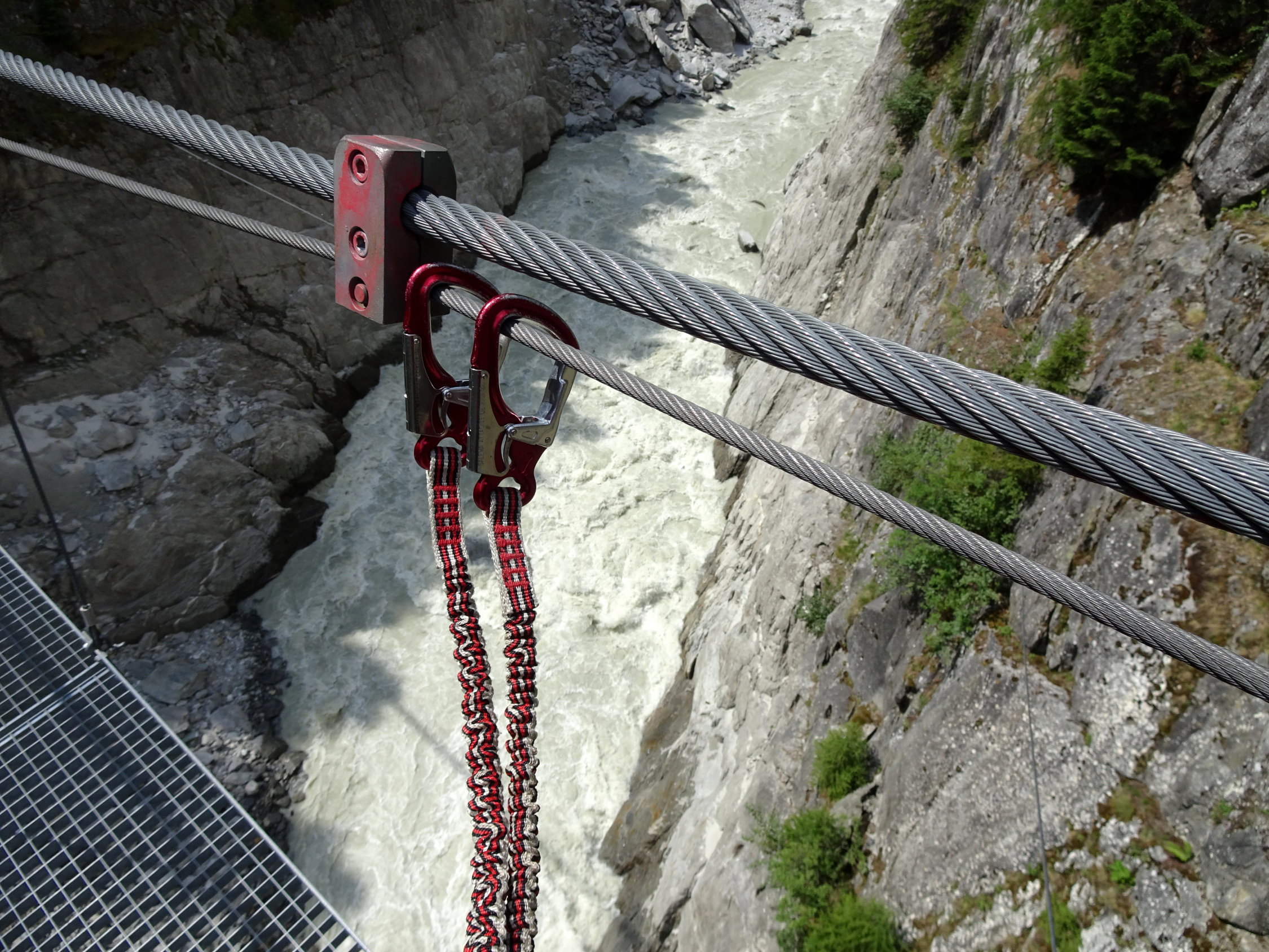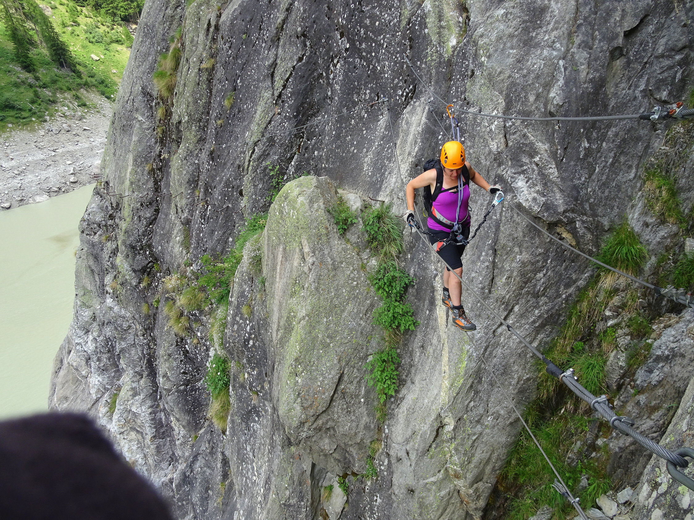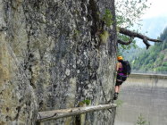 Mit dem Gibidum kann man die Klettersteig Saison gemütlich starten. Kein grosser Kraftaufwand, aber eine Menge kleine, manchmal knifflige Stellen. Viele Traversen, man geht ja um den Stausee herum, eine lange, gutmütige Hängebrücke und eine kurze 4-Seilbrücke mit hängendem, wackligem Laufseil, dafür mit zusätzlichem Seil über dem Kopf. Also nicht zu kurze Standschlinge mitnehmen. Wenn der See voll ist oder fast überläuft, ist es am schönstem. Man hat das Gefühl man wandere übers Wasser. Sehr empfehlenswert.