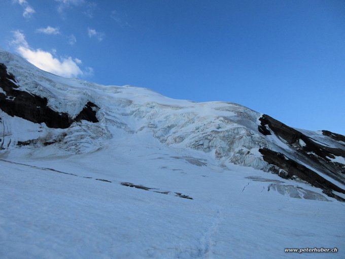 Nun gibt es eine klar erkennbare Spur. In der Querung auf 3400 m hat es 2x kurz Blankeis im steilen Hang. Anspruchsvoll. Etliche Spalten sind gerade noch einigermassen zu queren. Dürfte bald anspruchsvoller werden. Schnee hat es gleich von der Strasse hinter Hosaas weg.
