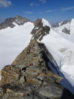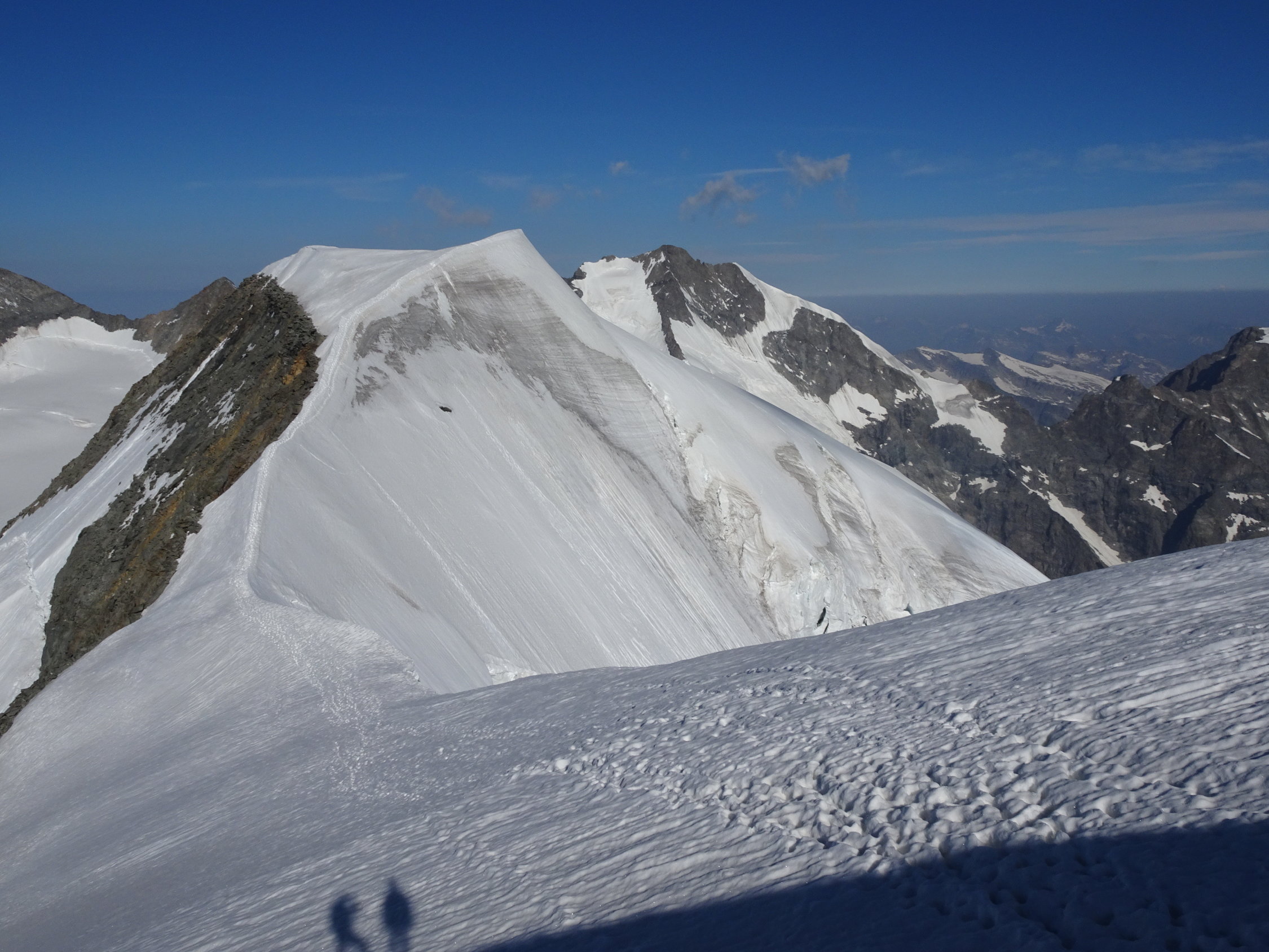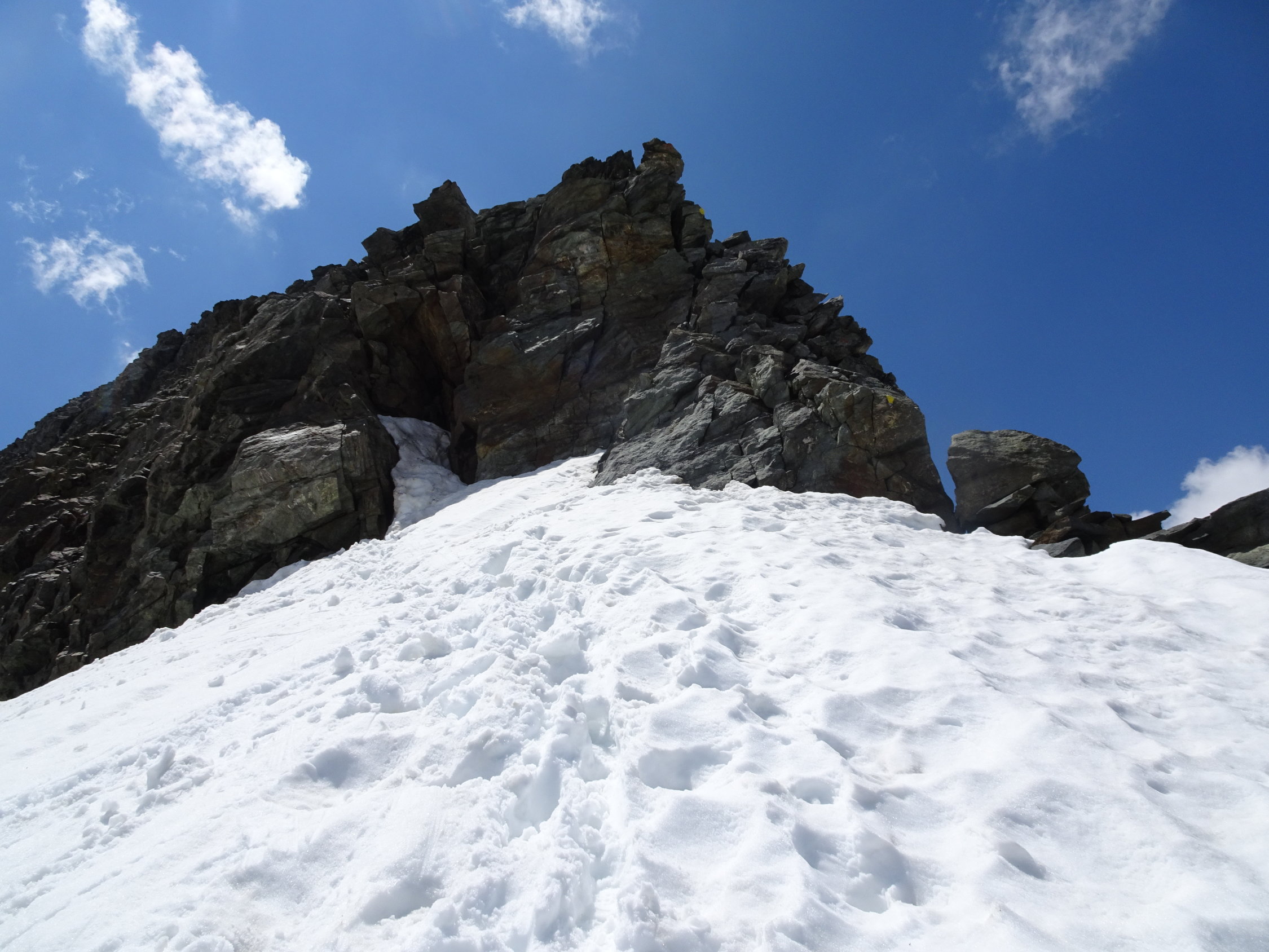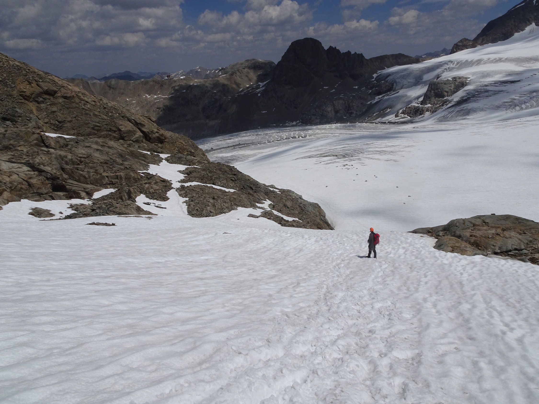 Schnee konnte nicht gefrieren, deshalb immer wieder bis Oberschenkel eingebrochen, vorallem Querung Ostgipfel-Hauptgipfel, Furocla Bellavista bis Fortezzagrat und unterhalb bis zum Persgletscher. Das hat die Tour ziemlich verlängert. Cambrenabrüche gut zu machen. Spinasgrat ist trocken.