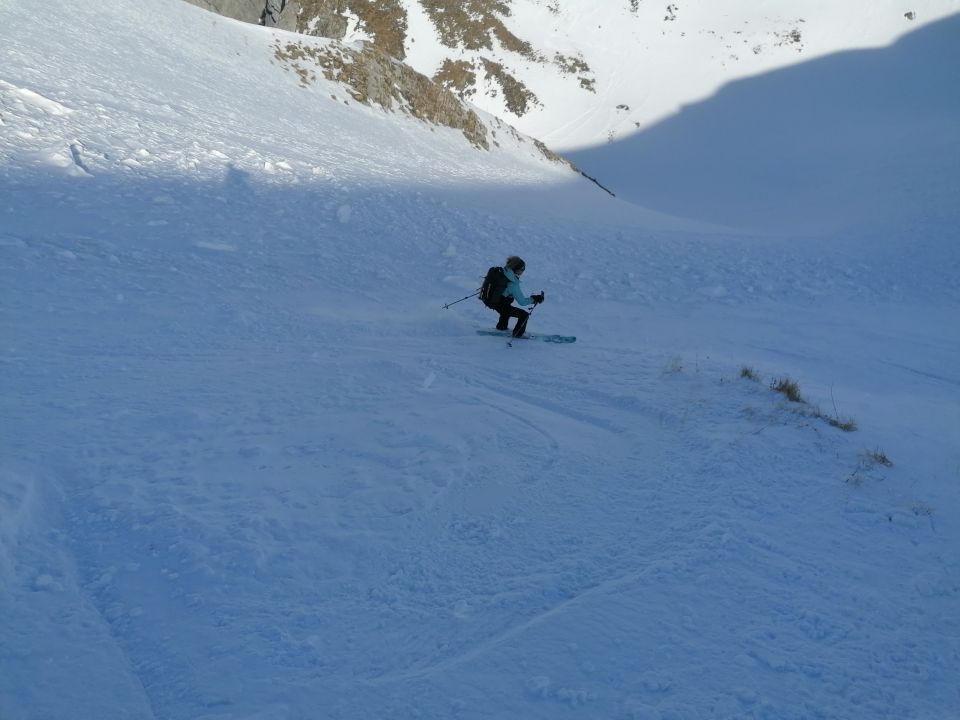 Nach der Besteigung vom Rocher Plat sind wir nach Norden ins Creux du Pralet abgefahren. Die Skiabfahrt erfolgte nach Norden ins Combe Creu du Pralet. Die Schlüsselstelle ist auf 50m 50 Grad steil. Von 1850m sind wir das Nordwest Couloir vom Rocher à Pointes bis 2100m hochgestiegen. Es ist 200m lang, und bis zu 45 Grad steil. Es ist ein Traum zwischen diesen grandiosen Kalk Formationen abzufahren. Vielen Dank an Mutter Natur, was Du uns alles schenkst!