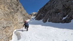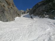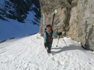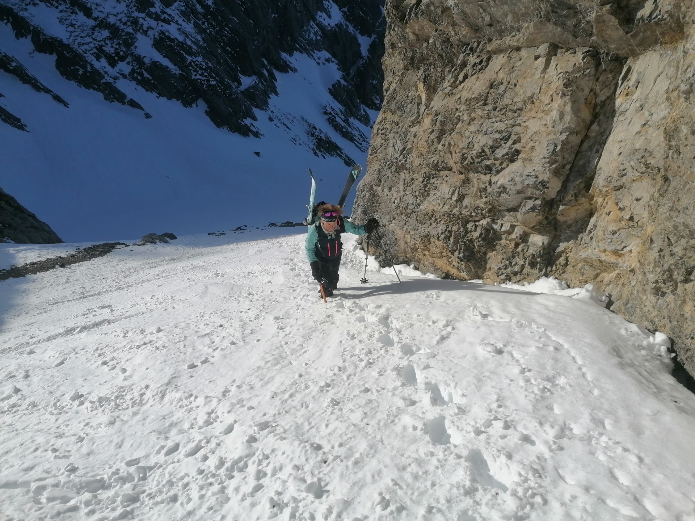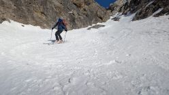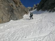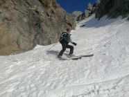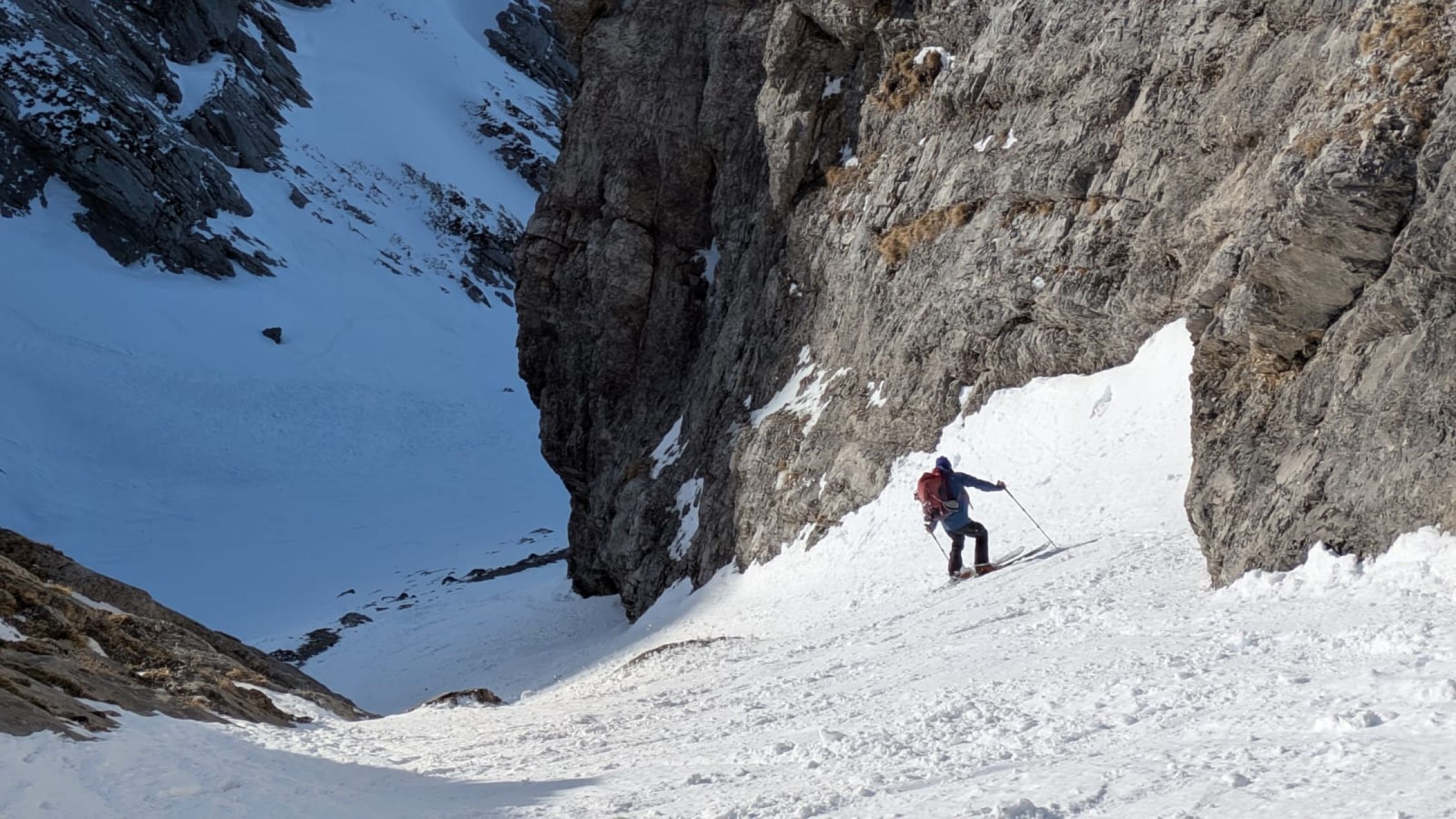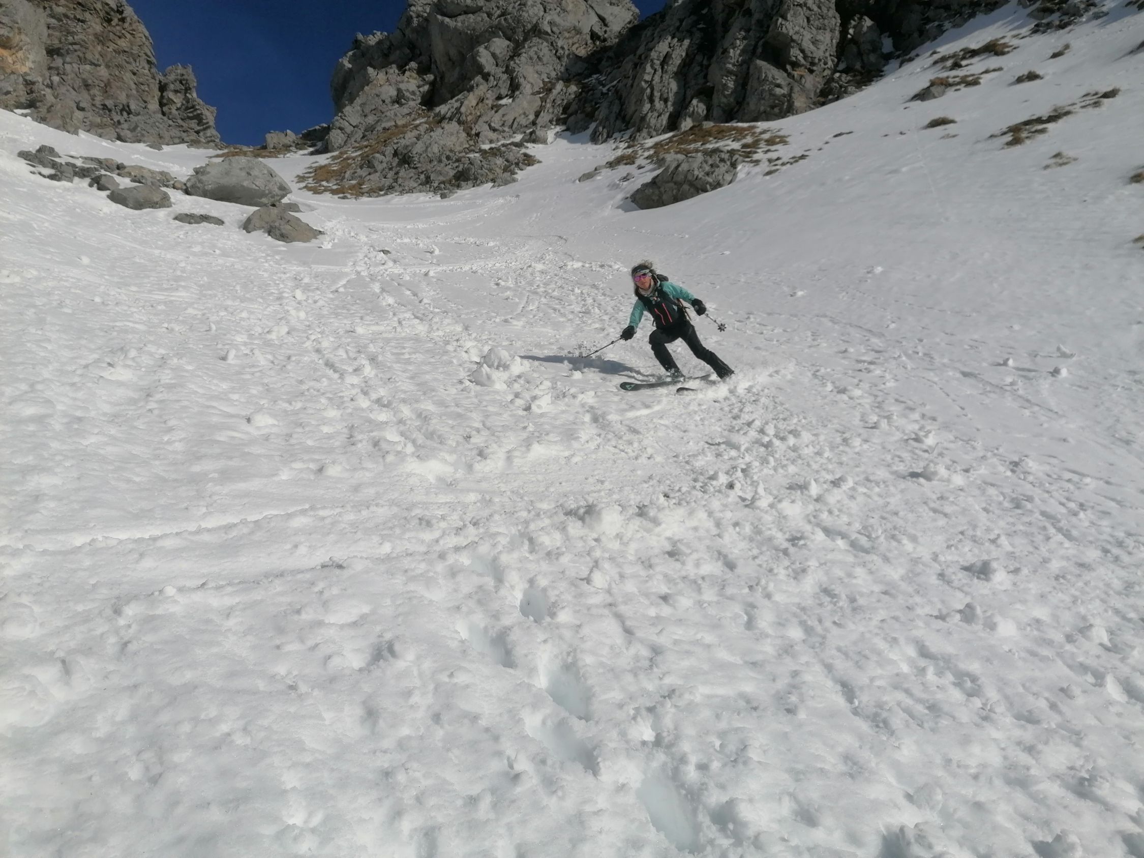 Nach der Besteigung vom Rocher Plat sind wir ins nach Norden ins Combe Creu du Pralet bis 1850m abgefahren. Die Schlüsselstelle ist auf 50m 50 Grad steil. Dann Einstieg ins Nordwest-Couloir vom Rocher à Pointes bis 2100m. Es ist ein wunderbares Culi, mit bis zu 45 Grad Neigung.