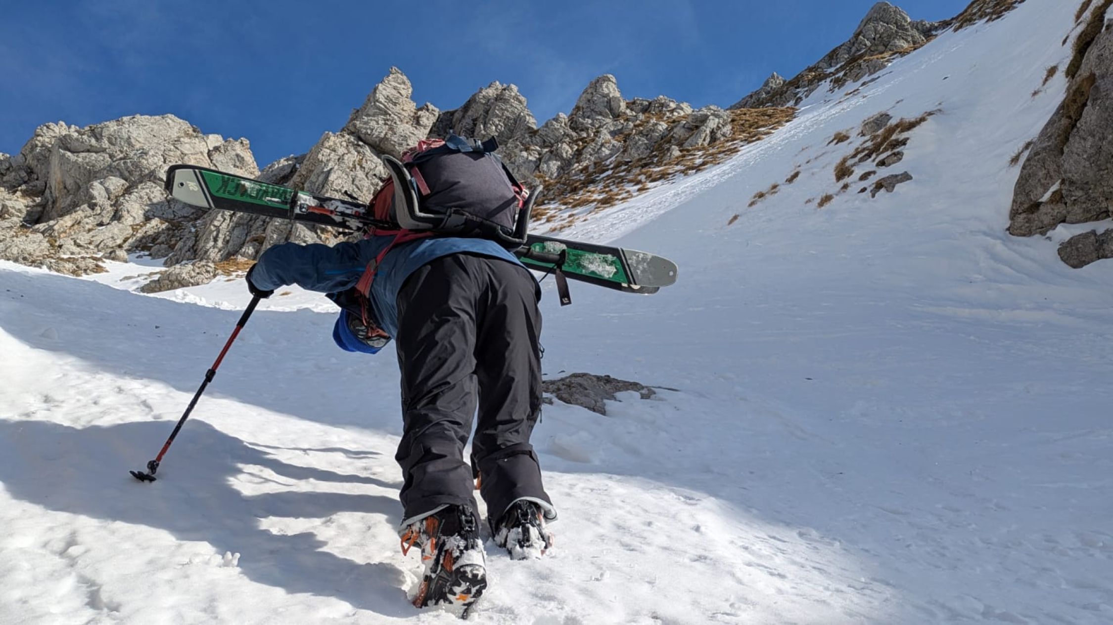 Normale Skitouren-Ausrüstung. Plus Pickel und Steigeisen.