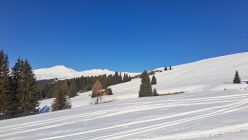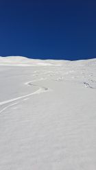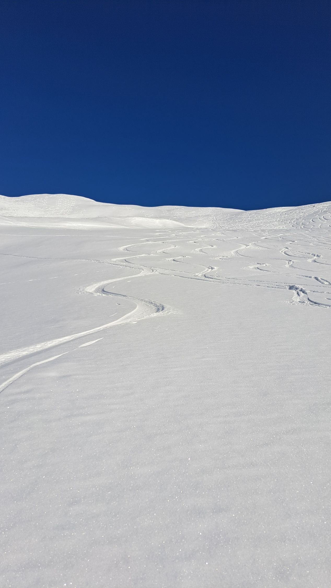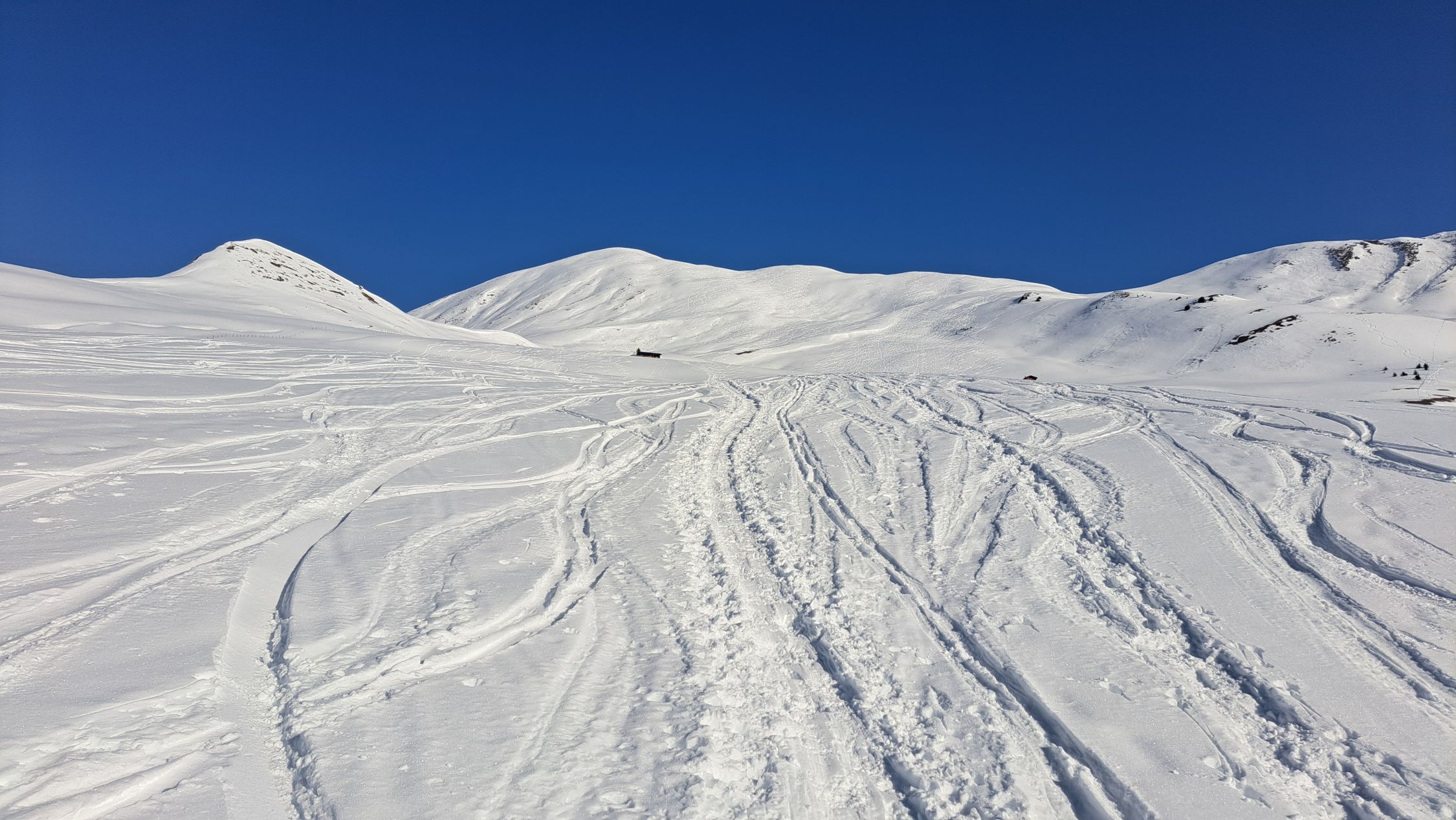 In der Abfahrt oben guter Powder bis ca. 1.800 Meter. Danach ab Pirigen auf der Fahrstrasse (hart, aber noch durchgängig befahrbar) zurück zum Parkplatz.