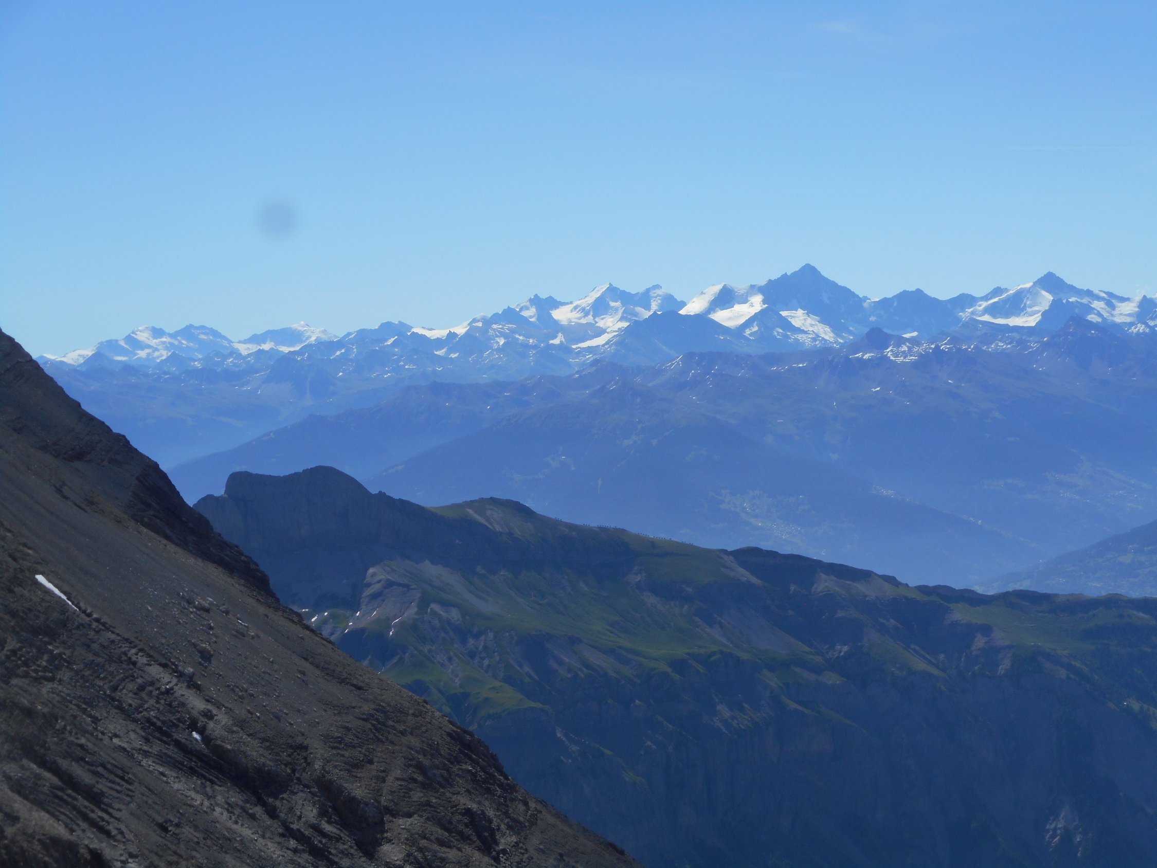 Les Diablerets d.h. die Teufelshörner. Wir haben den Teufel nicht gesehen oder angetroffen. Um das gewaltige Massiv an der Sprachgrenze zwischen deutschsprachiger und französischer Schweiz ranken sich viele Legenden, schliesslich gaben Teufelchen ihm seinen Namen. Es handelt sich hier um eine Gebirgsgruppe in den Waadtländer-Alpen. Oestlich vom Sex Rouge befindet sich das dreiecksförmige Oldehore 3123m. Auf seinem Gipfel treffen sich die Kantonsgrenzen von Bern, Waadt und Wallis.