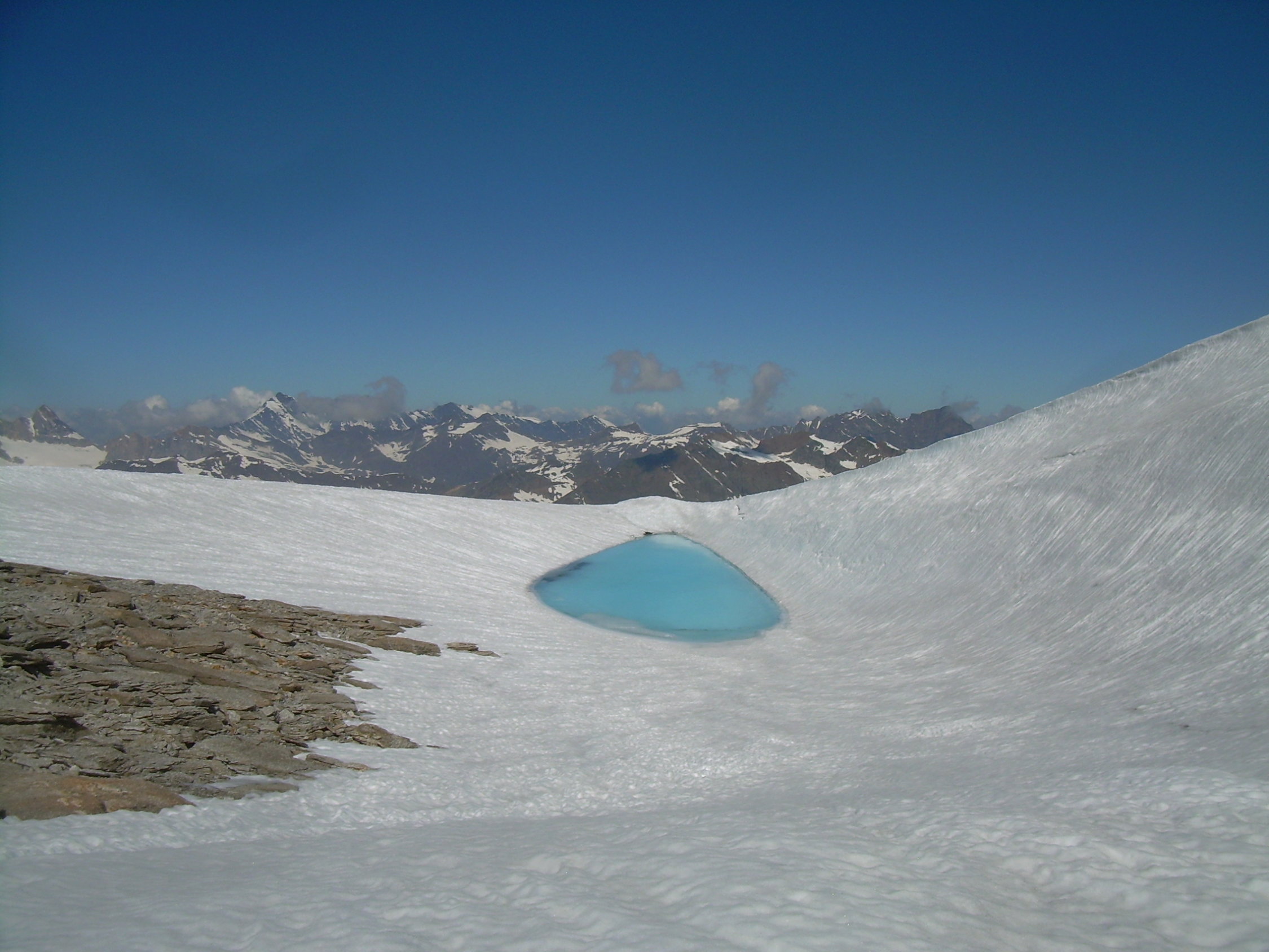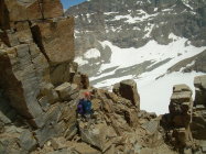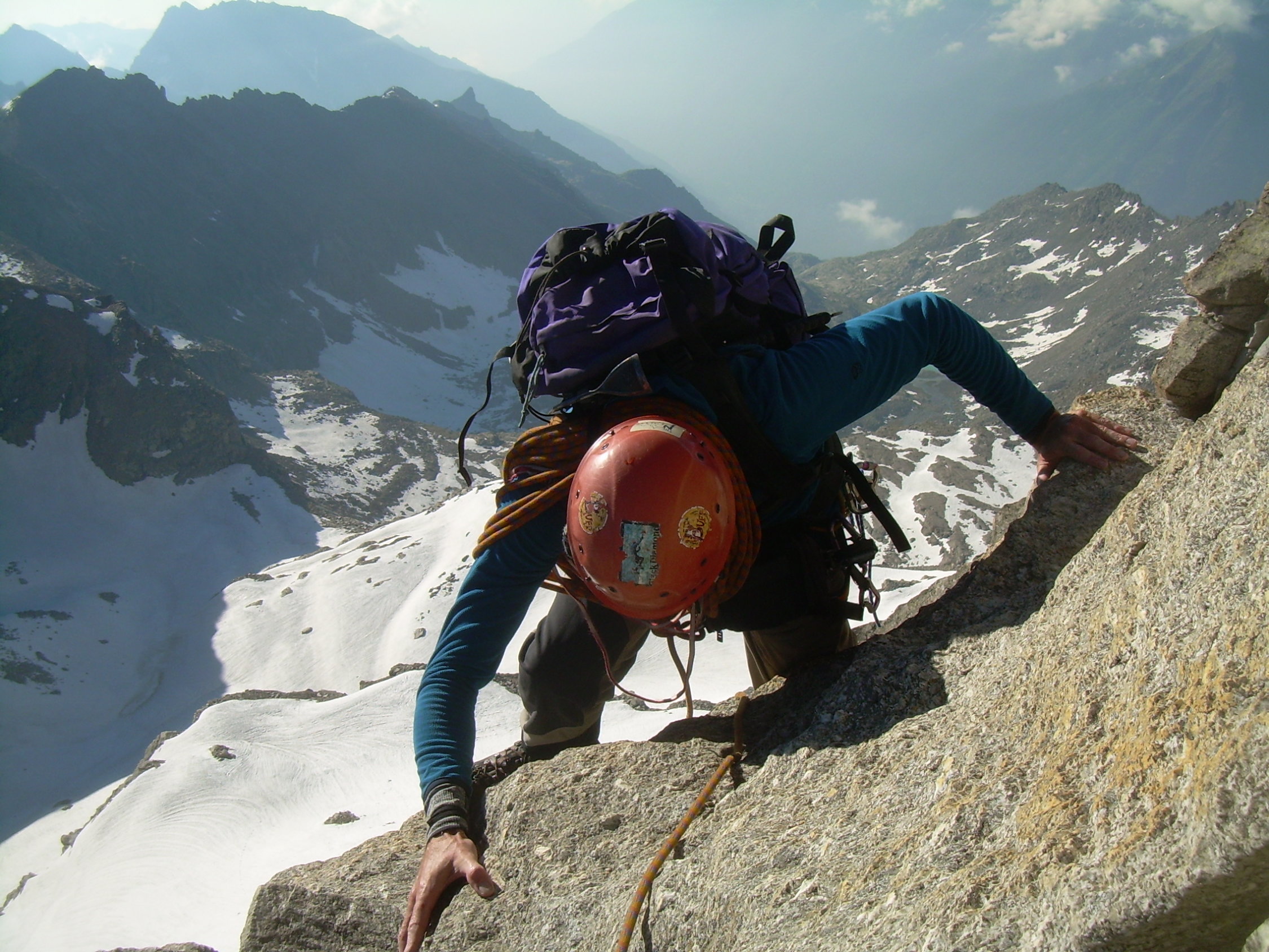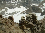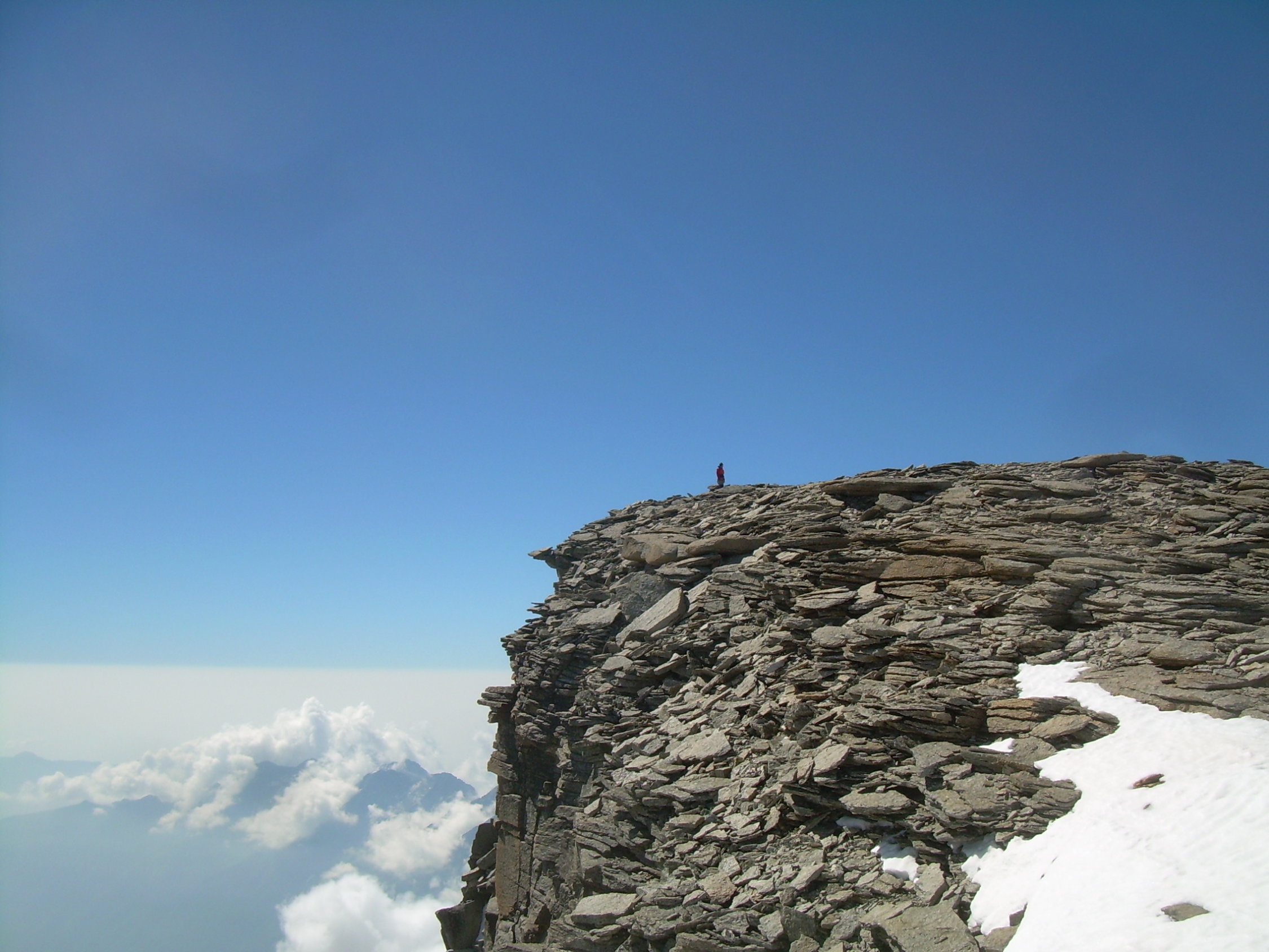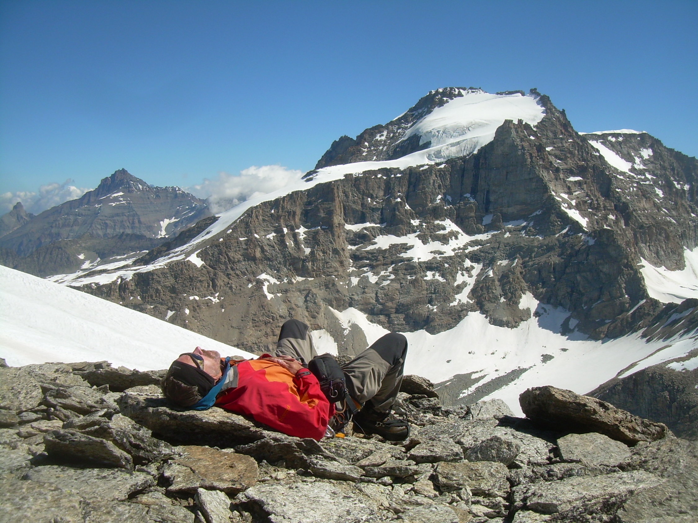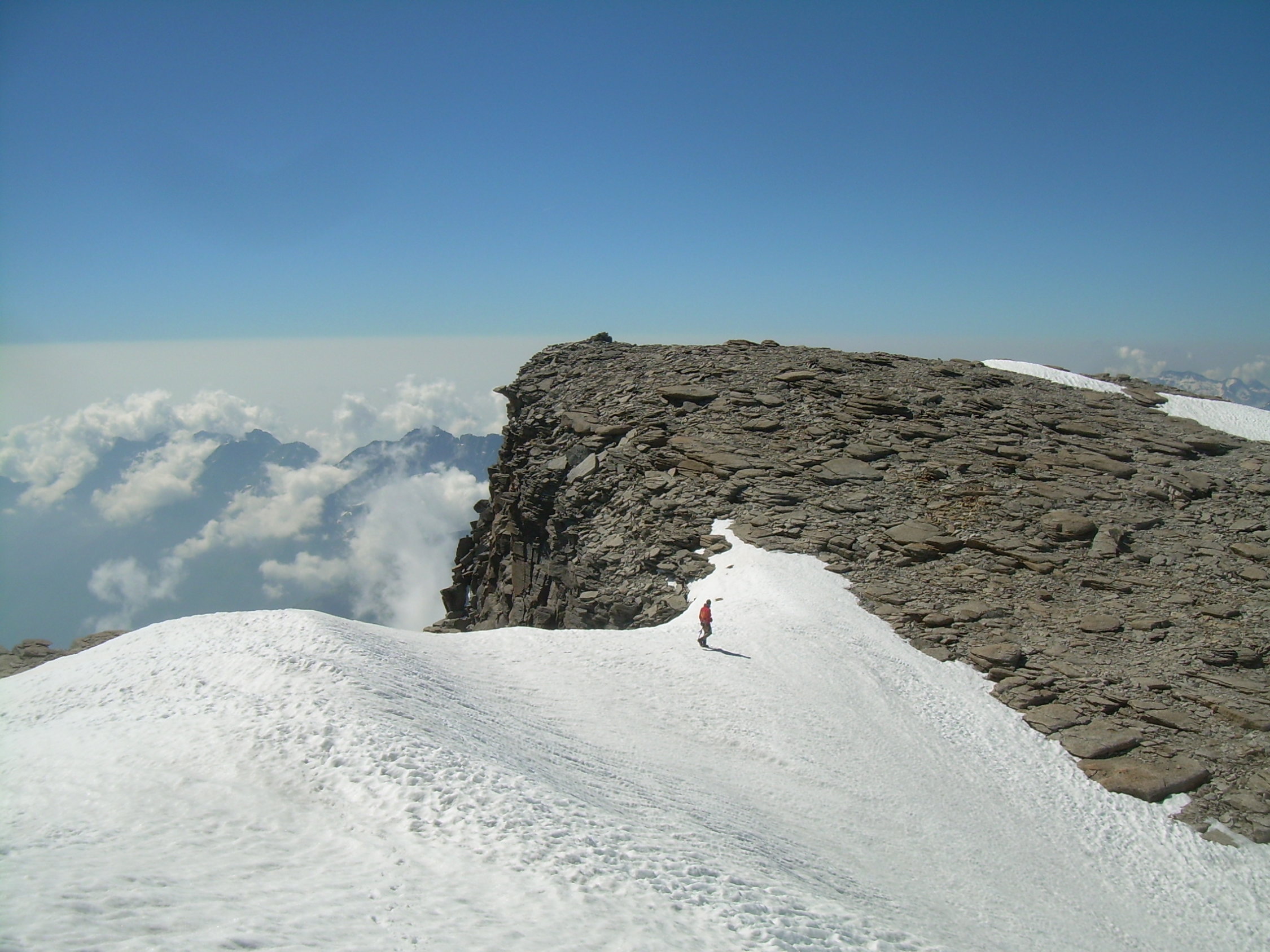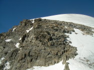 Trotz eines frühen Aufbruchs und klarer Nacht zeigte sich der Firn ziemlich aufgeweicht. Es war einfach zu warm. Nachts war heftiges Gepolter aus der Nordwand des Ciarforon zu hören. So, wie diese Wand derzeit aussieht, ist es für uns kaum vorstellbar, dass sie in Zukunft nochmal begangen werden könnte. Wir verbleiben dann auch im zweiten Teil des Gipfelanstieges, oberhalb des Firnsattels, weiterhin in den Felsen und stiegen erst an der Gipfelkalotte durch den auch dort ziemlich durchweichten Firn. Mit uns waren zunächst ein älterer italienischer Bergführer mit einem englischen Gast unterwegs. Als die beiden vorzeitig umkehrten, hatten wir den Berg endgültig für uns, während drüben an der Normalroute des Gran Paradiso wie üblich Karawanen unterwegs waren.