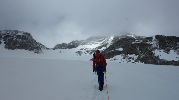Aufstieg am Samstag zur Sesvenna Hütte. Am Sonntag Start ca 7Uhr bei bedecktem Himmel, der sich den Tag über nur vereinzelt für ein paar Sonnenstrahlen öffnete. Es war auch immer wieder leichter Regen, oder im Gipfelbereich auch Schneefall dabei. Ab ca 2800 aufwärts blieb der Schnee auch liegen. Sprich auch der Gletscher war nirgends blank, im oberen Bereich des Gletscher auch bis über die Knie eingesunken. Bis zum Beginn des Ostgrats gespurt, da die einzige andere Seilschaft die Route über den Winterweg wählte. Am Grat Blockkletterei - selten ausgesetzt,aber da der Fels nass oder schneebedeckt war, durchaus kein Spaziergang. Immer wieder mussten glatte Blöcke und tiefe Felsspalten überklettert werden.