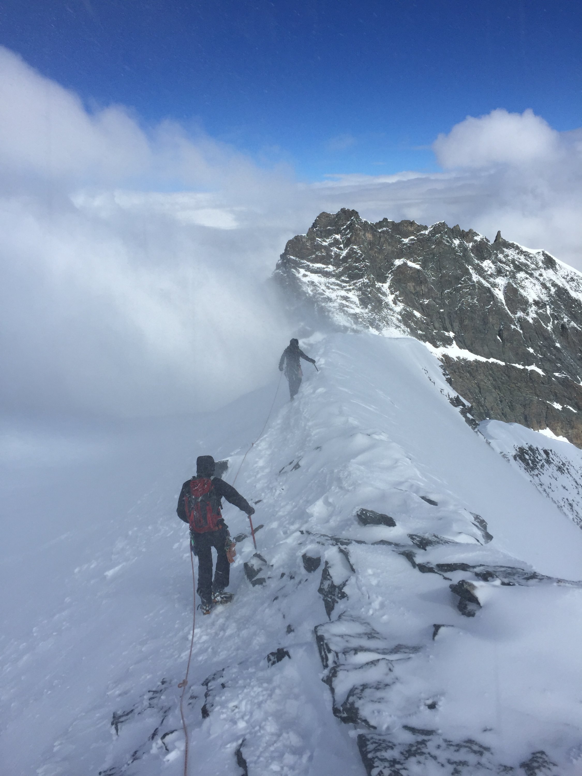 Ausserordentlich wenig Schnee für die Jahreszeit. Die Spalten sind dennoch mehrheitlich gut zugeschneit. Einzig auf ca. 3'300m sind wir das eine oder andere Mal mit dem Bein ins leere getreten. Die 5h (eher 4h) Aufstieg von der Hütte sowie auch der Weg von Felskinn bis zu Hütte (1h25 - eher 45 Min.) sind grosszügig bemessen.