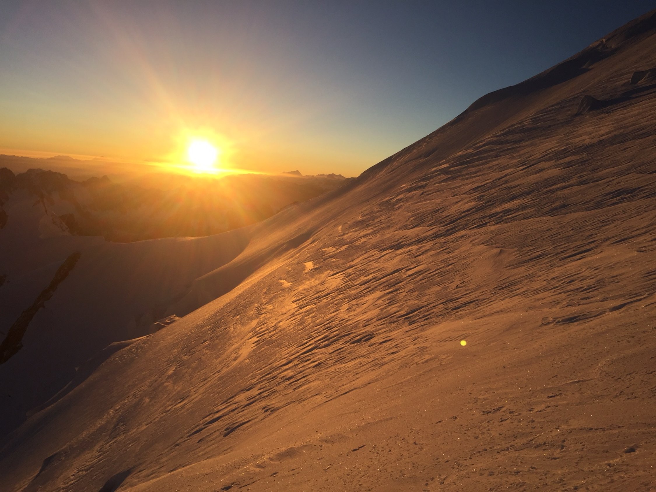 Top Verhältnisse ab dem Refuge du Goûter. Guten Trittschnee mit einer schönen Spur. Das Goûter Couloir ist auch noch gut, solang die Sonne nicht in die Wand scheint (vor 10:15). Sobald, dass die Sonne da ist, fangen die Steinschläge an.