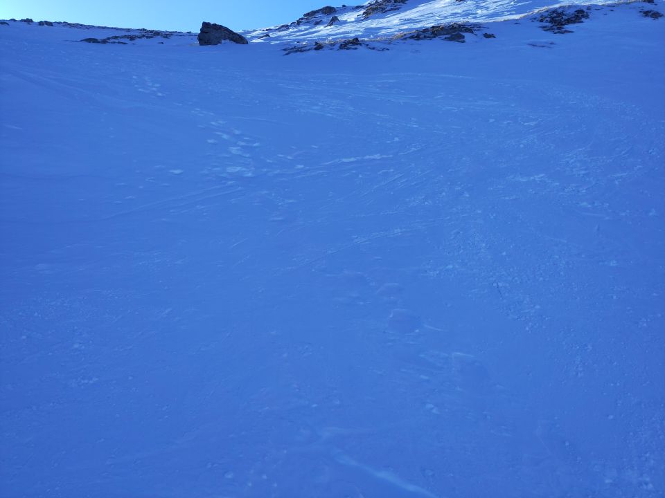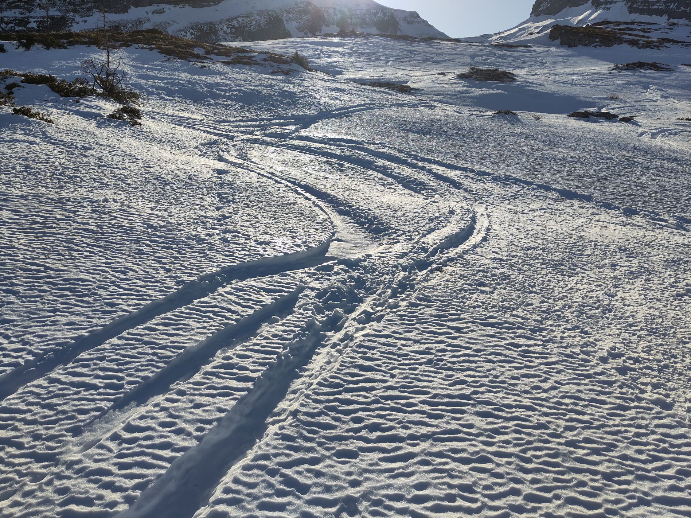 Viel begangene Route, die Spuren sind vereist. Oben gibt es nicht viel Auswahl für die Abfahrtslinie, alle rutschen dasselbe Stück runter (1. Bild). Wenn mann einen Gegenanstieg über Punkt 1898 in Kauf nimmt, findet man noch etwas Pulver (2. Bild). Die Schneedecke ist dort aber leider nicht durchgehend, da mehr Sonne hinkommt als an der östlichen Wand des Tals.