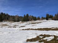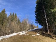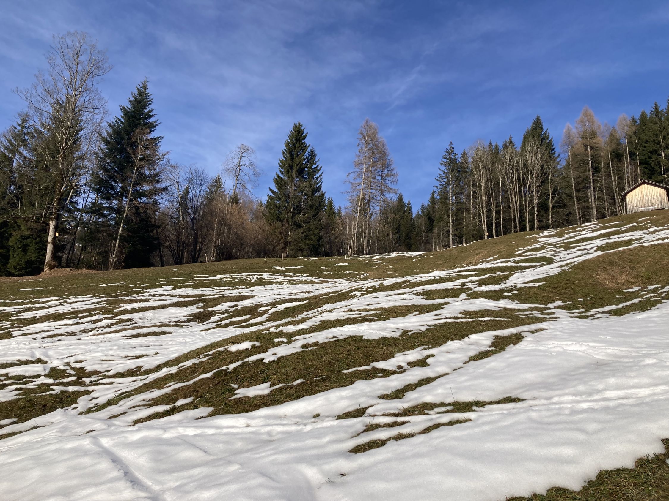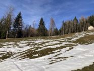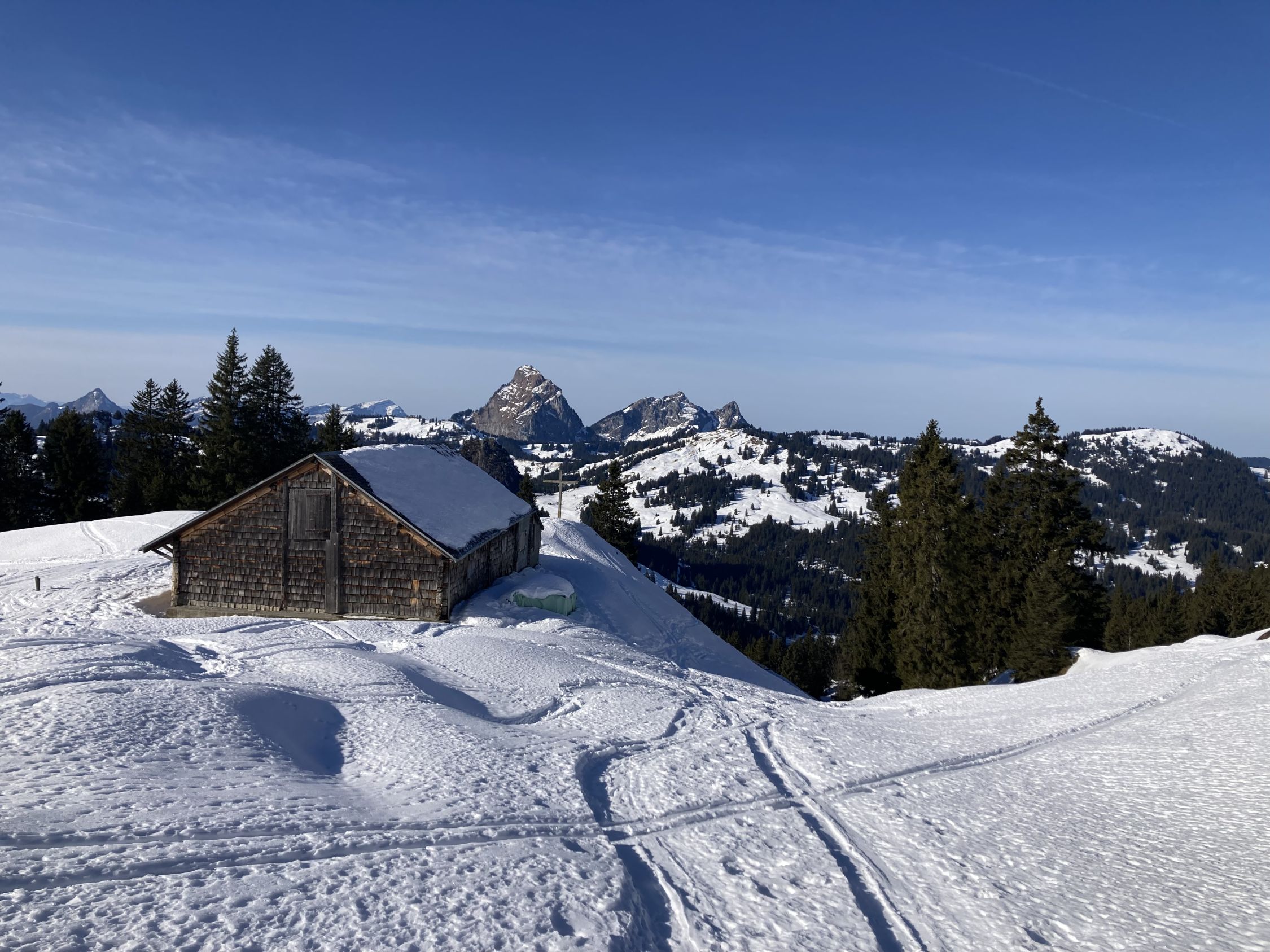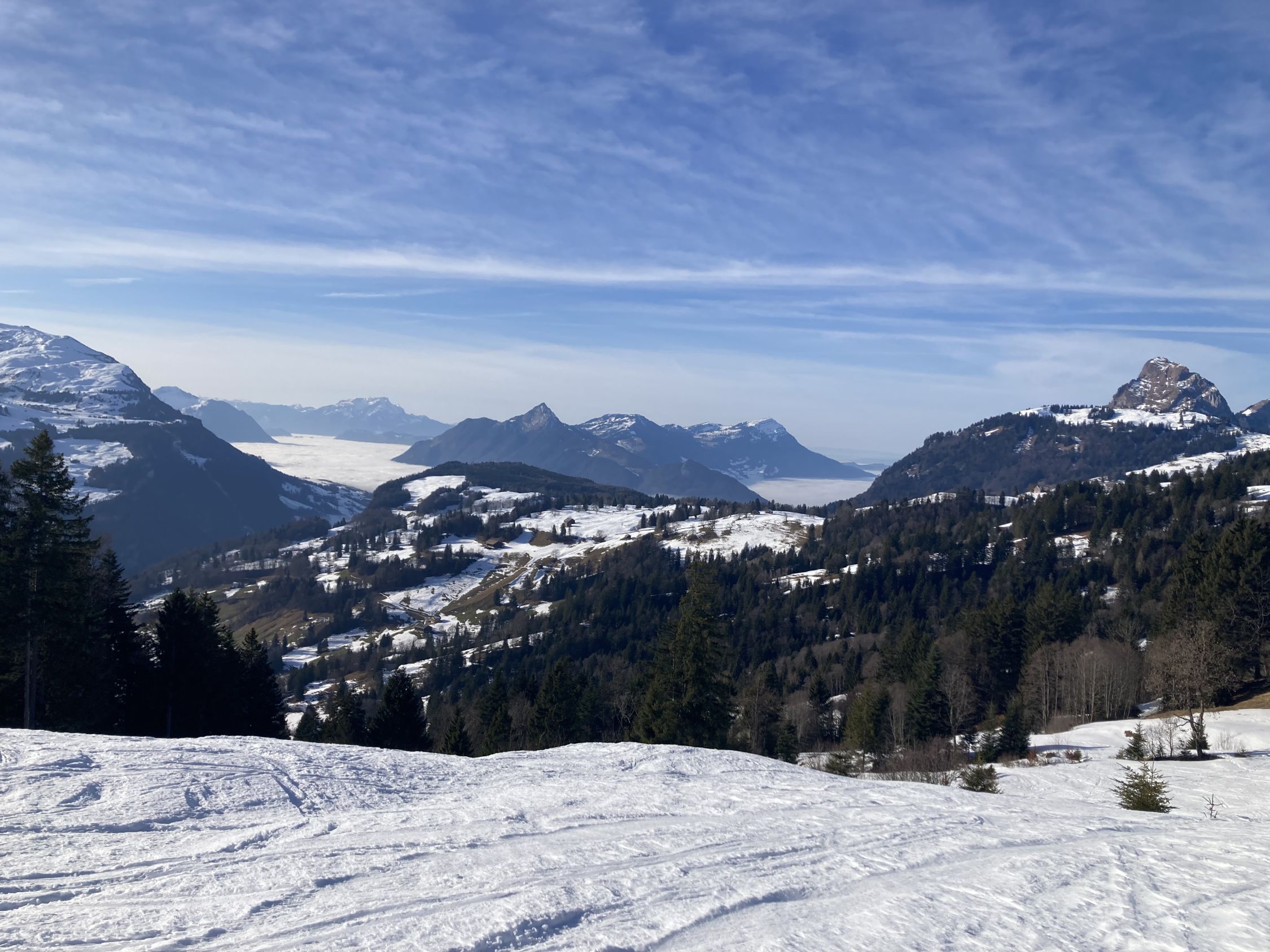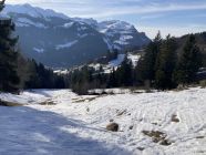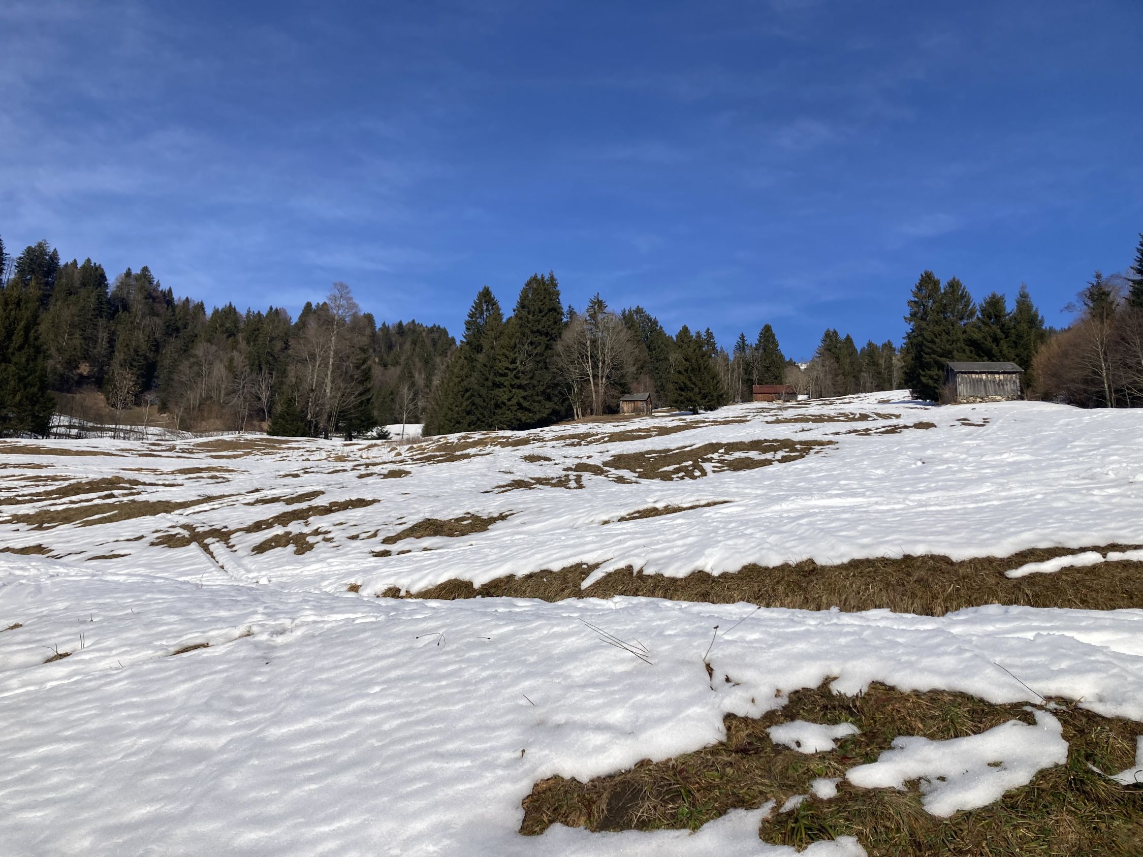 Abfahrt nordwärts eher nicht so lohnend, sehr zerfahren und Schneequalität zweifelhaft, also auf, bzw. ab nach Illgau, in der Hoffnung auf weichen Schnee. Et voilà: dort wo die Sonne hin scheint, liegt schöner Sulz. In den schattigeren Zonen hart, z.T. etwas ruppig, z.T. pistenähnlich; aber alles gut zu fahren. Unten schmilzt der Schnee rasch, die grünbraunen Lücken werden grösser und die Mäuse sind schon fleissig im Bergbau (-aushub) tätig! Oder sind es die Maulwürfe? Keine Ahnung, aber die Skier sauber zu halten ist eine Herausforderung! Jedenfalls hat die Abfahrt viel Spass gemacht, bei süferliger Fahrweise (erste Skitour diesen „Winter“), und die Skier blieben dran bis zur Strasse runter. Gute ÖV-Anbindung in Illgau mit der Gondel und dem Bus unten im Tal.