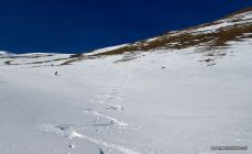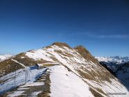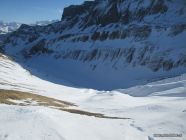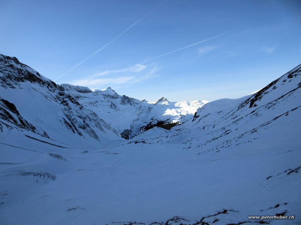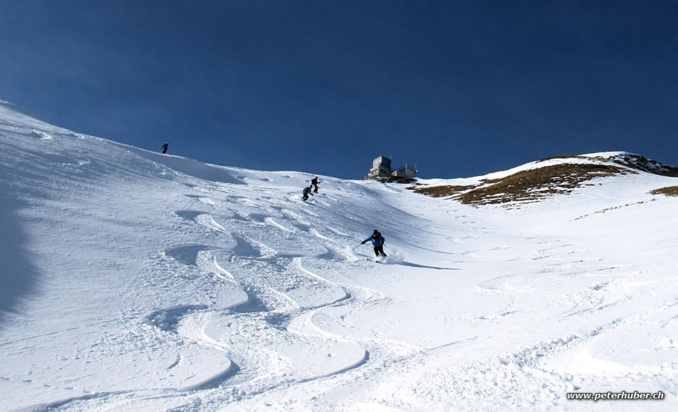 Die Abfahrt ins Litschentellti war auch erstaulich gut. Ganz oben etliche Grasflächen. Dann viel Pulverschnee, gelegentlich mit einem leichten Deckel. Abfahrt bis zu dem Alphütten bei P 1849. Von da auf der Alpstrasse flach nach Chiemad gequert, mit Schieben geht es gerade so. Und dann auf der Piste zur Talstation.