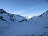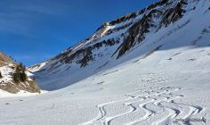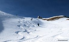 Abfahrten: Wir sind zweimal ein Stück den Südosthang ins Oltschibachtal abgefahren. Lockerer Pulverschnee in den Nordhängen und etwas Feuchtschnee waren toll zu fahren. Es hatte nur ganz wenige alte Spuren.
