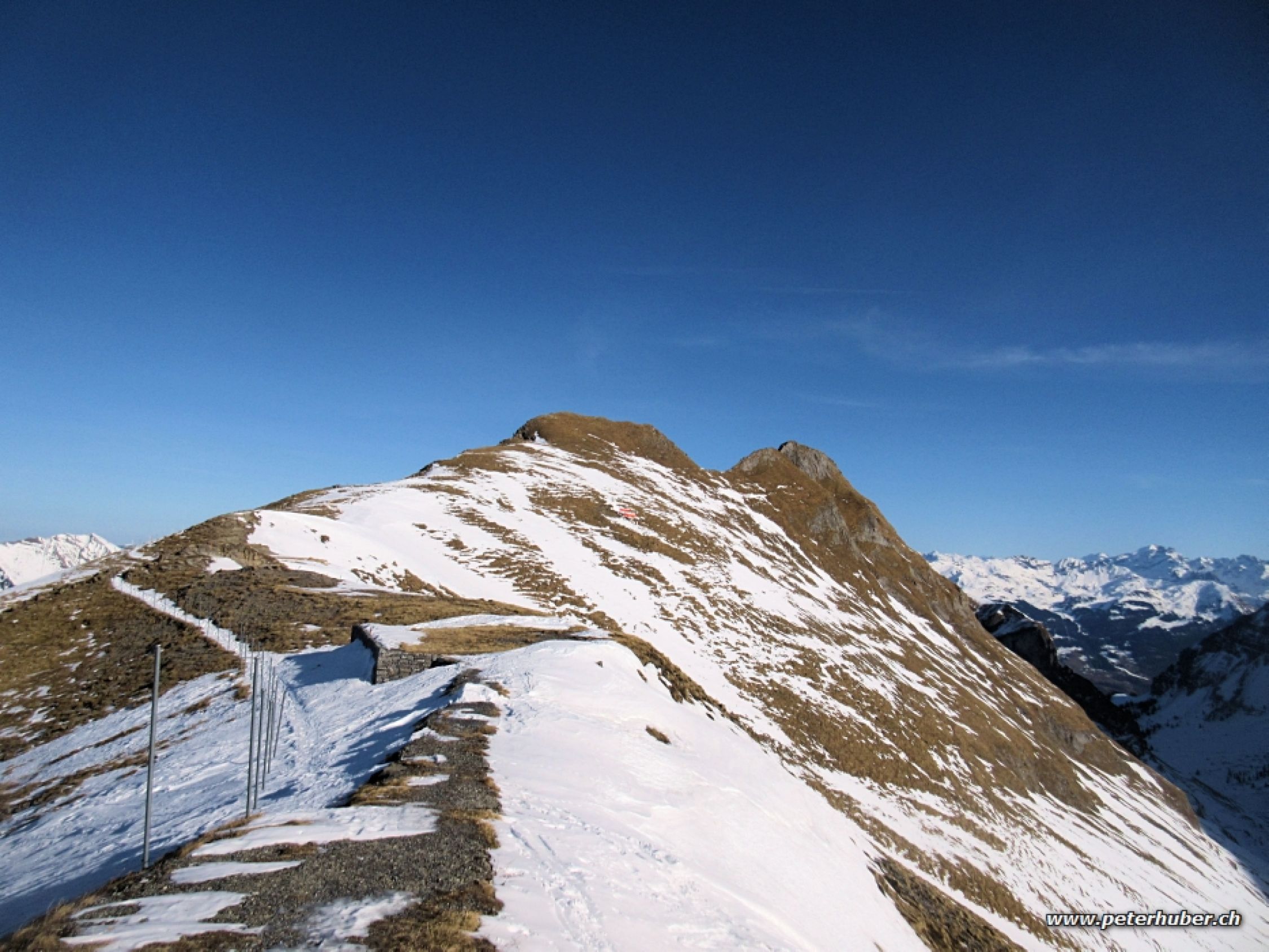 Freundlicher Startkaffee schon um 9:30 Uhr an der Bergstation. Es hat genug Schnee für den ganzen Aufstieg. Der obere Teil des Litschentellti ist auf beiden Flanken stark abgeblasen. Ebenso die letzten 100 Hm zur Bergstation hinauf. Vom oberen Militärgebäude zum Wintergipfel fehlt der Schnee fast vollständig. So haben wir ihn ausgelassen.