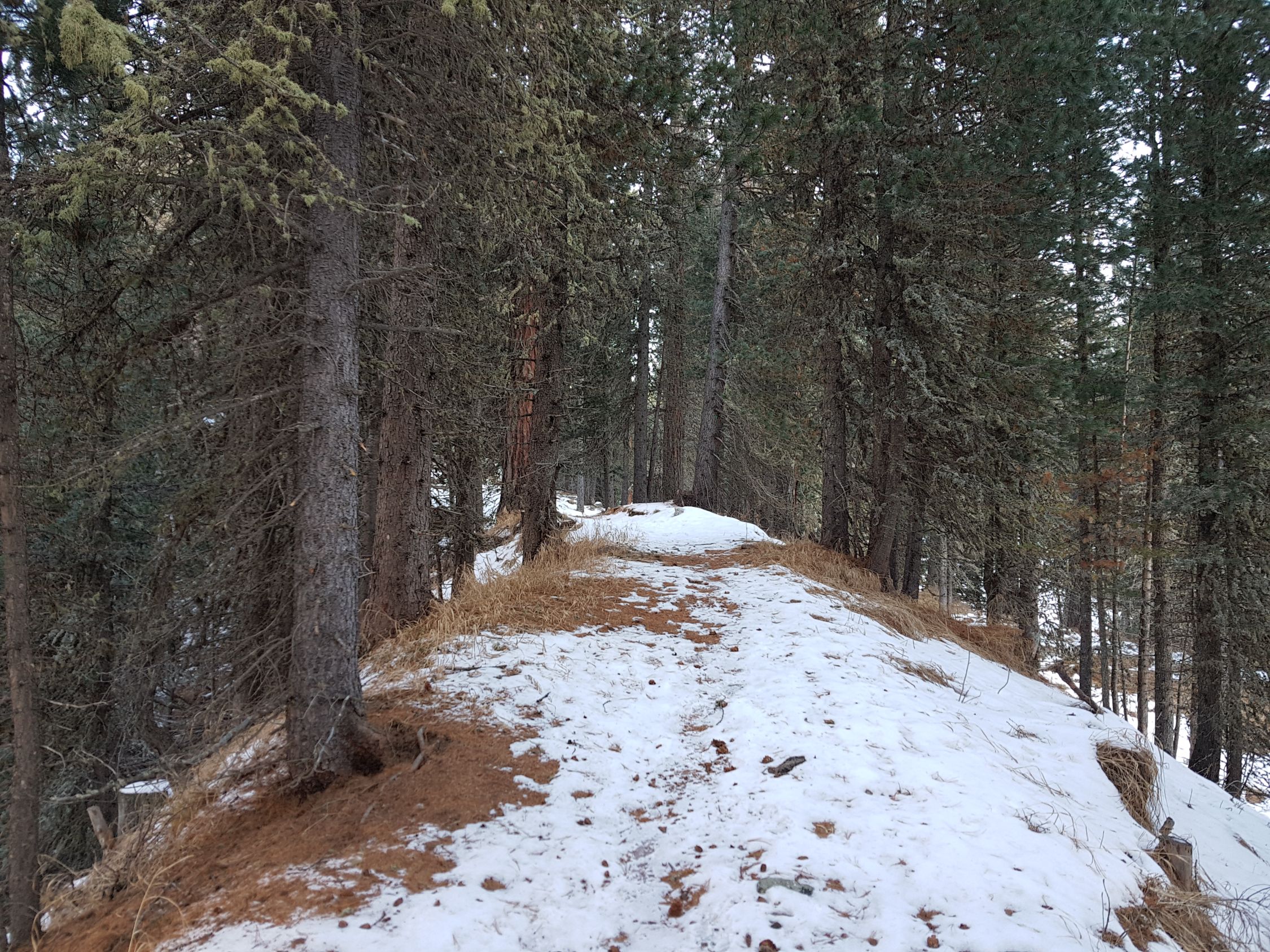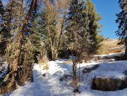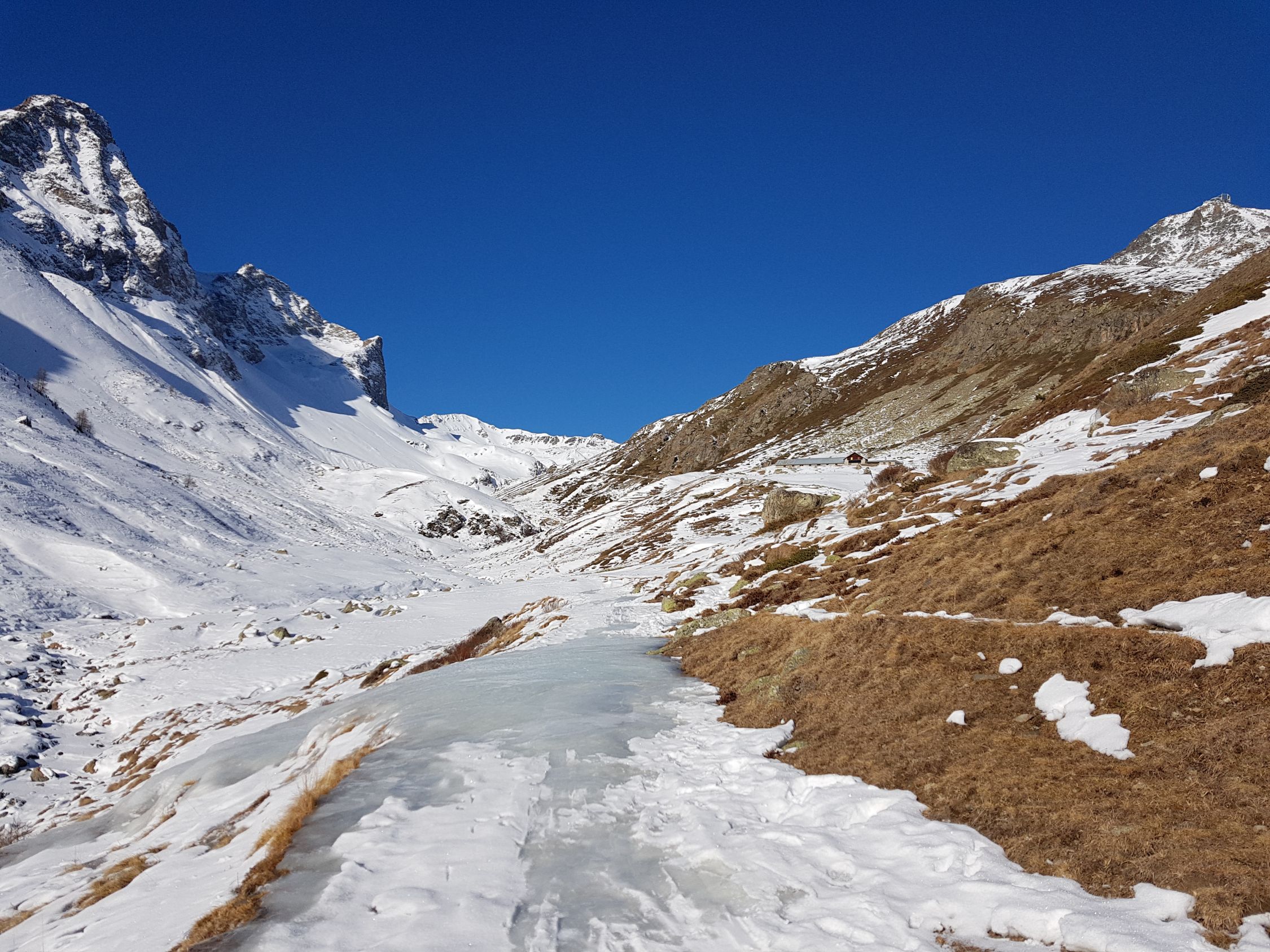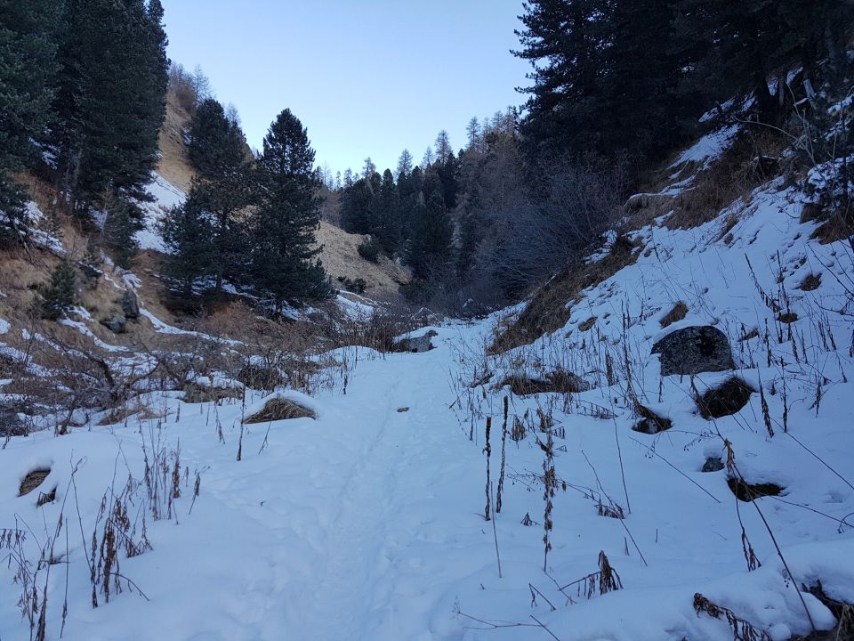 Ab Champfèr Guardalej auf dem Wanderweg, zuerst auf knapp- und kurz danach schon auf sehr wenig Schnee mit ein paar aperen Stellen, dennoch alles mit angeschnallten Ski, hoch zu P2013, wo der Alpenweg mit einer guten Unterlage von P1994 herkommt. Eine Abfahrt von P2013 nach Champfèr ist aktuell nicht möglich, hoch jedoch auch nur, wenn man als ÖV-Tourist nicht die langgezogene geteerte Strasse von St. Moritz Somplaz hochlaufen möchte. Der Alpenweg im Val Suvretta da San Murezzan ist durchgängig, hat aber nicht überall wirklich viel Schnee. Hier sind viele kurze, aber tückische Eispassagen zu durchlaufen (siehe Bild). Der Bach war jedoch gut eingeschneit und lässt sich nirgends Wasser entnehmen.