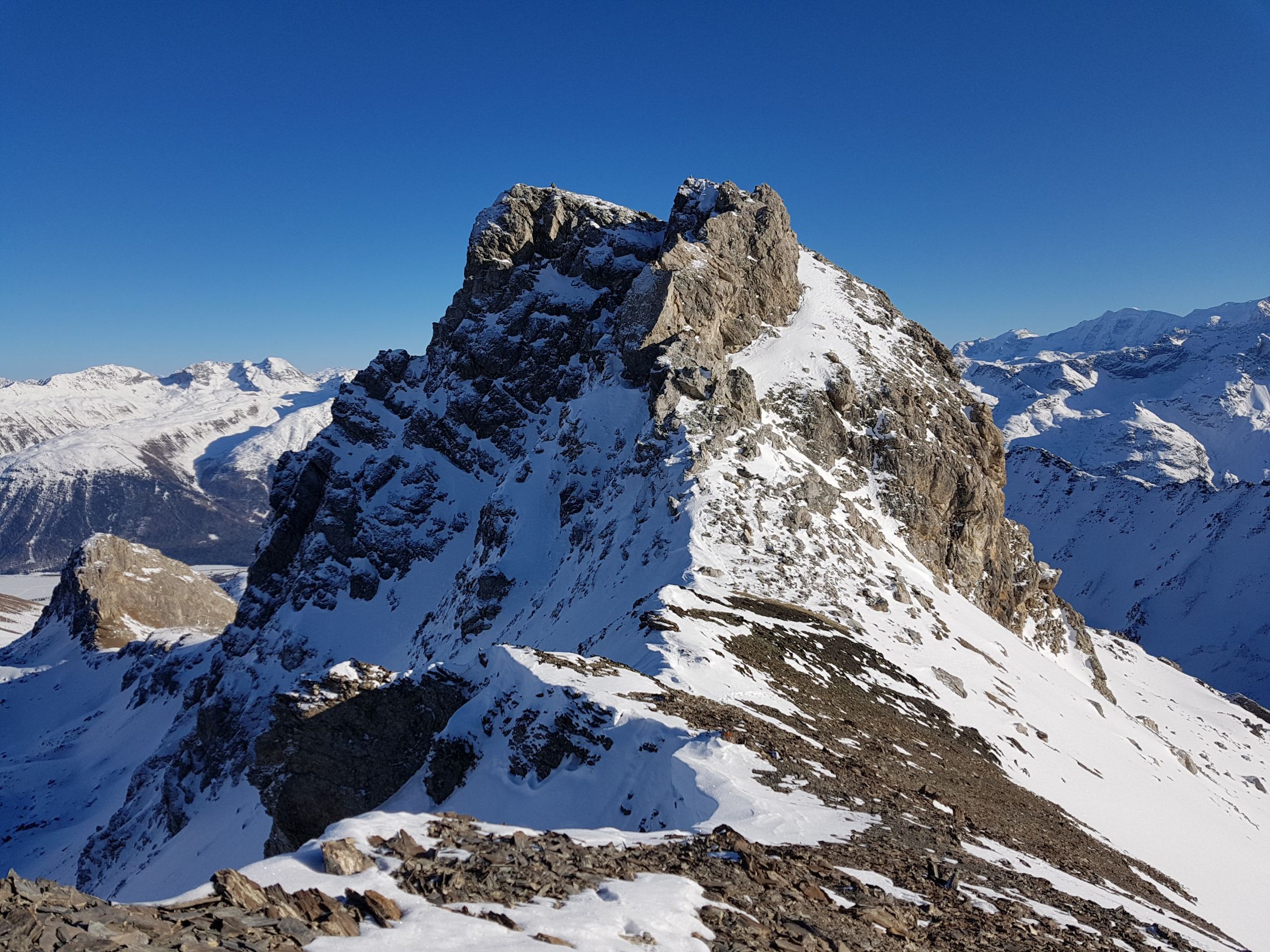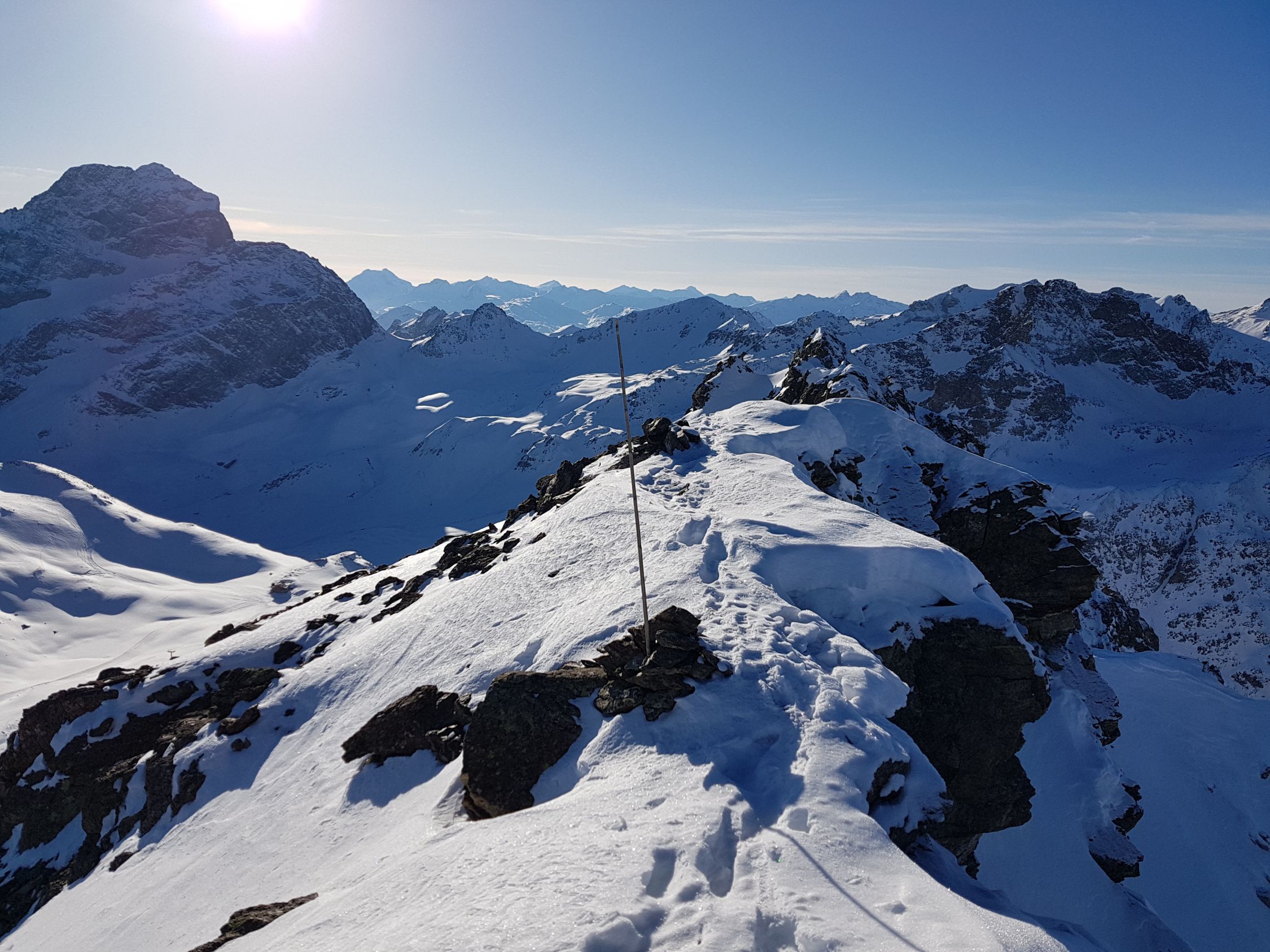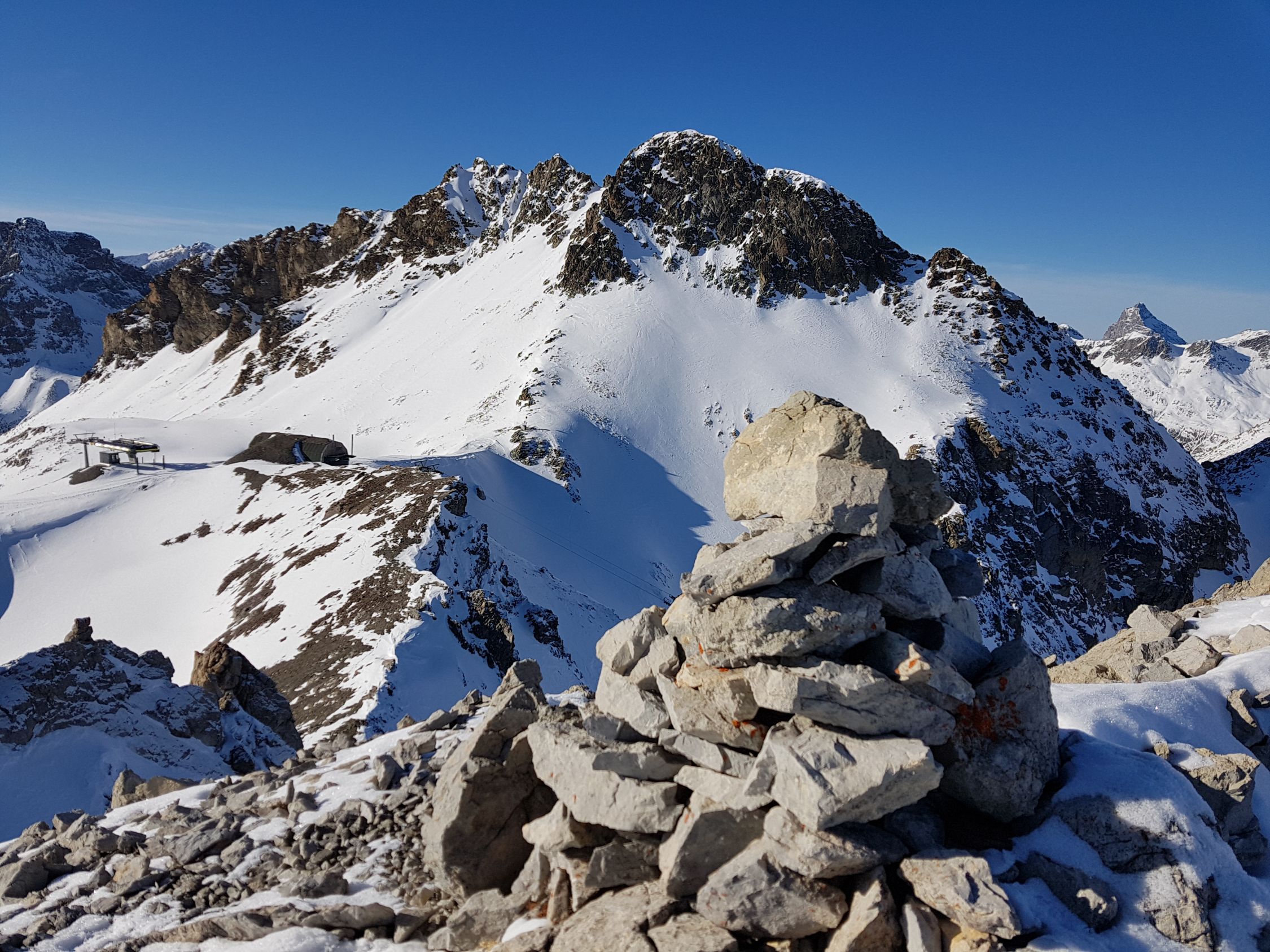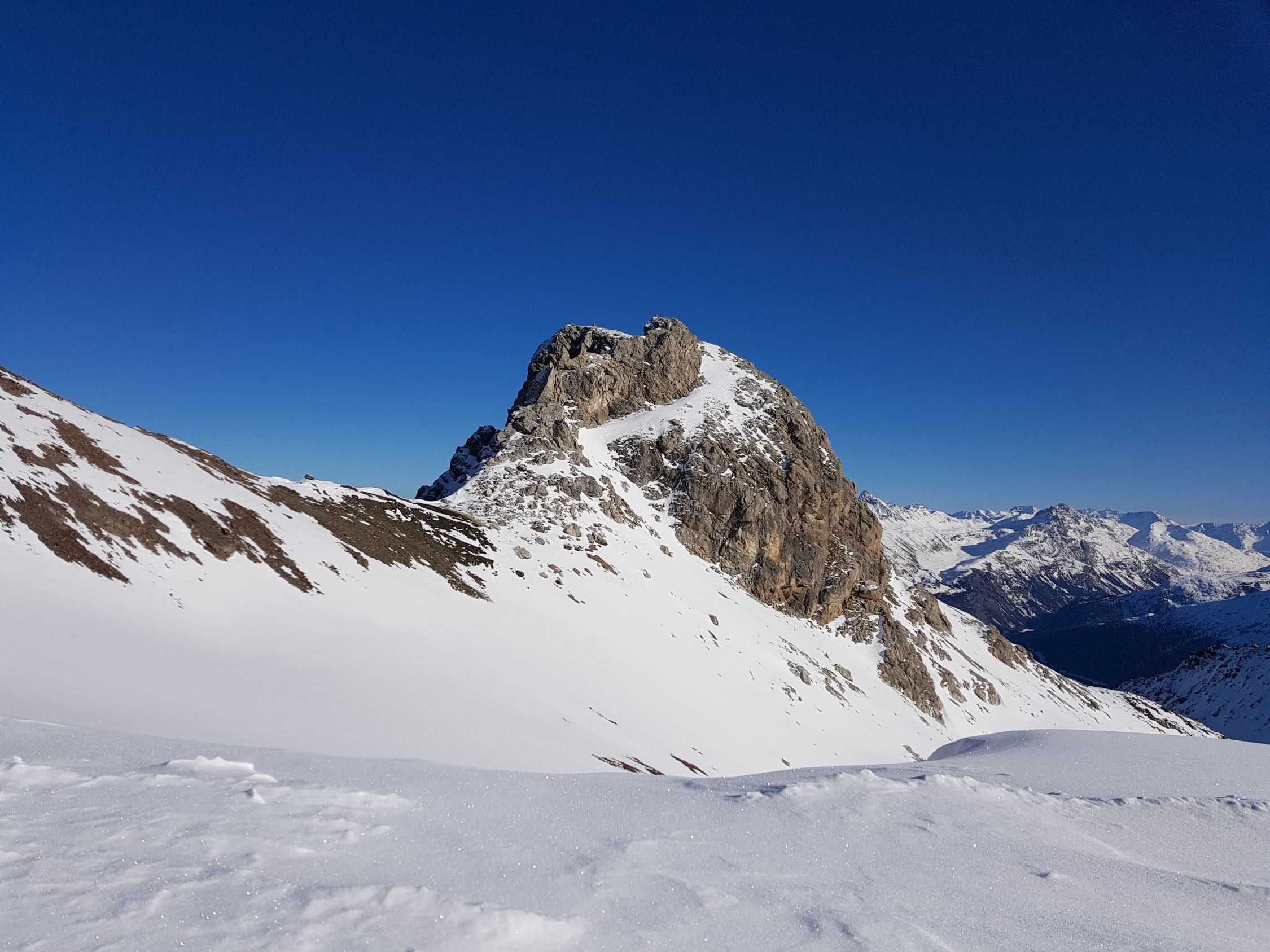 Nach einer kurzen Abfahrt und einen kleinen Fussaufstieg stehe ich schon 10 Minuten nach meinem Aufbruch vom Piz Nair auf dem Term da la Pêsch. Ich laufe ein paar Meter auf dem W-Grat hinab, nehme meine Felle ab und fahre die Traverse hinüber zur Fuorcla Schlattain (P2872) und klebe meine Felle nach nur 3 Minuten wieder an. Aufgrund der vielen herausragenden Steine würde hier eine Fellabfahrt die Felle zerschneiden. Dann doch lieber einen Kratzer mehr im Ski… Ich laufe die raue Piste hoch zur geschlossenen Bergstation des Sessellifts kurz vor der Fuorcla Grischa. Ich steige mit den Ski leicht absteigend den E-Grat des Piz Schlattain und mache Skidepot. Ich stampfe Knie- und Hüfttief, immer scharf unter den Felsen, wo ich mich bei einem Schneerutsch halten könnte, auf einen schrägen Felsband hoch und zuletzt über Kies und Schnee unschwierig via Vor- zum Hauptgipfel des Piz Schlattain mit Steinmann (I). Eine Abfahrt direkt vom Gipfel erschien mir heute nicht als vertretbar.