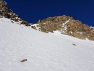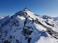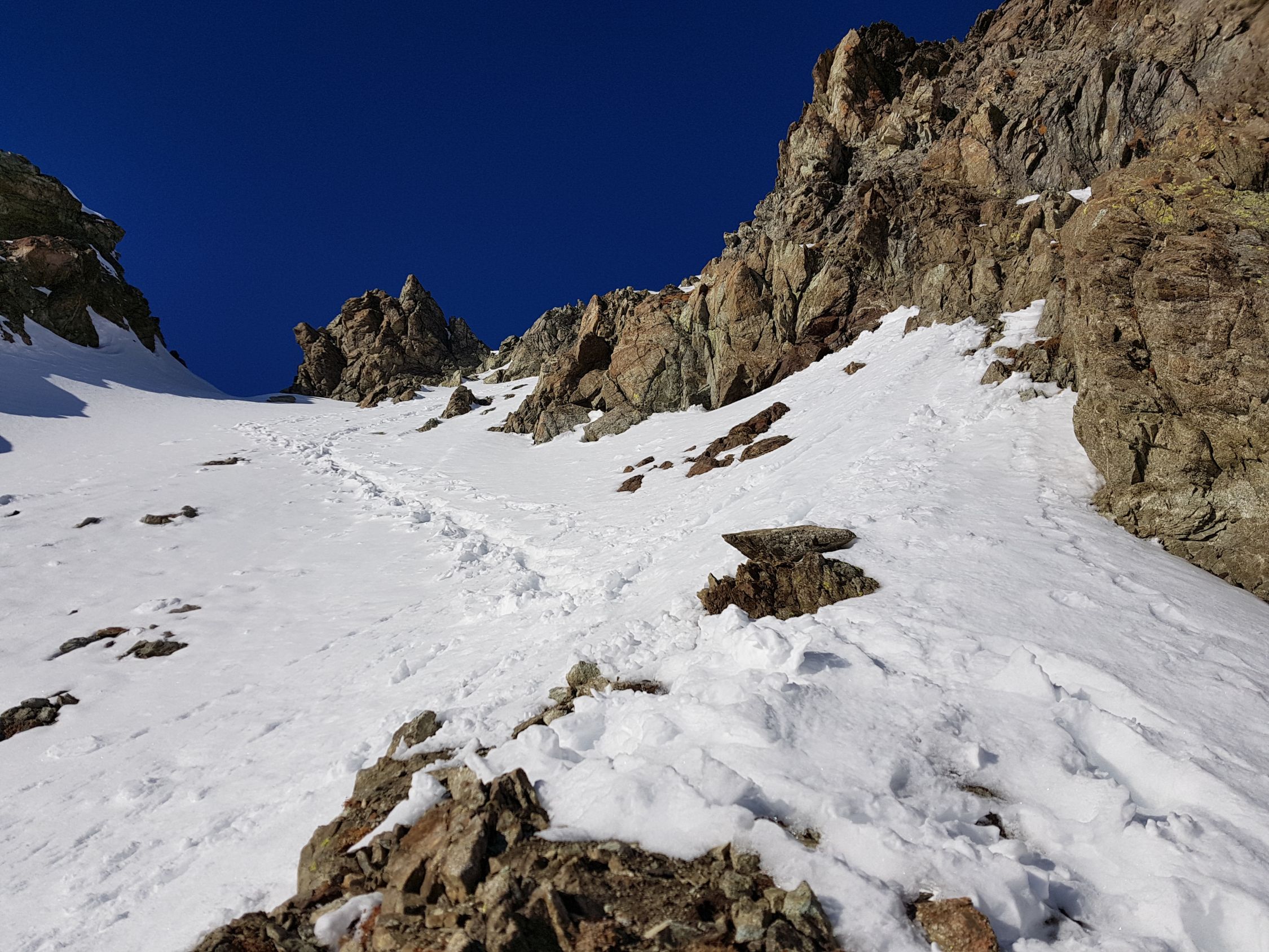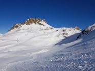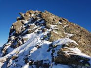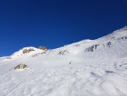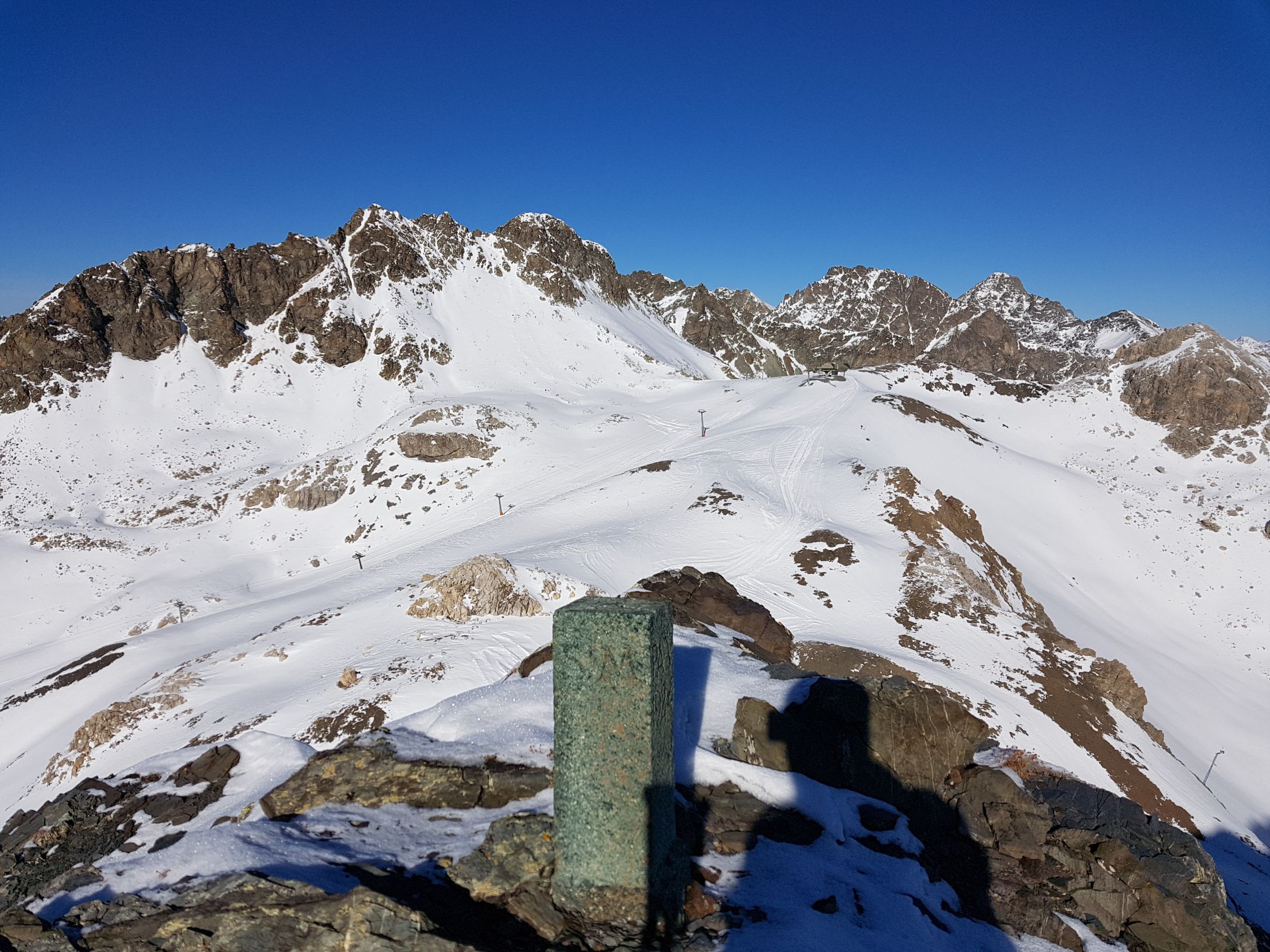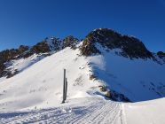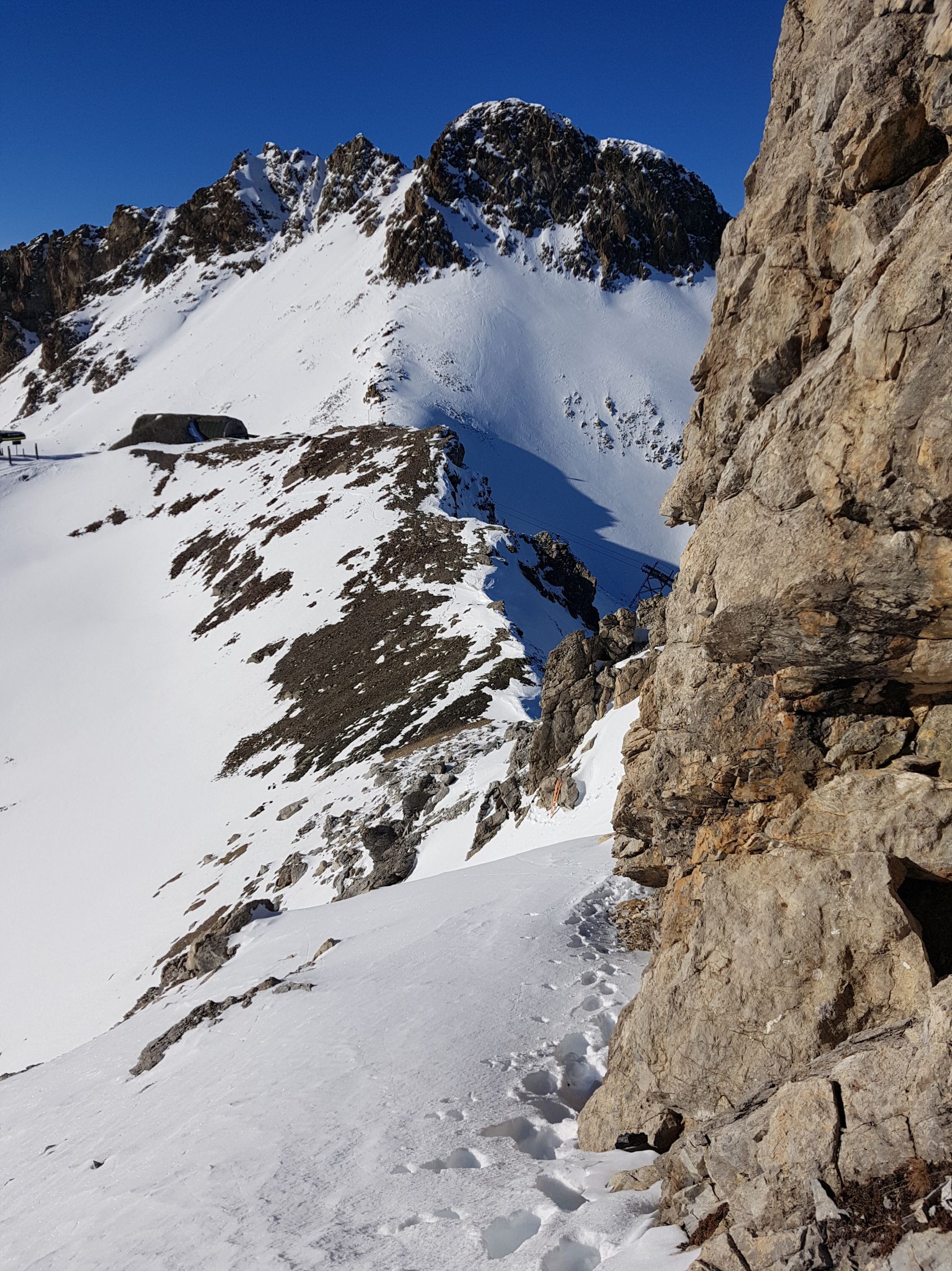 Nach einer kurzen Abfahrt und einen kleinen Fussaufstieg stehe ich schon 10 Minuten nach meinem Aufbruch vom Piz Nair auf dem Term da la Pêsch. Ich laufe ein paar Meter auf dem W-Grat hinab, nehme meine Felle ab und fahre die Traverse hinüber zur Fuorcla Schlattain (P2872) und klebe meine Felle nach nur 3 Minuten wieder an. Aufgrund der vielen herausragenden Steine würde hier eine Fellabfahrt die Felle zerschneiden. Dann doch lieber einen Kratzer mehr im Ski… Ich laufe die raue Piste hoch zur geschlossenen Bergstation des Sessellifts kurz vor der Fuorcla Grischa. Ich steige mit den Ski leicht absteigend den E-Grat des Piz Schlattain und mache Skidepot. Ich stampfe Knie- und Hüfttief, immer scharf unter den Felsen, wo ich mich bei einem Schneerutsch halten könnte, auf einen schrägen Felsband hoch und zuletzt über Kies und Schnee unschwierig via Vor- zum Hauptgipfel des Piz Schlattain mit Steinmann (I). Eine Abfahrt direkt vom Gipfel erschien mir heute nicht als vertretbar.