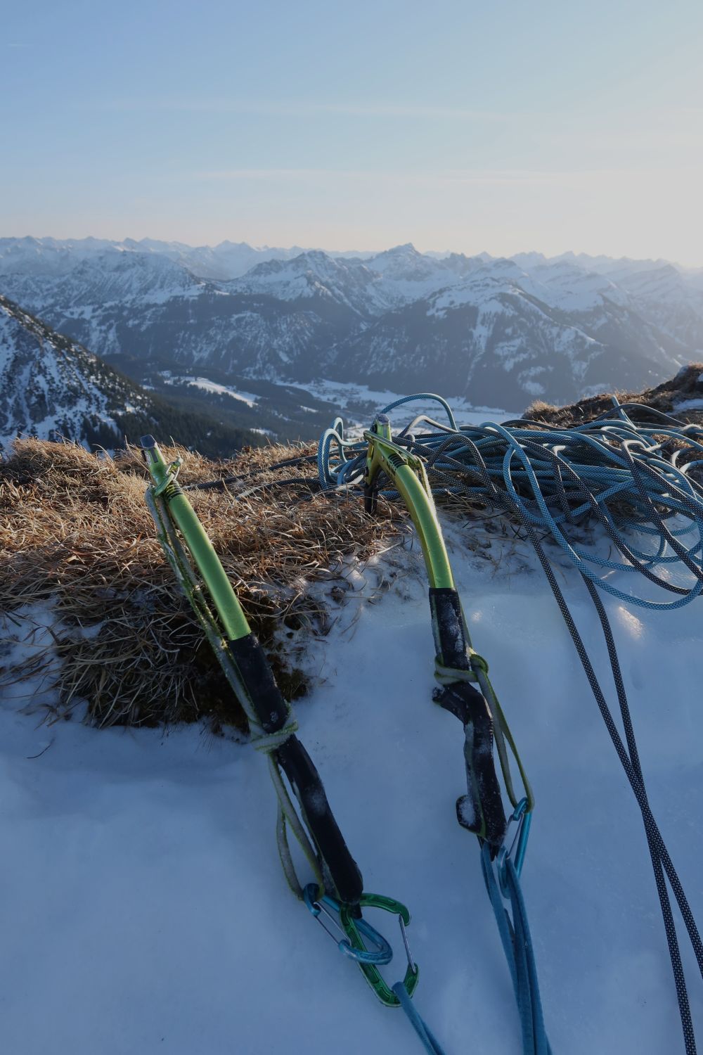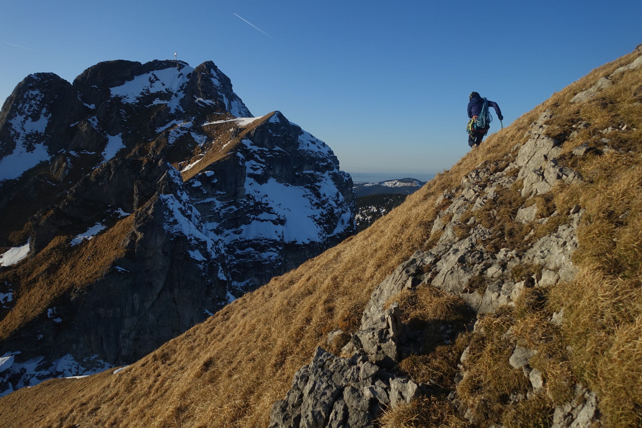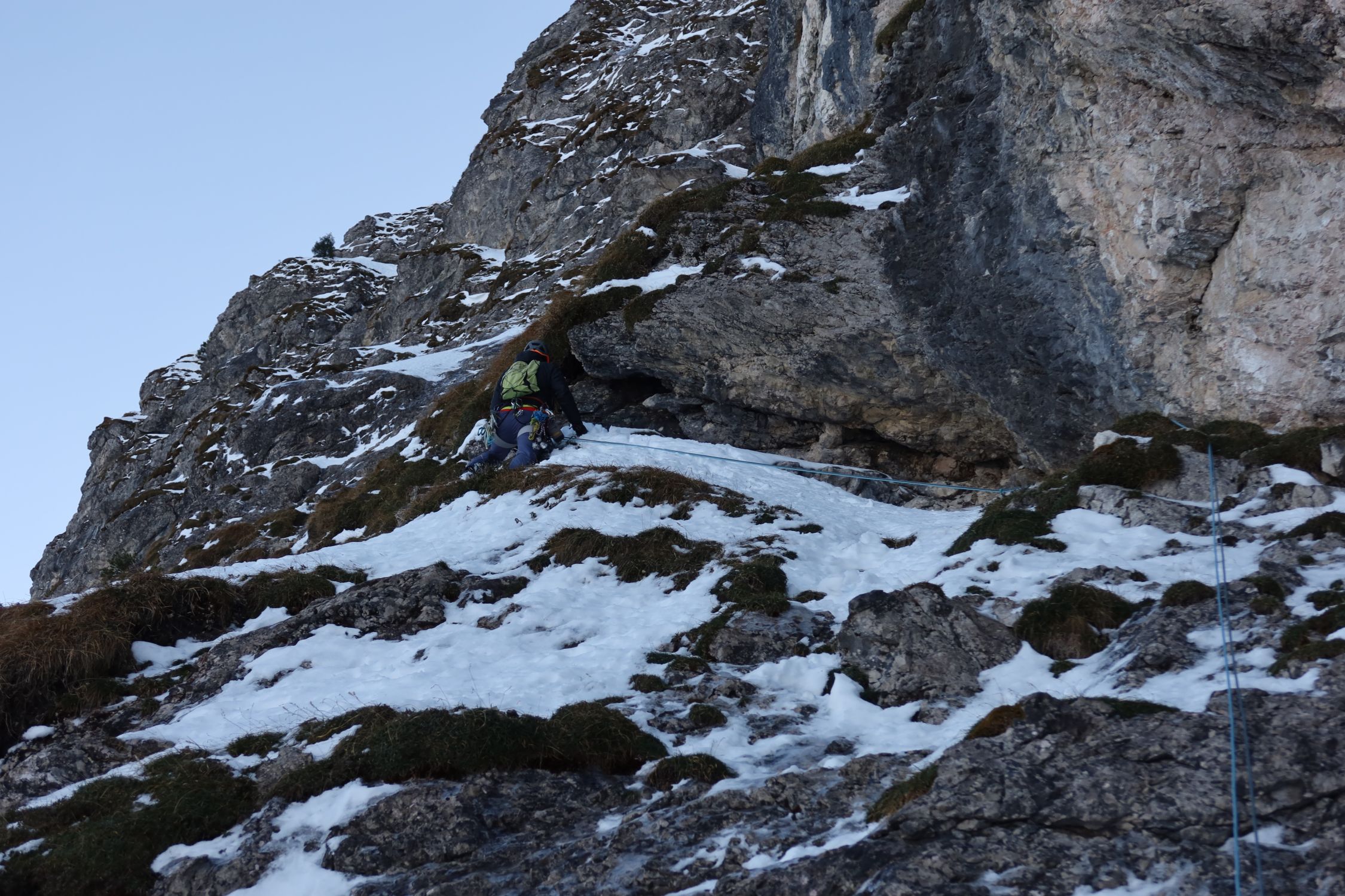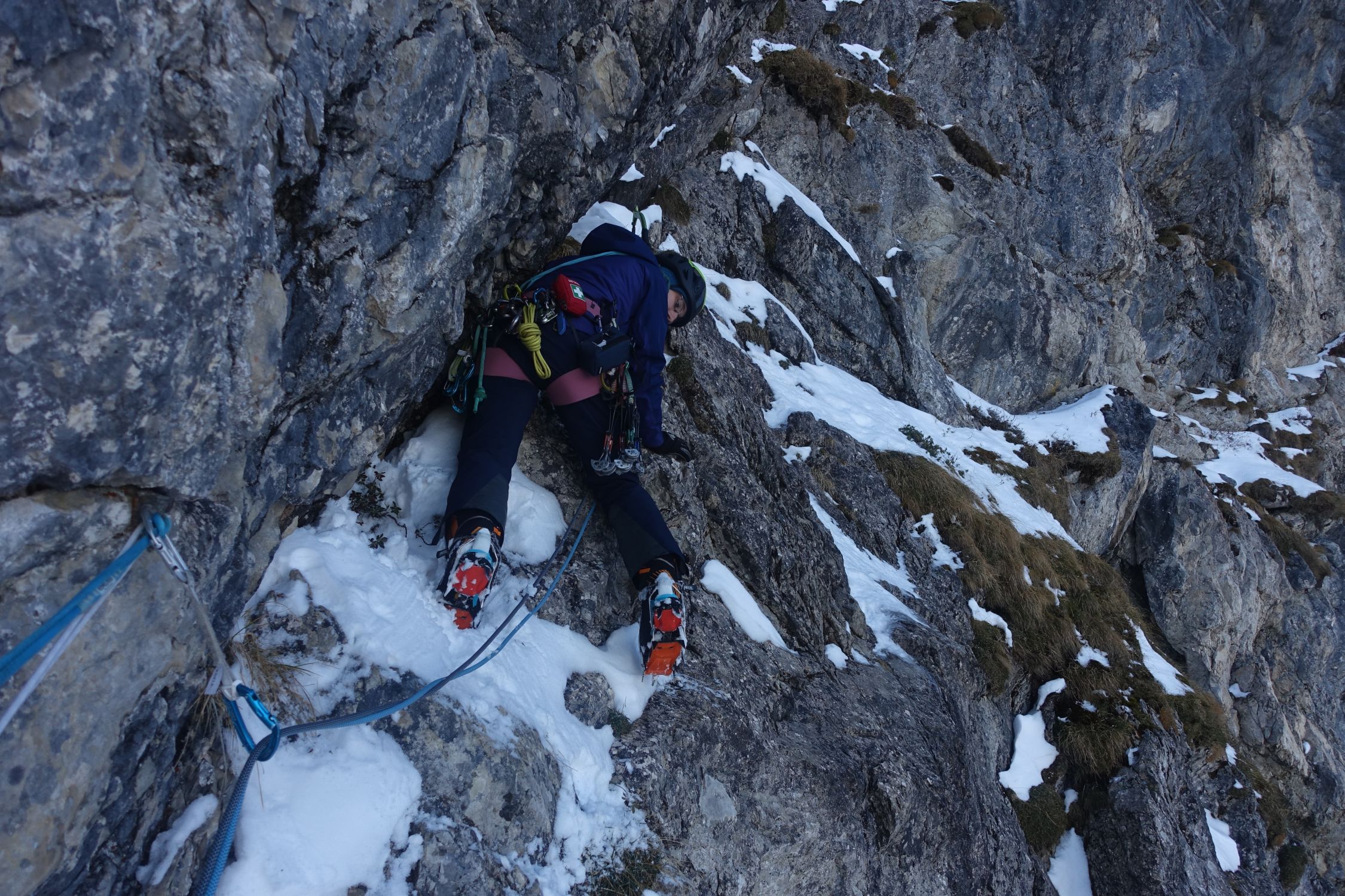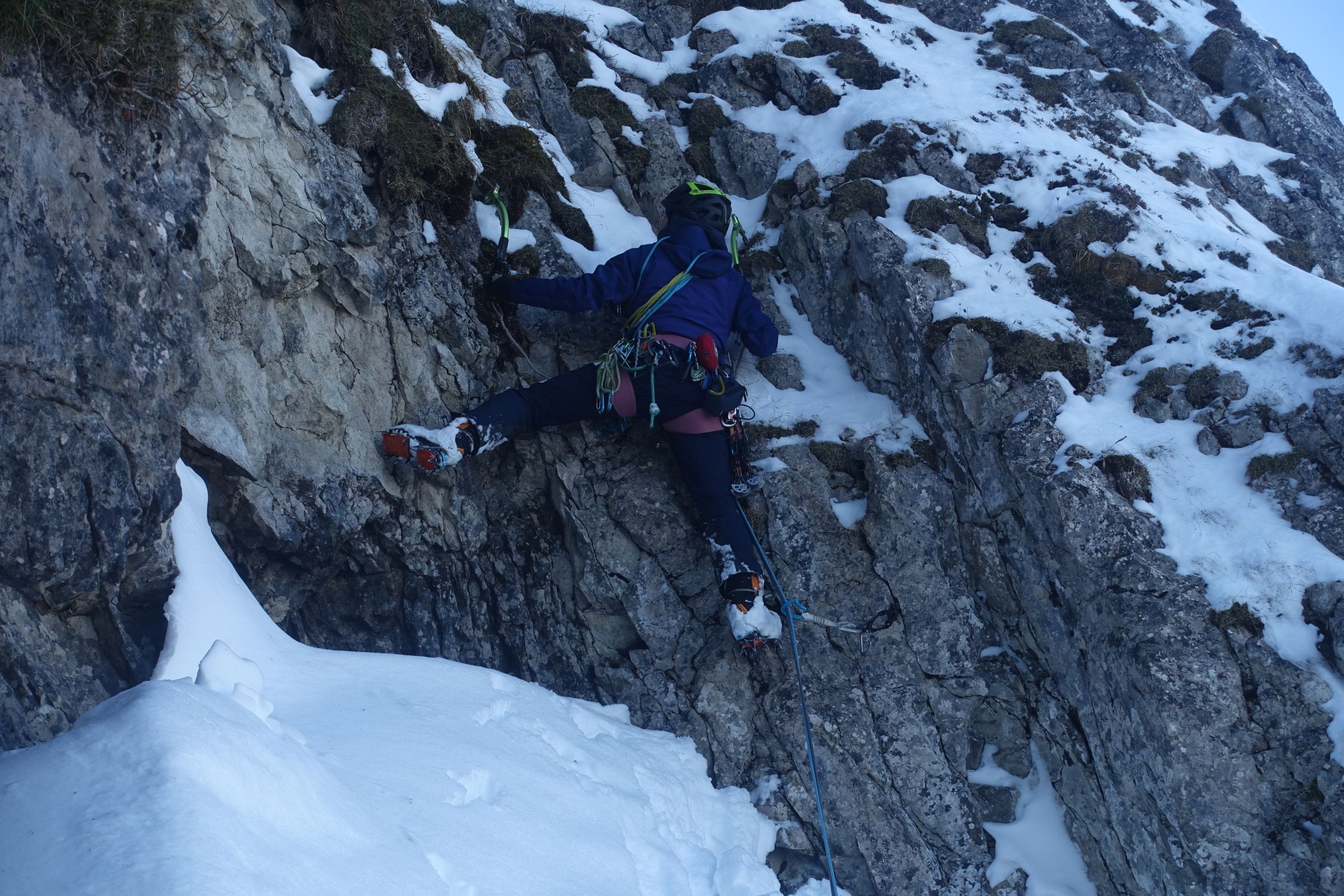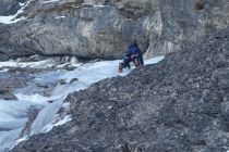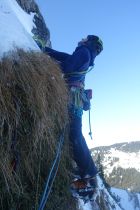 Wenig Schnee, ein gerade noch gut genug aufgebauter Eisfall und ordentlich durchgefrorenes Gras machten die Kletterei zum Genuss. Insgesamt aufgrund der spärlichen Absicherung aber doch wieder fordernd. Zwei ähnliche Touren und doch ganz verschieden. Auf jeden Fall eine tolle Winterkletterei, die im Gedächtnis bleibt. Eigentlich keine Hochtour, sondern eine Mixedtour, aber diese Rubrik gibt's leider nicht (mehr).