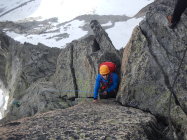 Ehemals als schönste 3 der Schweiz bezeichnet, dürfte sie heute zu den Top20 der schönsten alpinen 5er-Plaisirrouten der Schweiz gehören. Das liegt zum einen an der Sanierung (Absicherung jetzt als gut zu bezeichnen) und dadurch leicht begradigtem Verlauf in durchgehend kompaktem Superfels, sicherlich aber auch an einer inzwischen realistischen Bewertung: Im neuen Topo (s. Internet) mit 4 SL im 5.Grad. Die steile Rissverschneidung ist auch als V nicht geschenkt. Hier darf im Riss mit Faust und Schuhen geklemmt werden, gute Griffe sind eher die Ausnahme, lässt sich auch nur stellenweise als Verschneidung klettern. Die anderen Ver-SL sind leichter. Der aktuelle Plaisir Ost führt allerdings noch die alten Bewertungen.