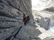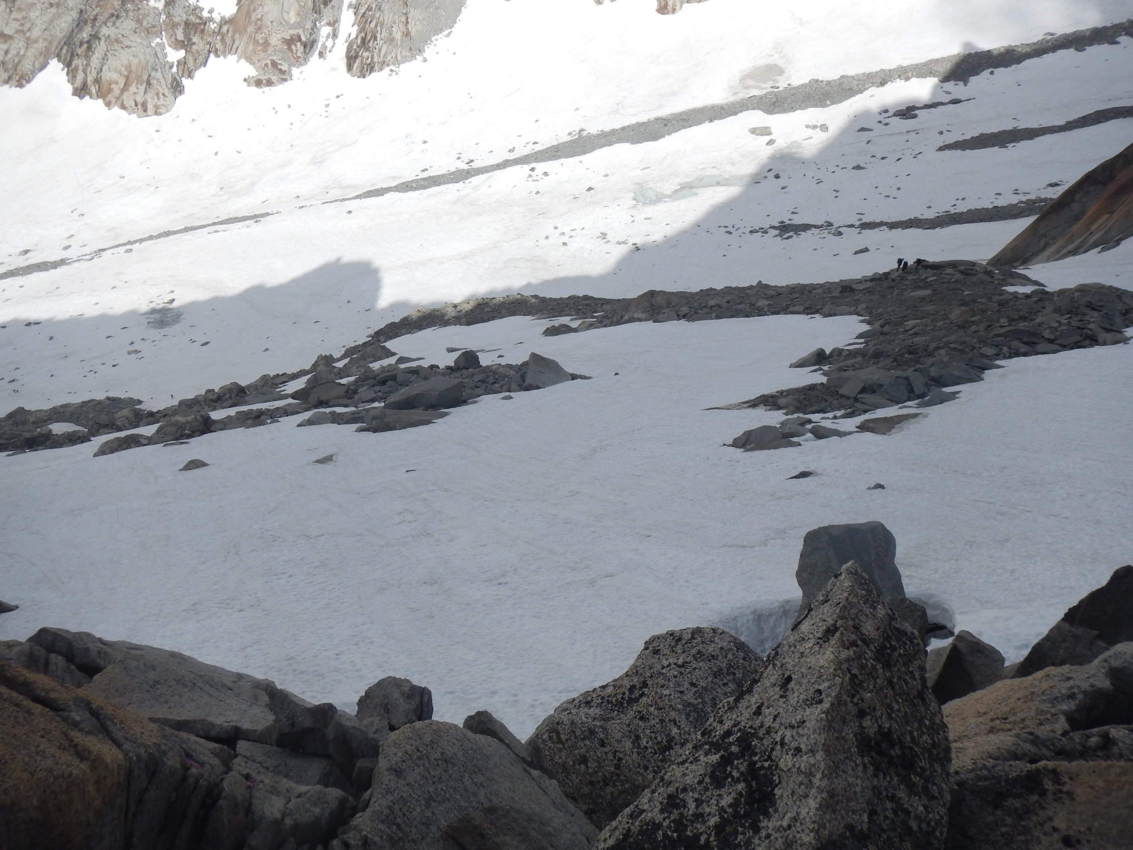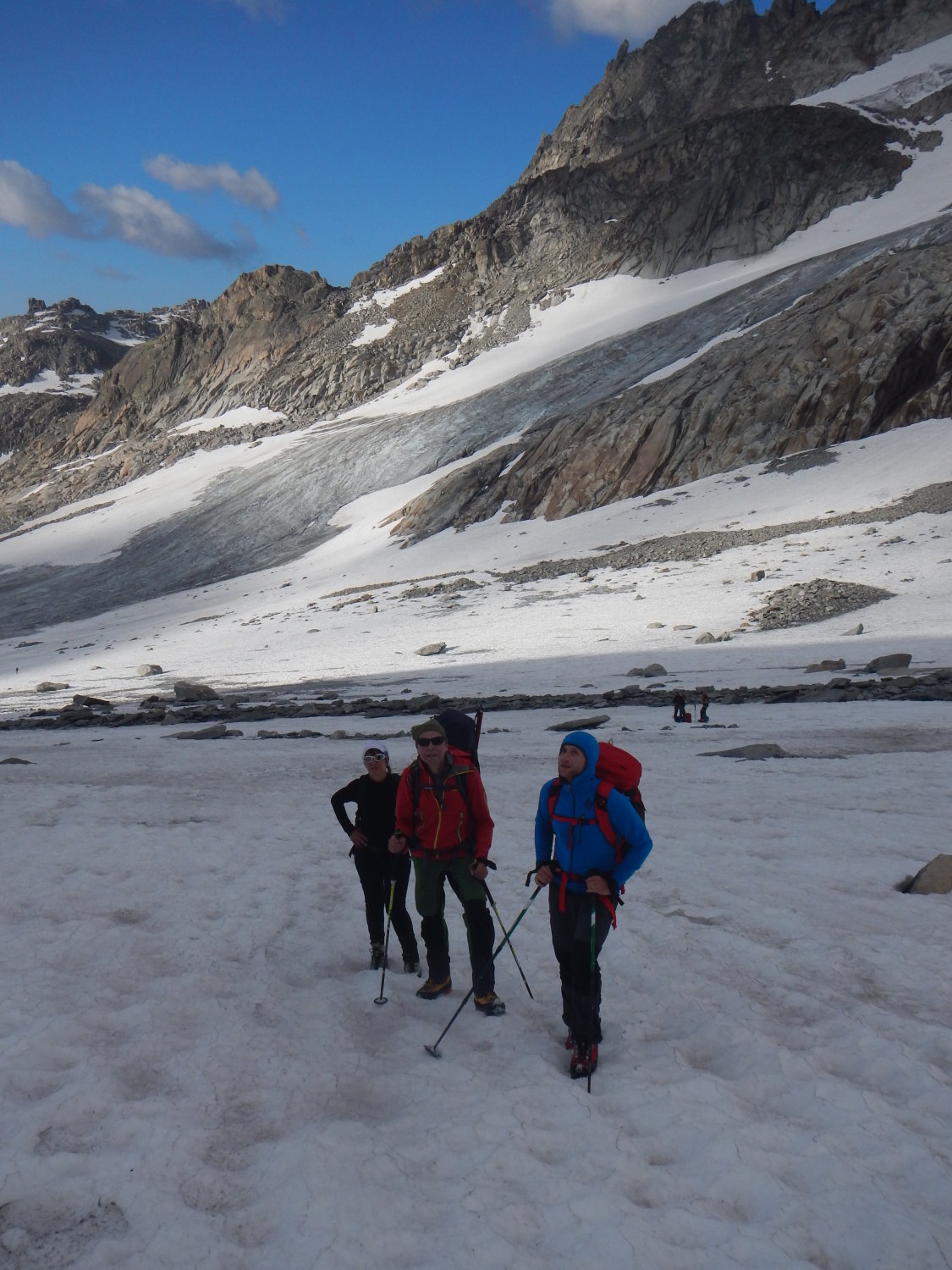 Zustieg problemlos. Gletscher mit Firn bedeckt, geht gut, ohne tiefes Einsinken. Firnflacke am Morgen hart, Pickel von Vorteil, geht aber auch rechts im Fels gut und dann ohne Steigeisen möglich.